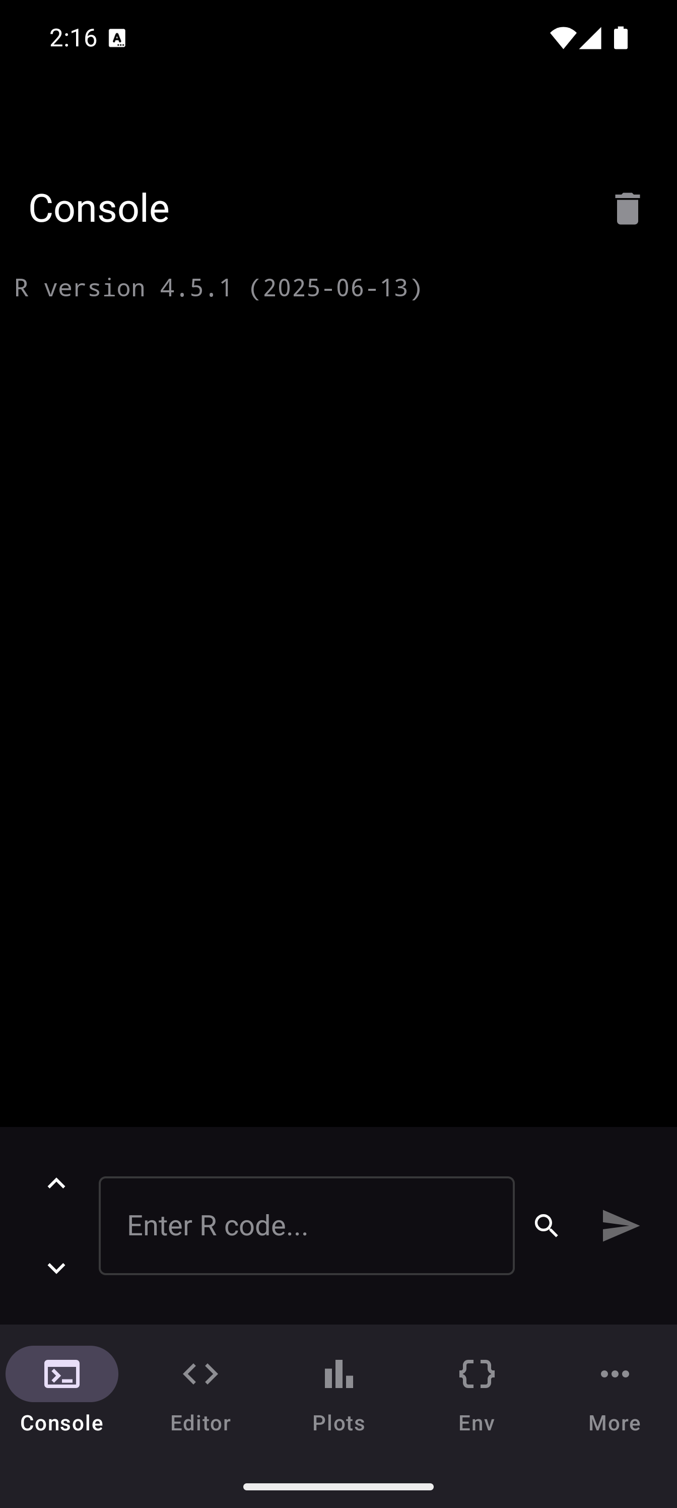 After the runtime loads, you land on the Console tab. The screen is empty except for an input field at the bottom with the placeholder text “Enter R code…” and a blue play button.