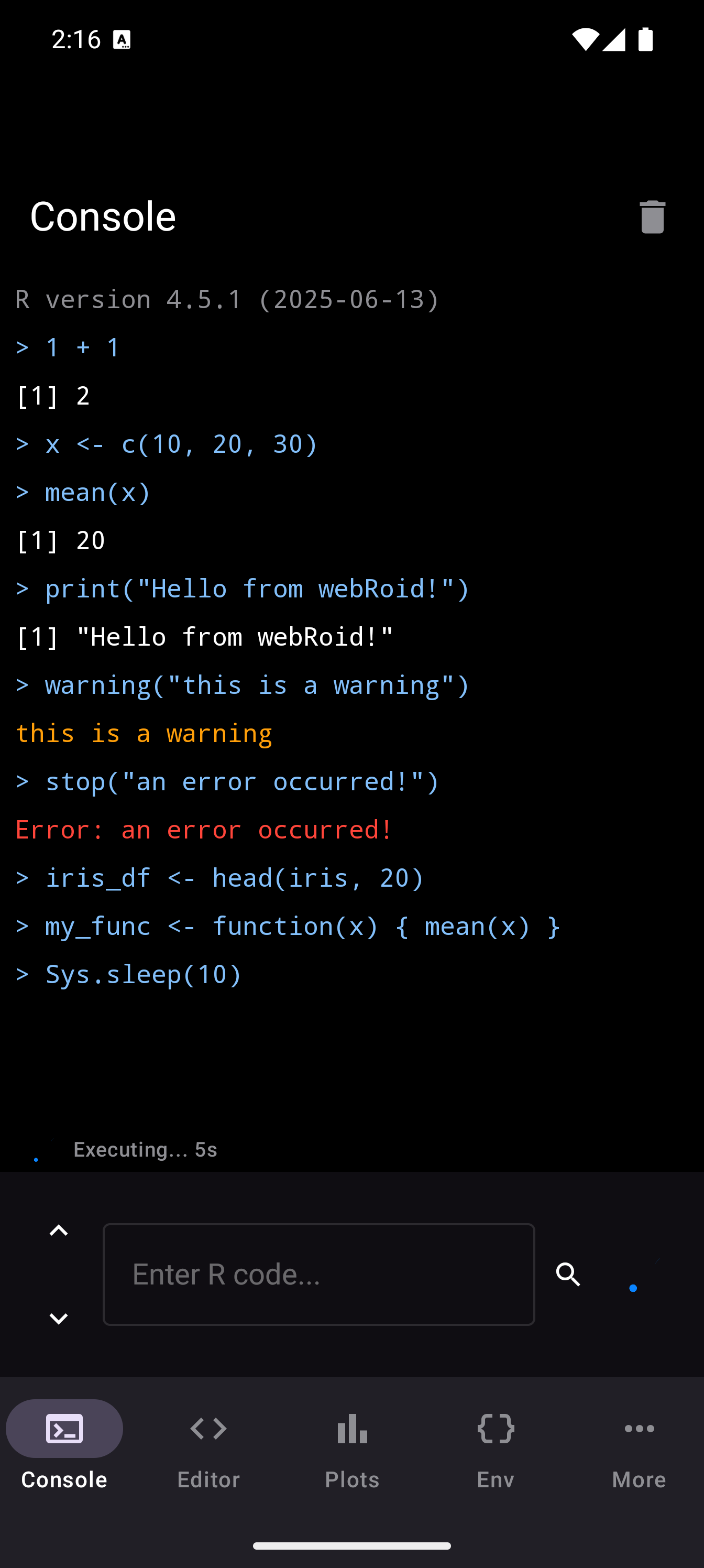 webRoid is a native Android app that brings a nearly full-featured R environment to your phone or tablet. It uses webR, a port of R compiled to WebAssembly, so everything runs locally on your device. No server, no internet connection required after install, no accounts to create. You get an interactive R console, a code editor, plotting, environment inspection, file management, and package installation, all in a single app.