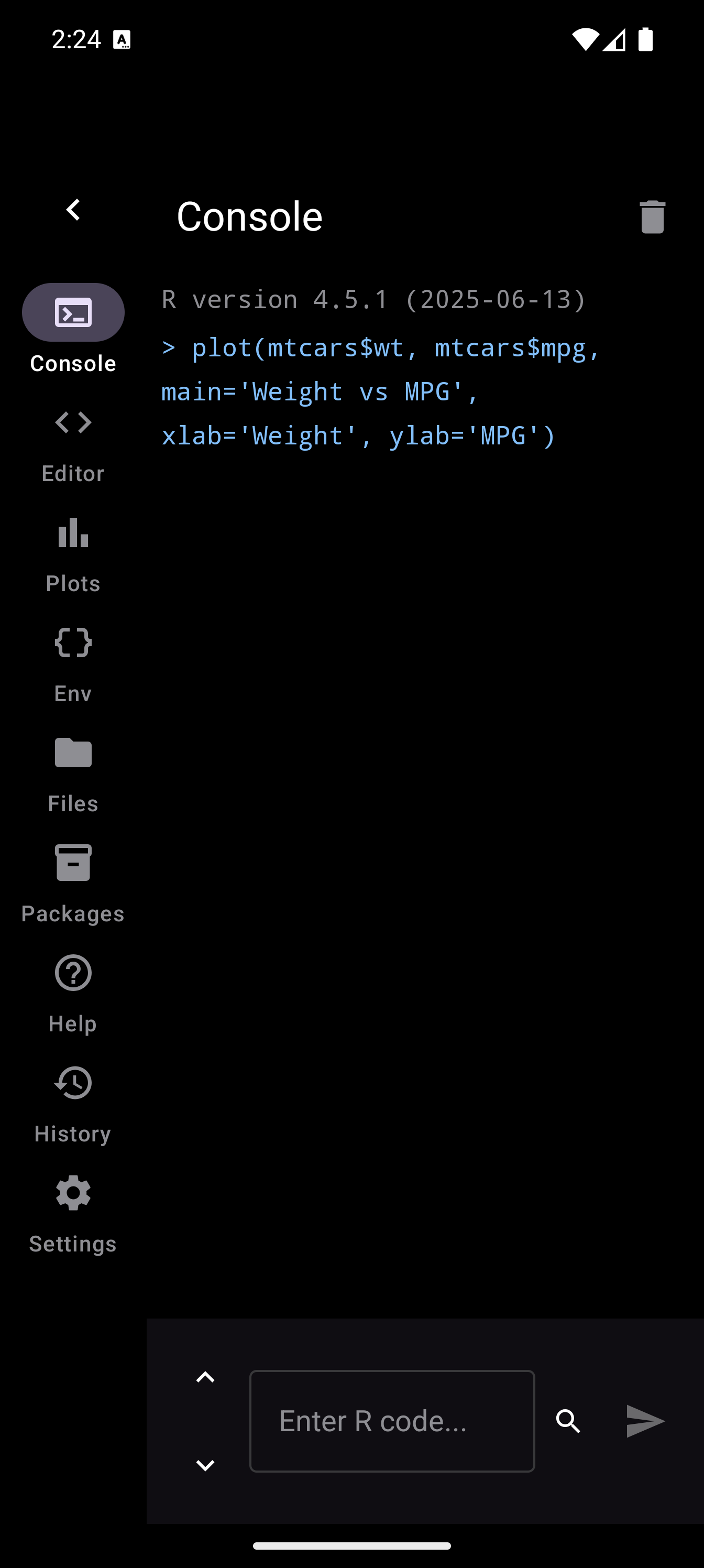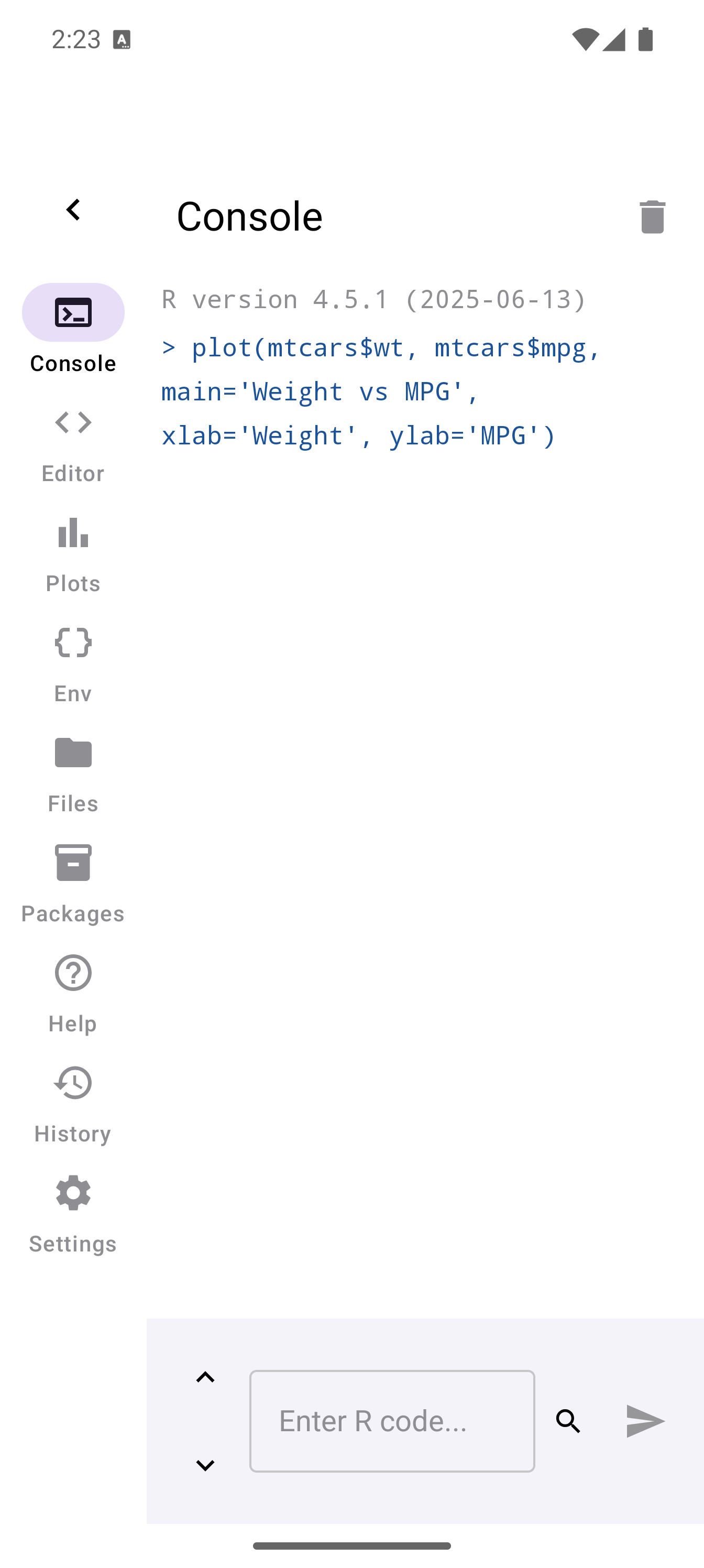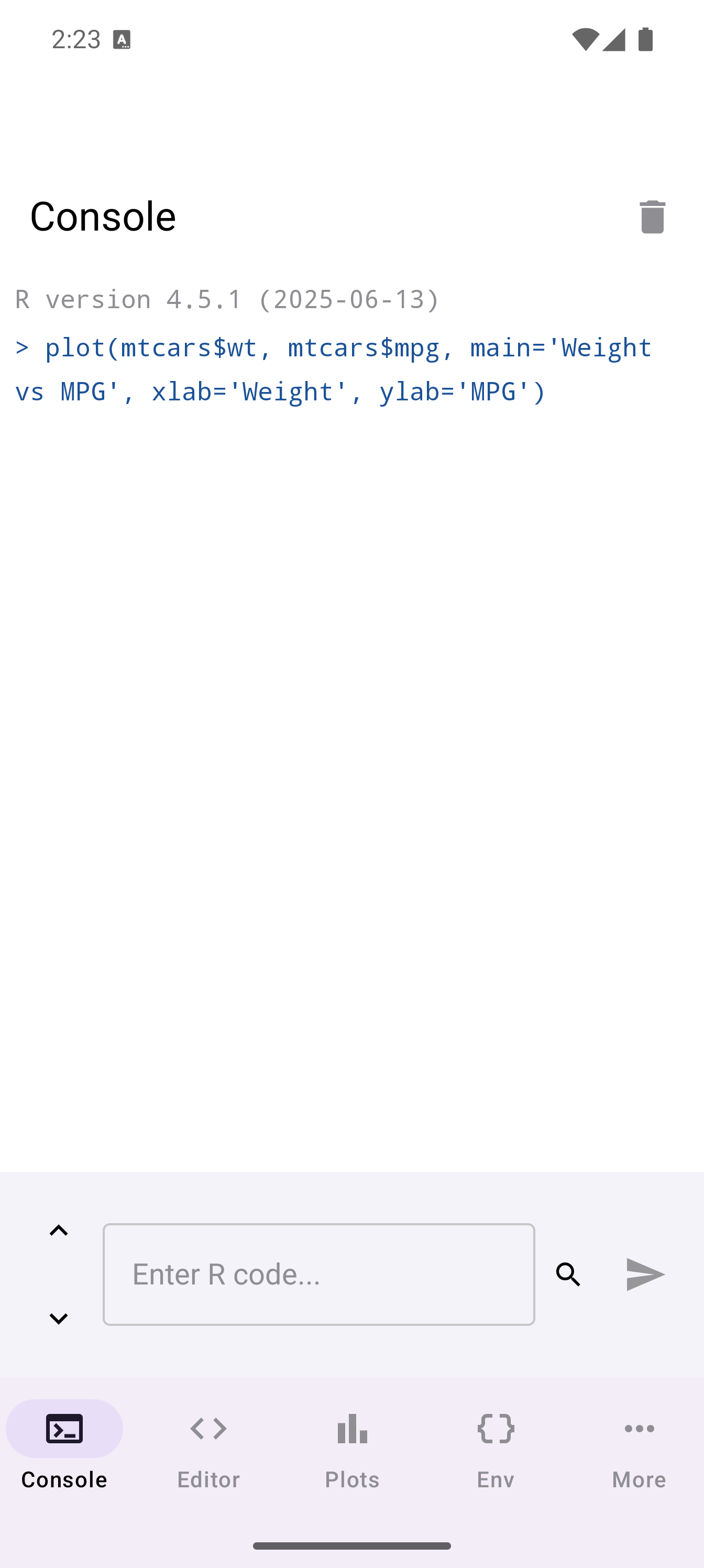 plot(mtcars$wt, mtcars$mpg, main = "Weight vs MPG", xlab = "Weight", ylab = "MPG")When a plot is generated, a badge appears on the Plots tab icon in the bottom navigation bar showing how many unseen plots are waiting. Tap the Plots tab to see your plot in the gallery.