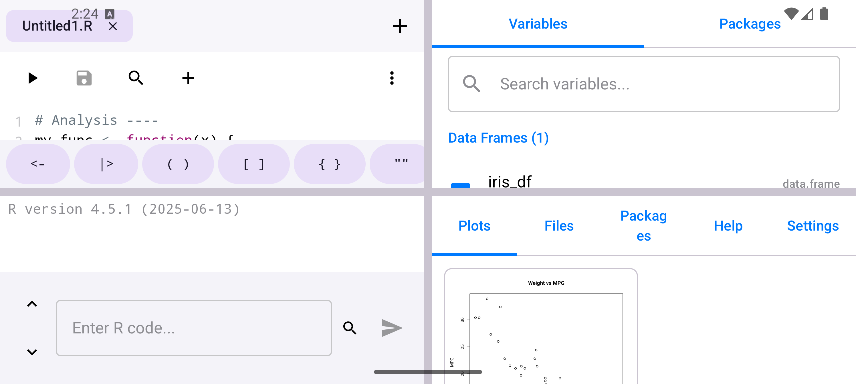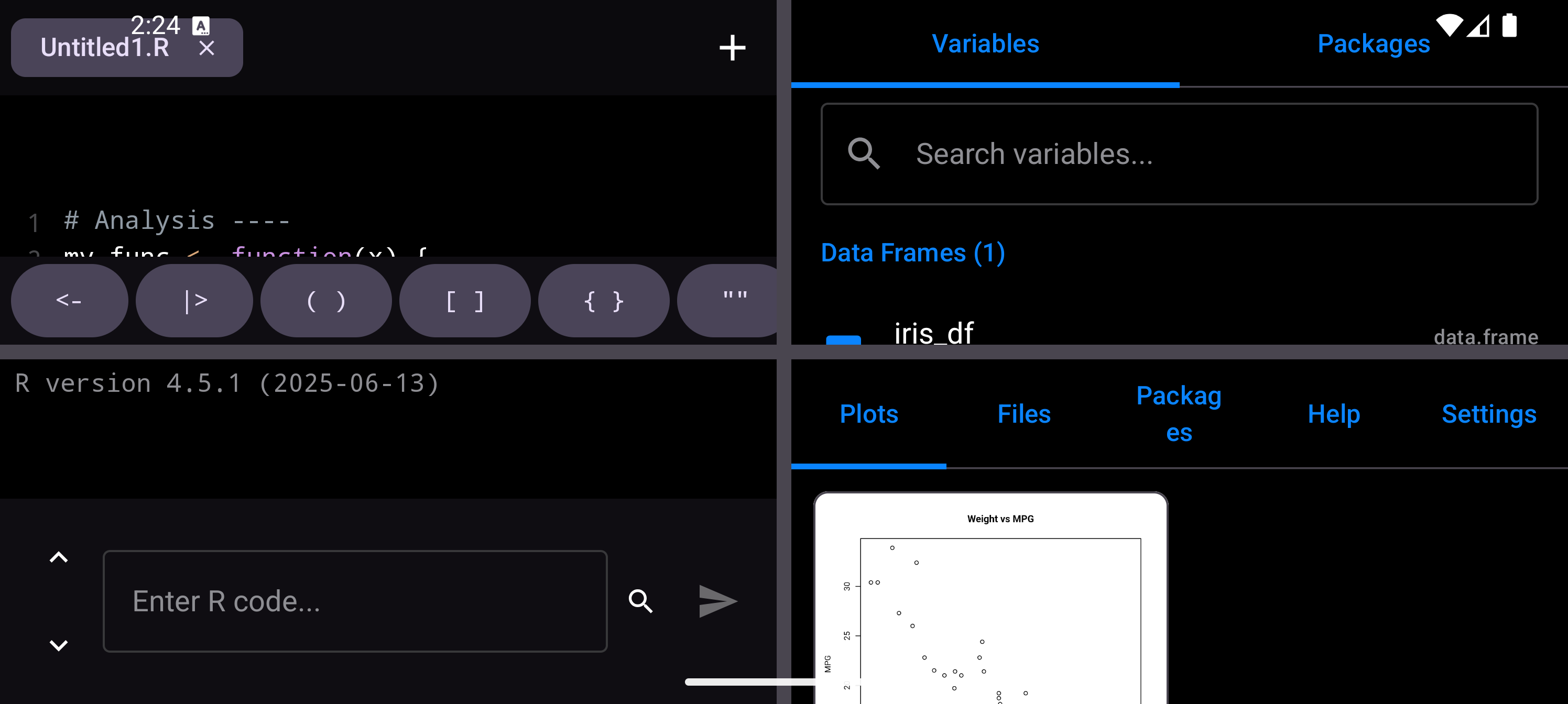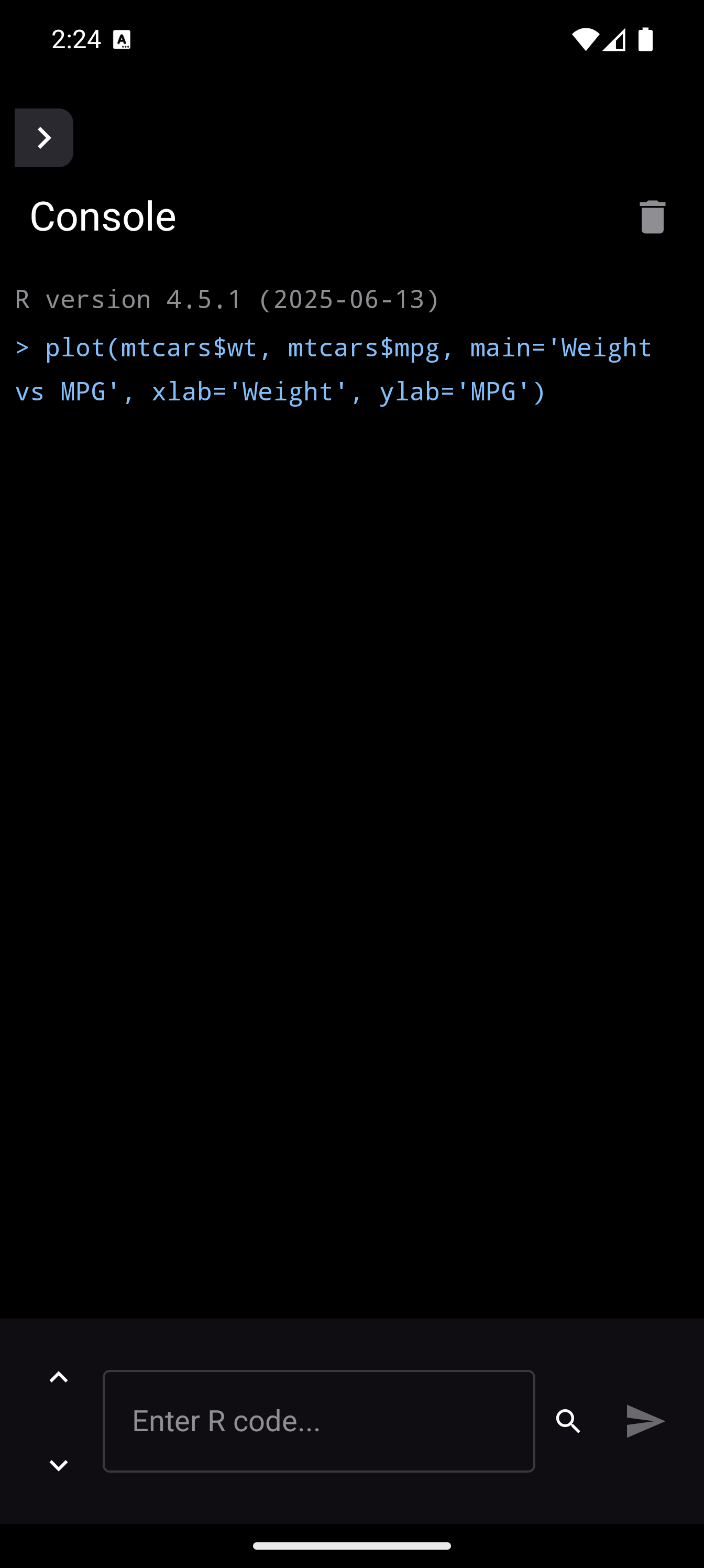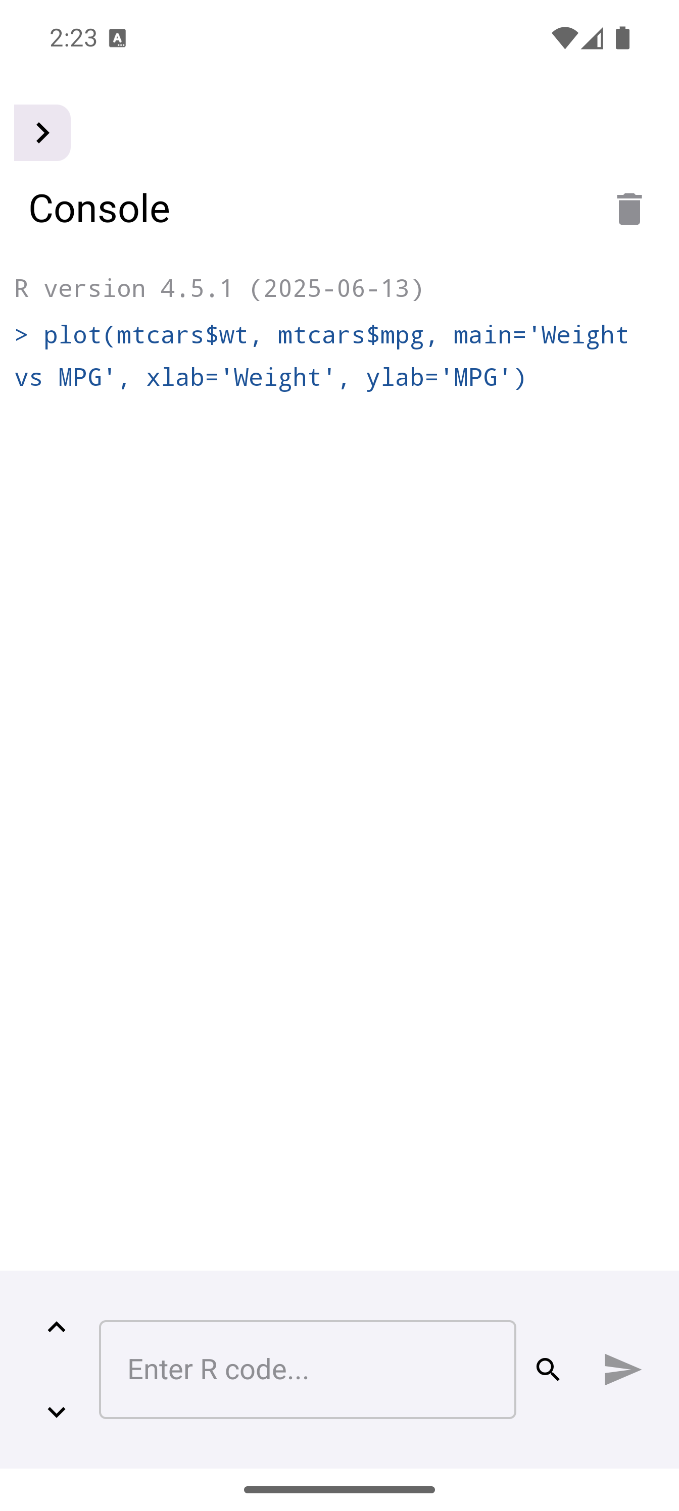 plot(mtcars$wt, mtcars$mpg, main = "Weight vs MPG", xlab = "Weight", ylab = "MPG")When a plot is generated, a badge appears on the Plots tab icon in the bottom navigation bar showing how many unseen plots are waiting. Tap the Plots tab to see your plot in the gallery.