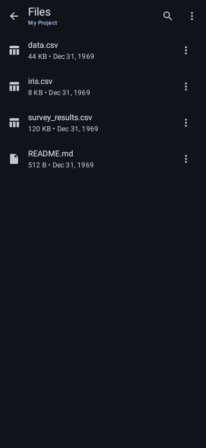 - The Android file picker opens, filtered to common data file types (CSV, TSV, Excel, plain text)