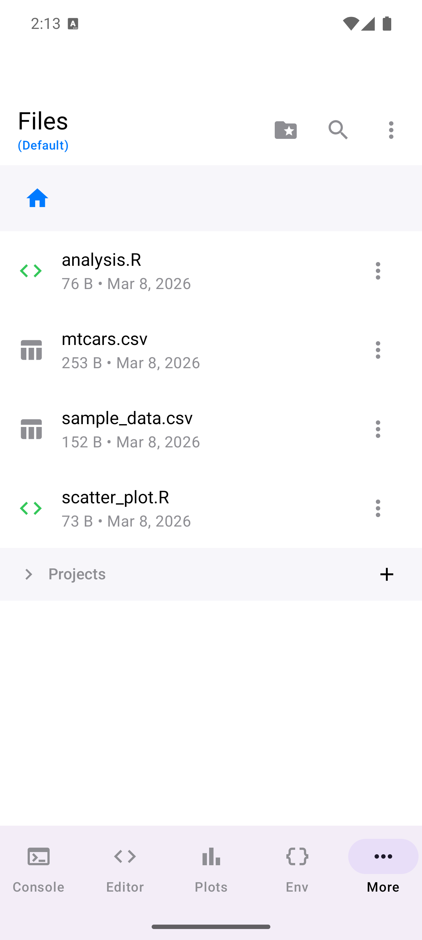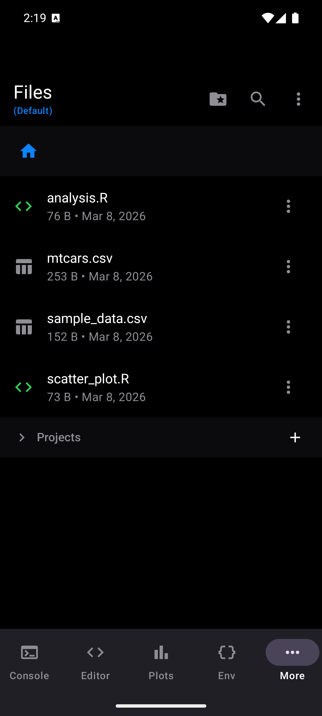 Tapping a text-based file (.R, .txt, .csv, .json, .md) opens it in the Editor. Tapping a folder navigates into it.