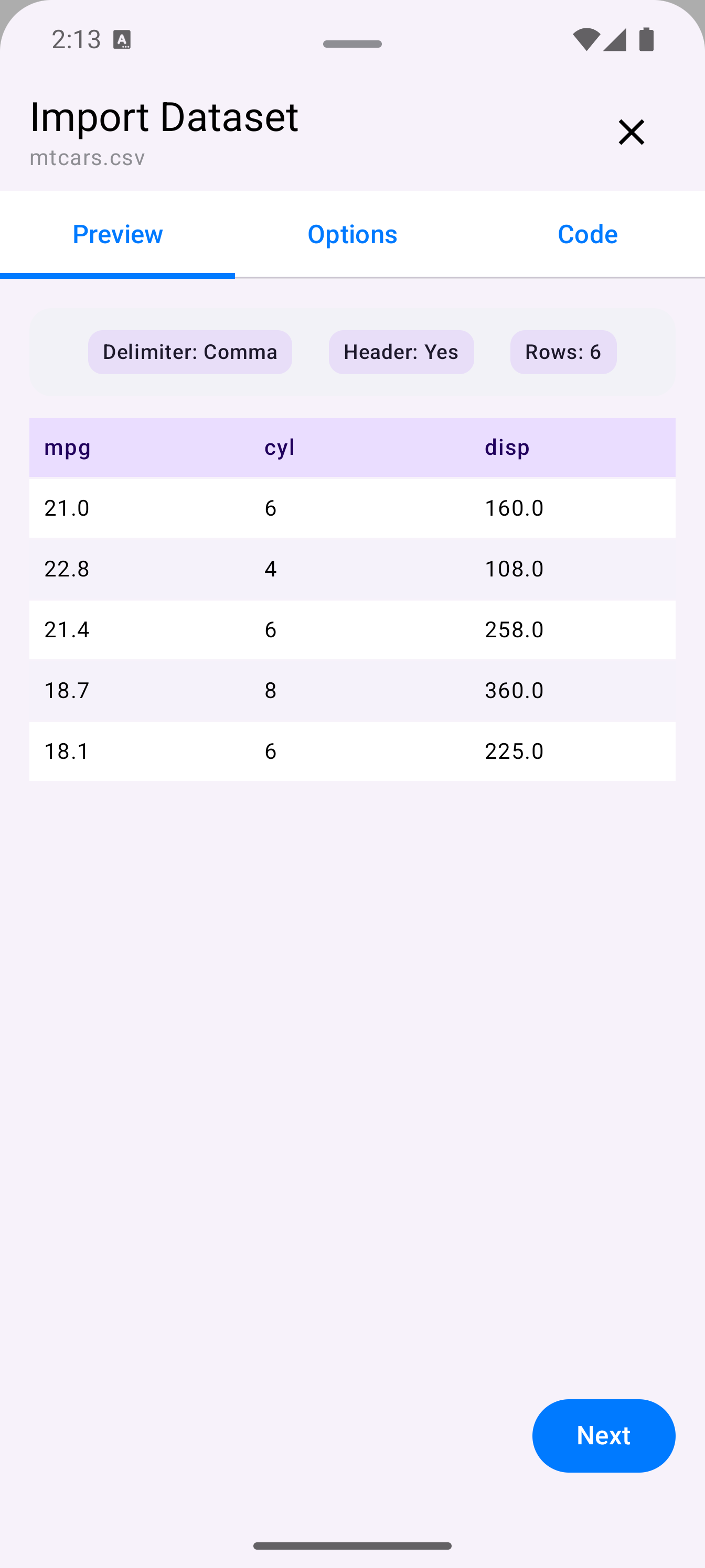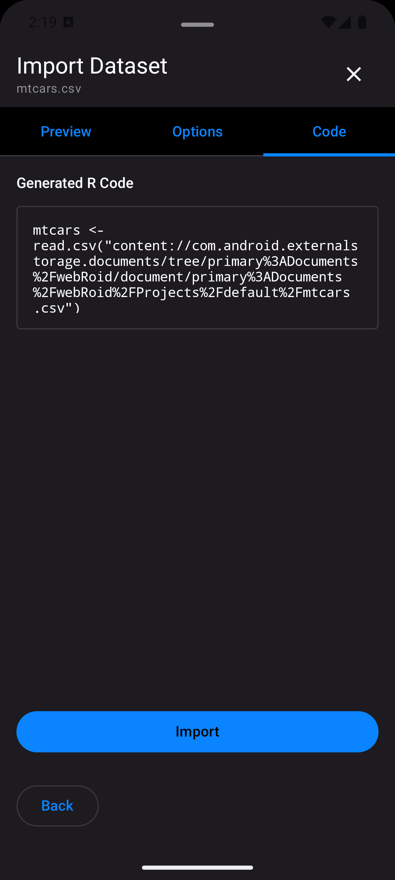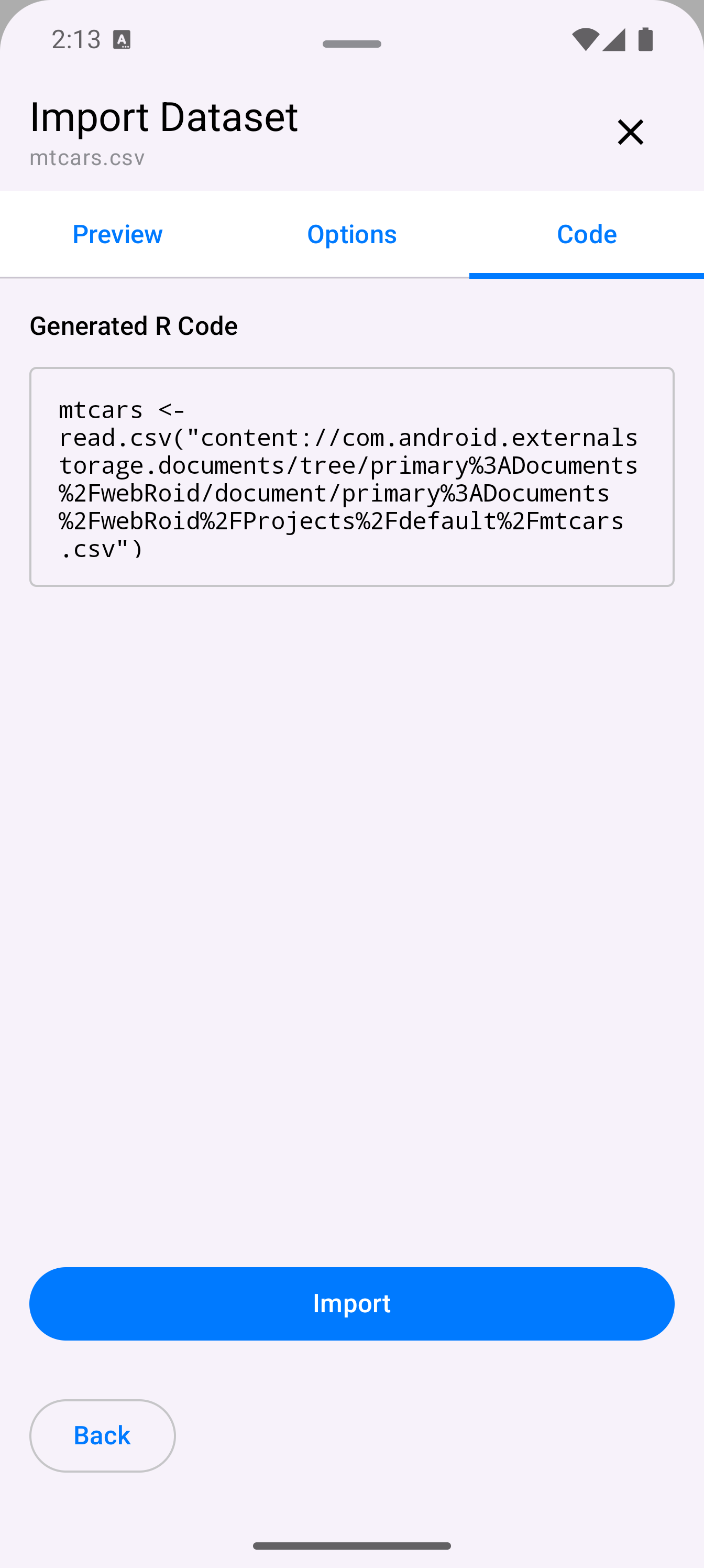 read.csv()orread.delim()call). You can edit the code directly before running it. Tap Import to execute the code and load the data into your R session.