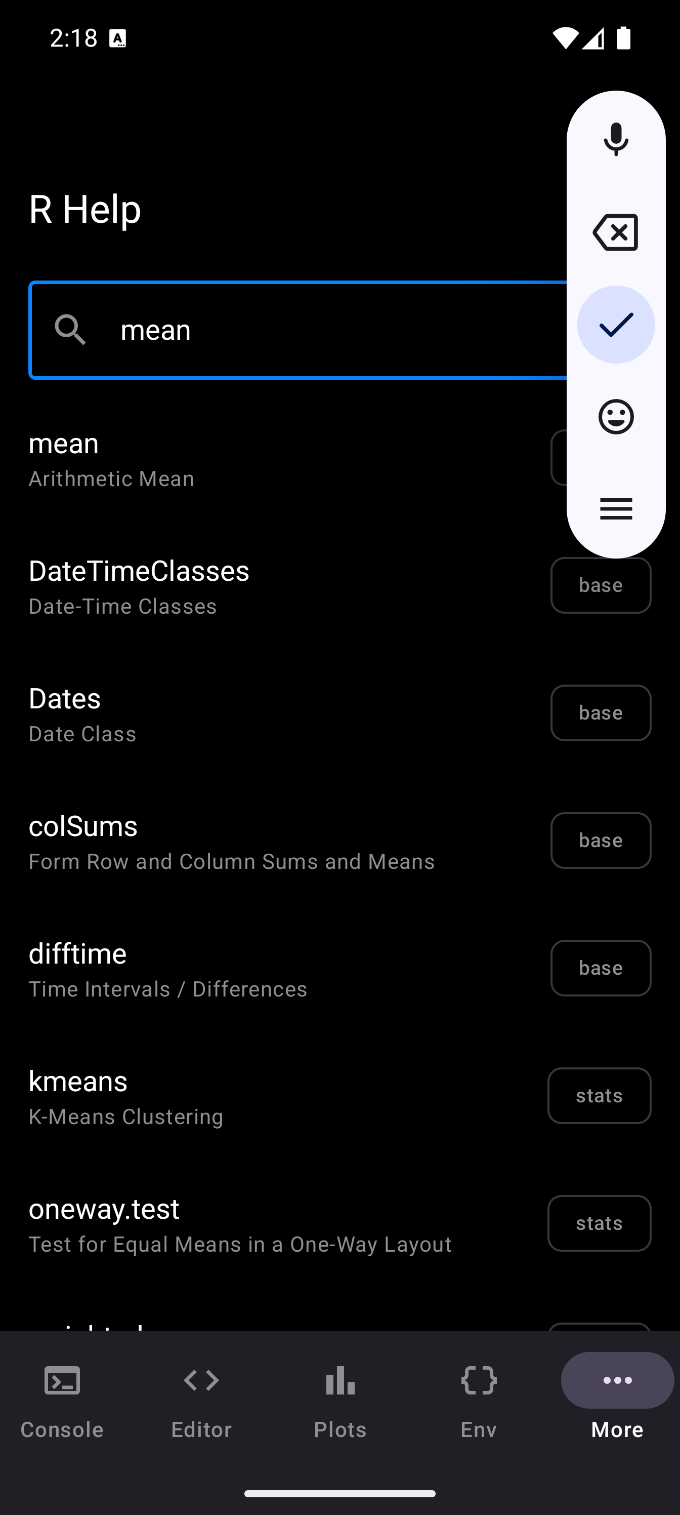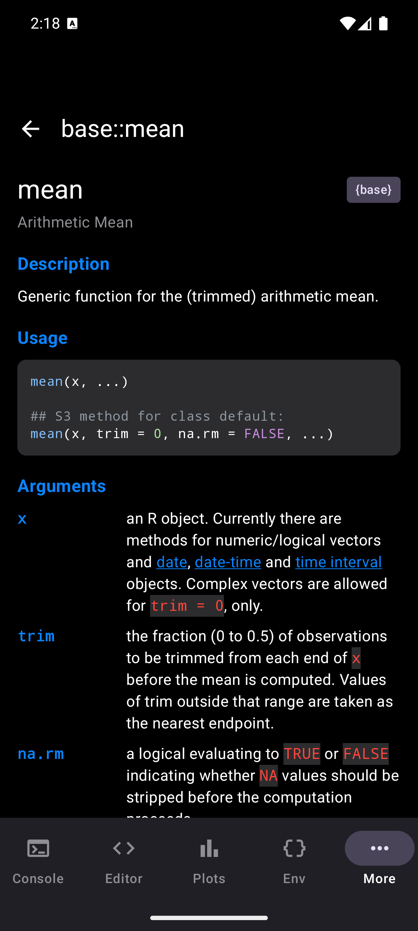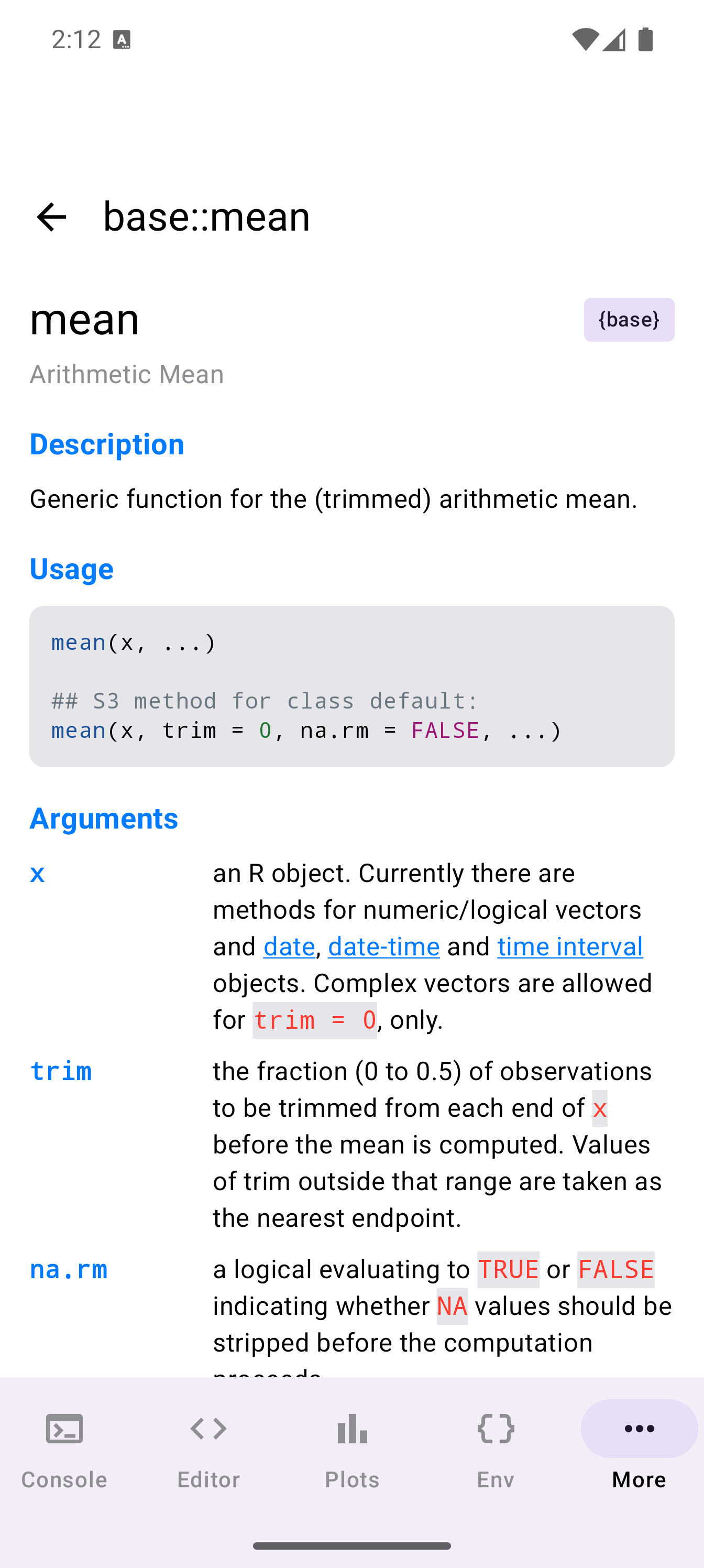 - Detail view: opens when you select a search result. Displays the full help page for a function or topic. The toolbar title changes to show the current topic (e.g., “base::mean”), and a back arrow lets you return to the search view.