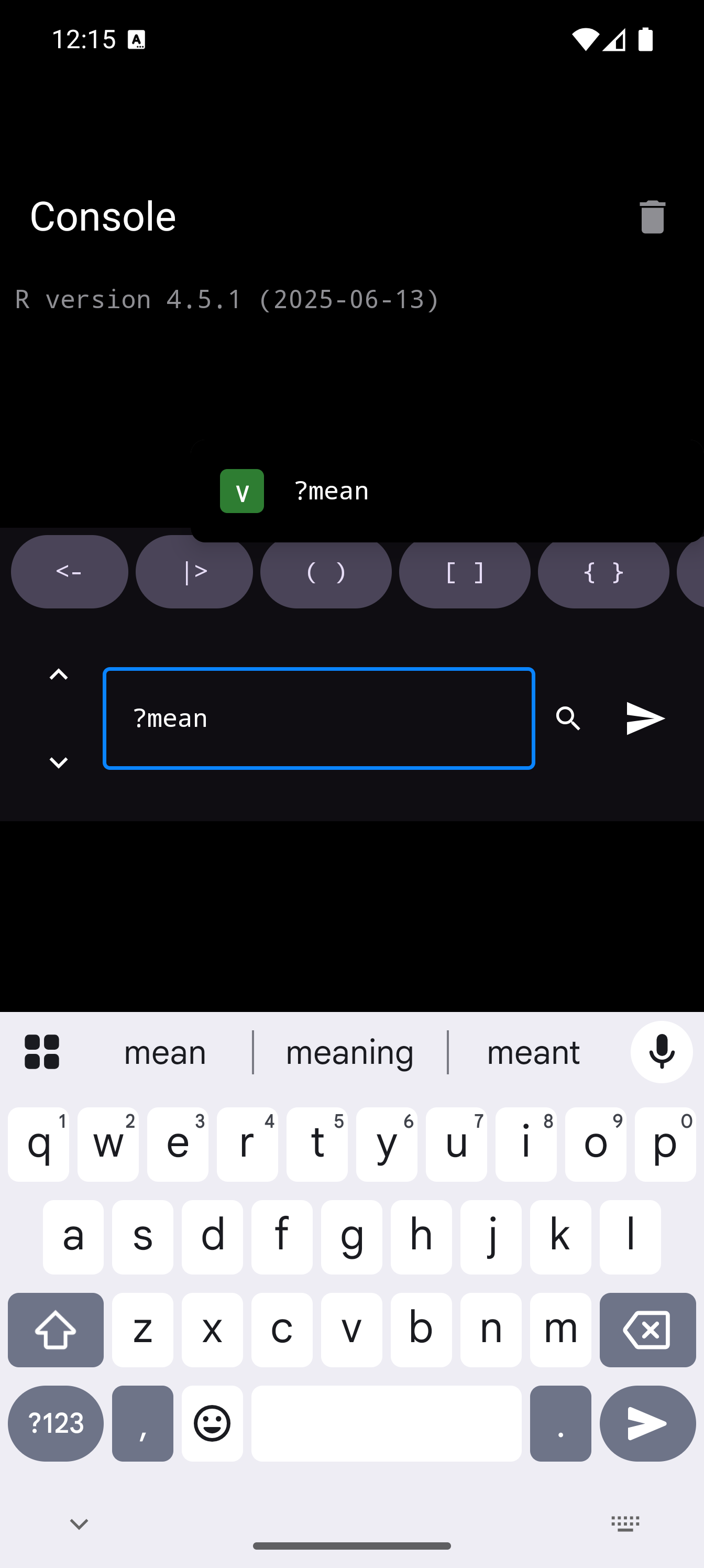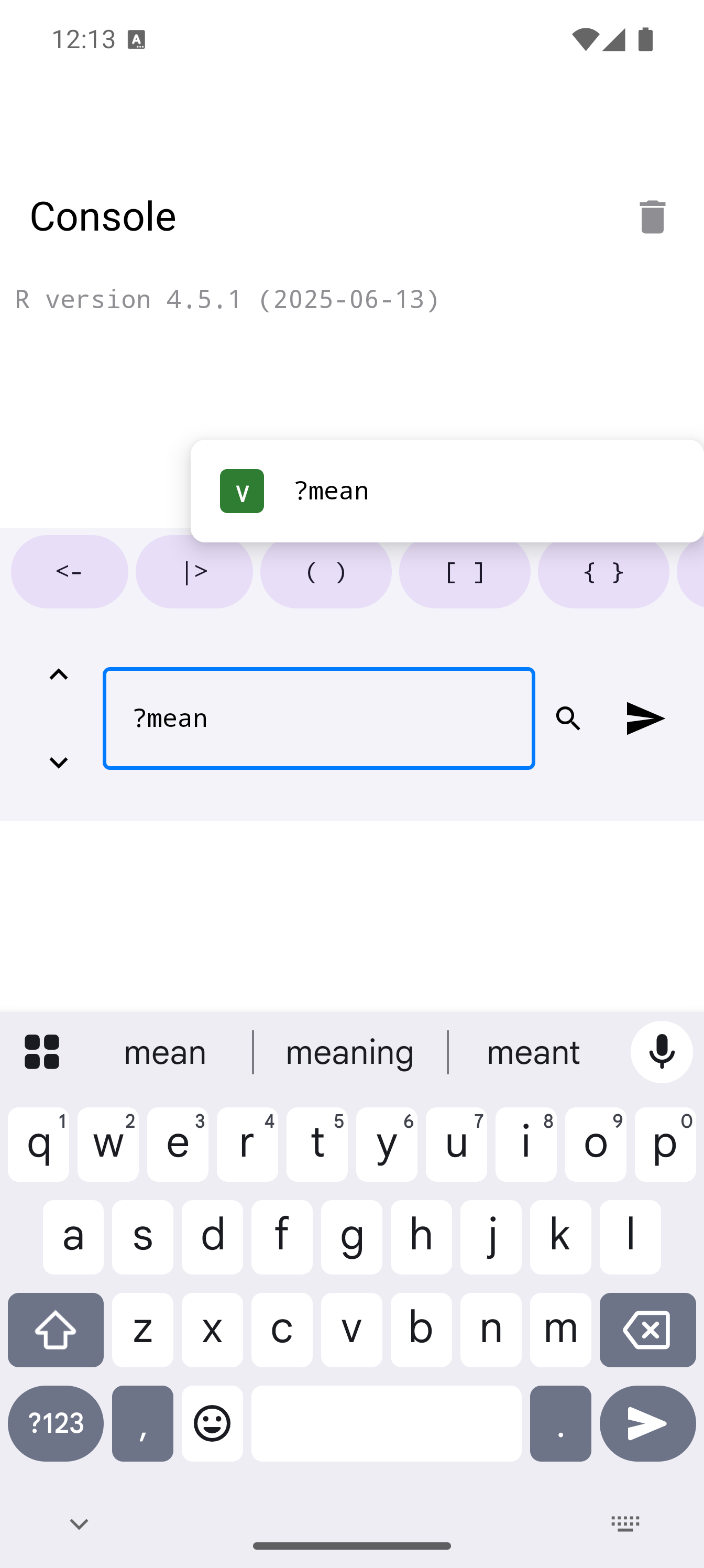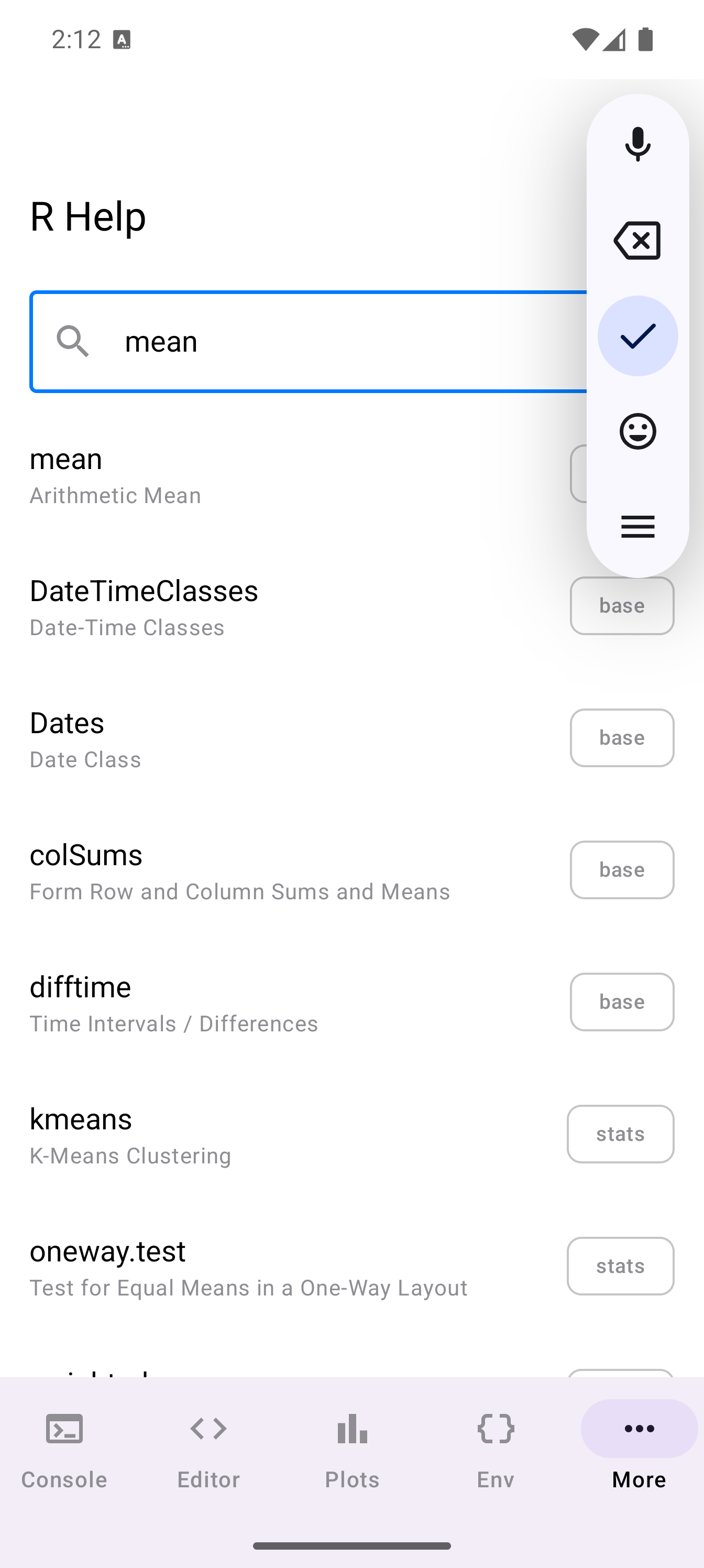 - Detail view: opens when you select a search result. Displays the full help page for a function or topic. The toolbar title changes to show the current topic (e.g., “base::mean”), and a back arrow lets you return to the search view.