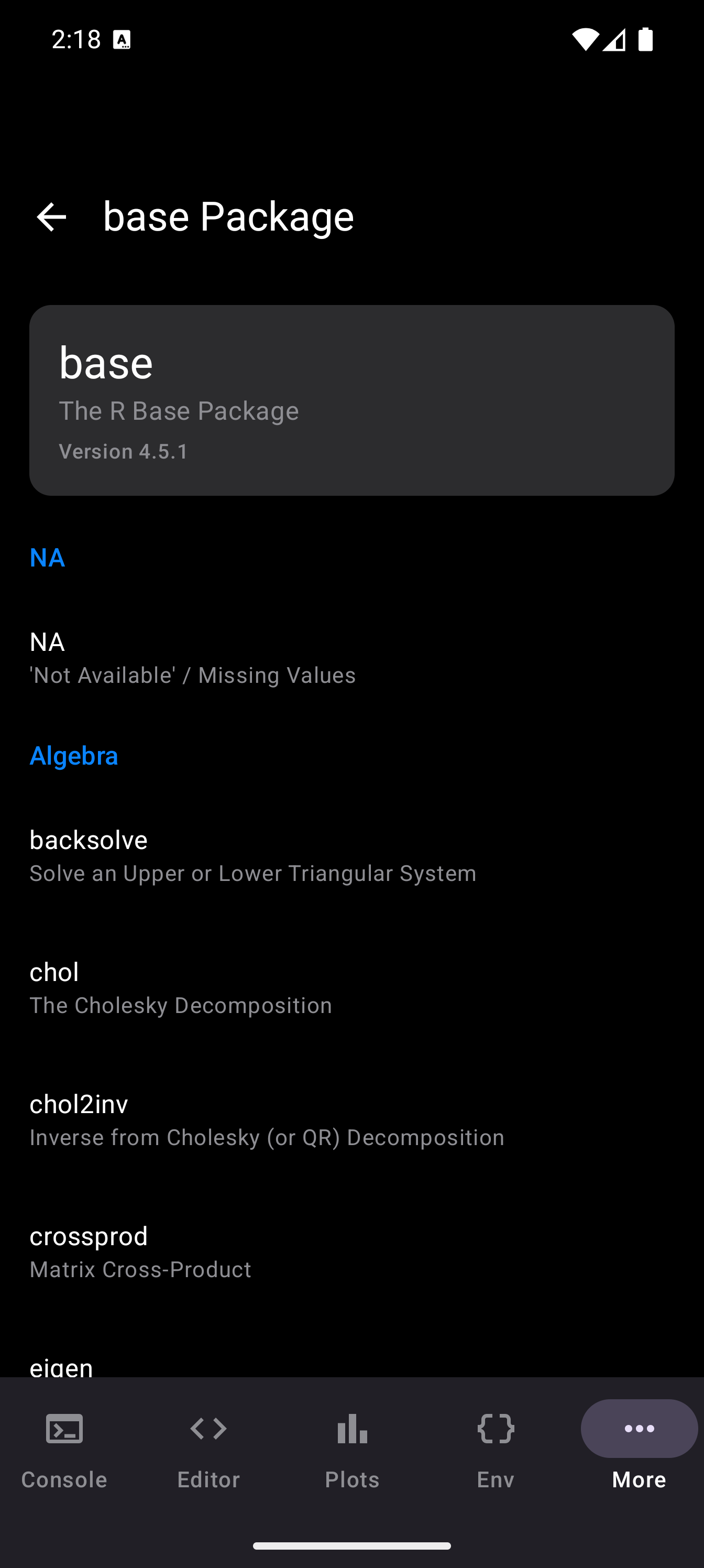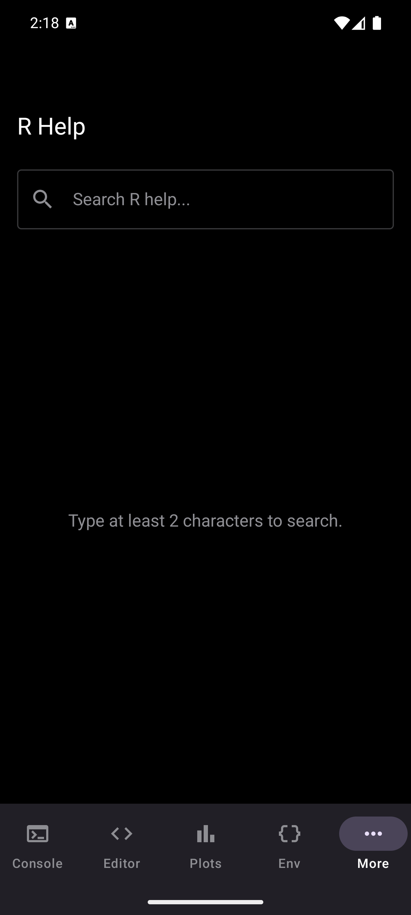 R ships with extensive documentation for every function in base R and for every function in installed packages. The Help screen in webRoid provides a native interface to this documentation. Help pages are parsed from R’s internal RdXML format and rendered natively as styled text, so they look clean and are easy to read on a mobile screen.