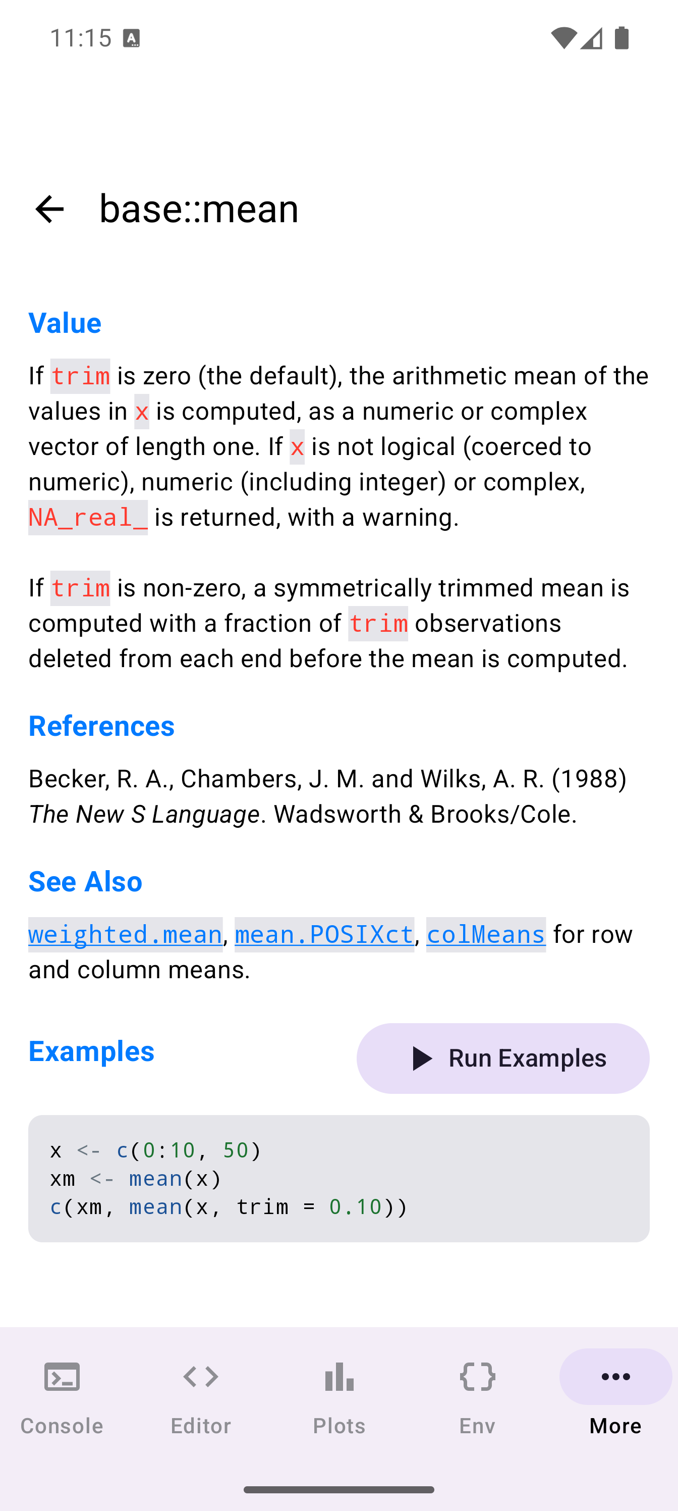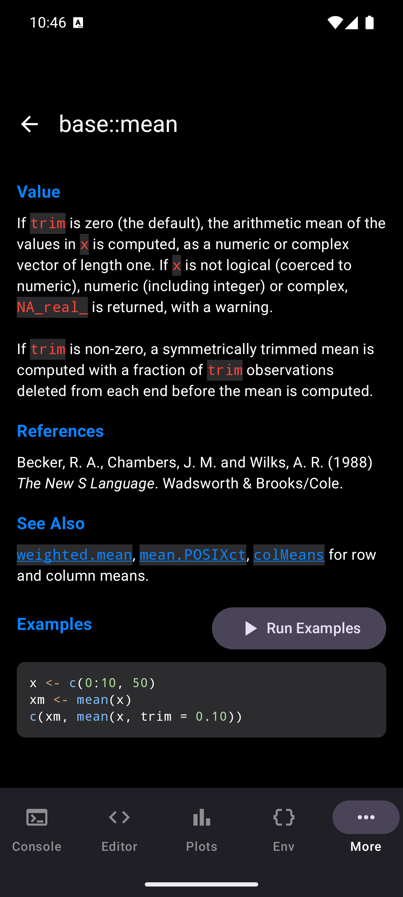 From any help page, tap Run Examples to execute the function’s built-in examples. The code is sent to the Console via example("function_name", package = "pkg") and the results (including any plots) appear in the Console and Plots tabs respectively.