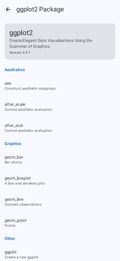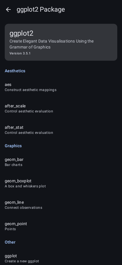 help(package = "ggplot2")This displays an index of every documented function and dataset in the package, with brief descriptions. Tap any entry to read its full help page.