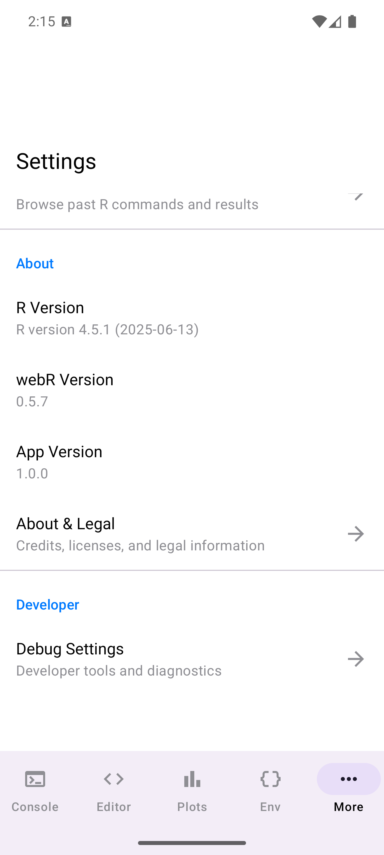 Settings is where you tailor webRoid to the way you work. Everything is organized into clearly labeled sections that you scroll through on a single screen: Appearance, Layout, Plots, Console, Editor, Session, Storage, and App Info.