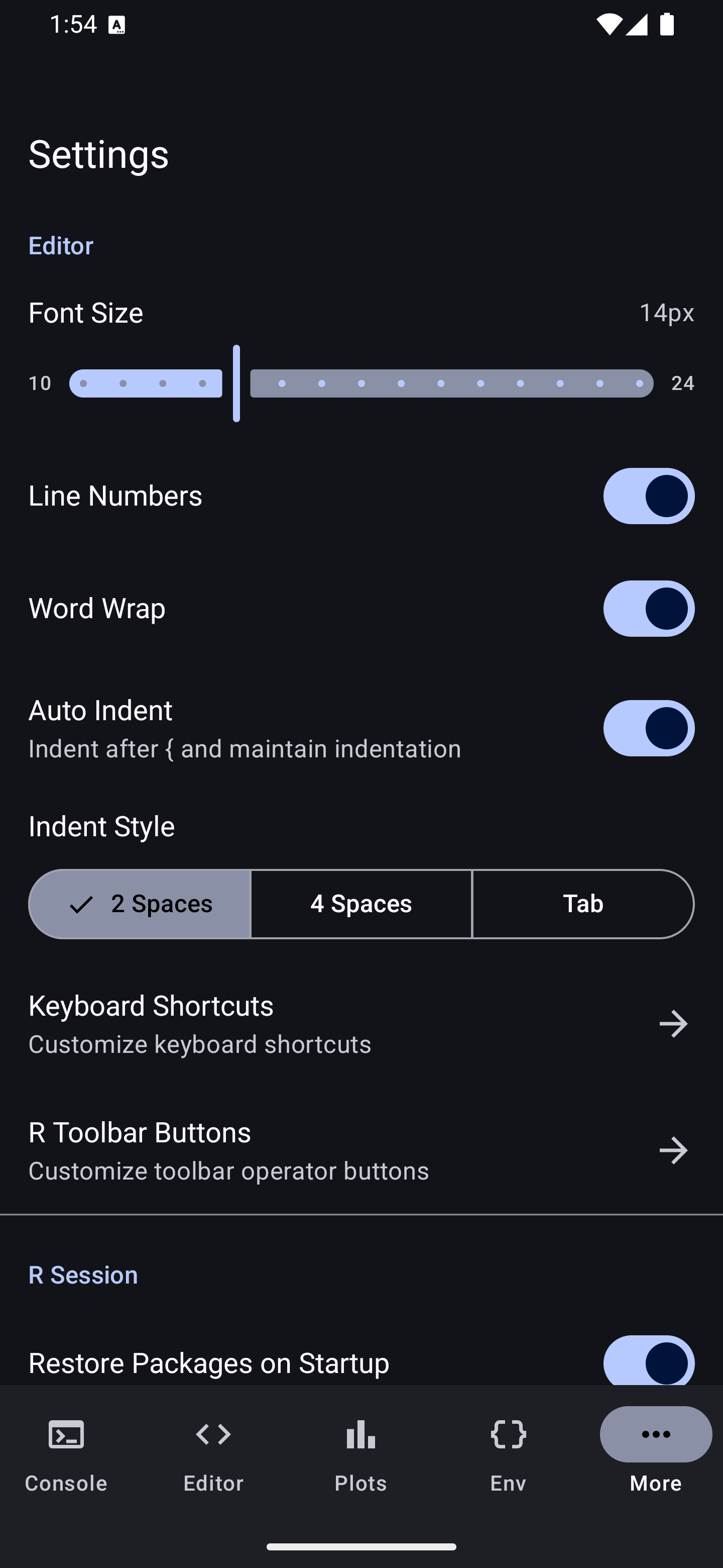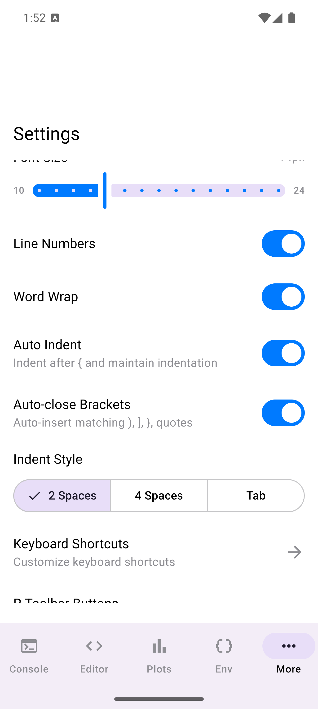 | Word Wrap | When enabled, long lines wrap to fit the screen width instead of scrolling horizontally. Helpful on narrow phone screens. |