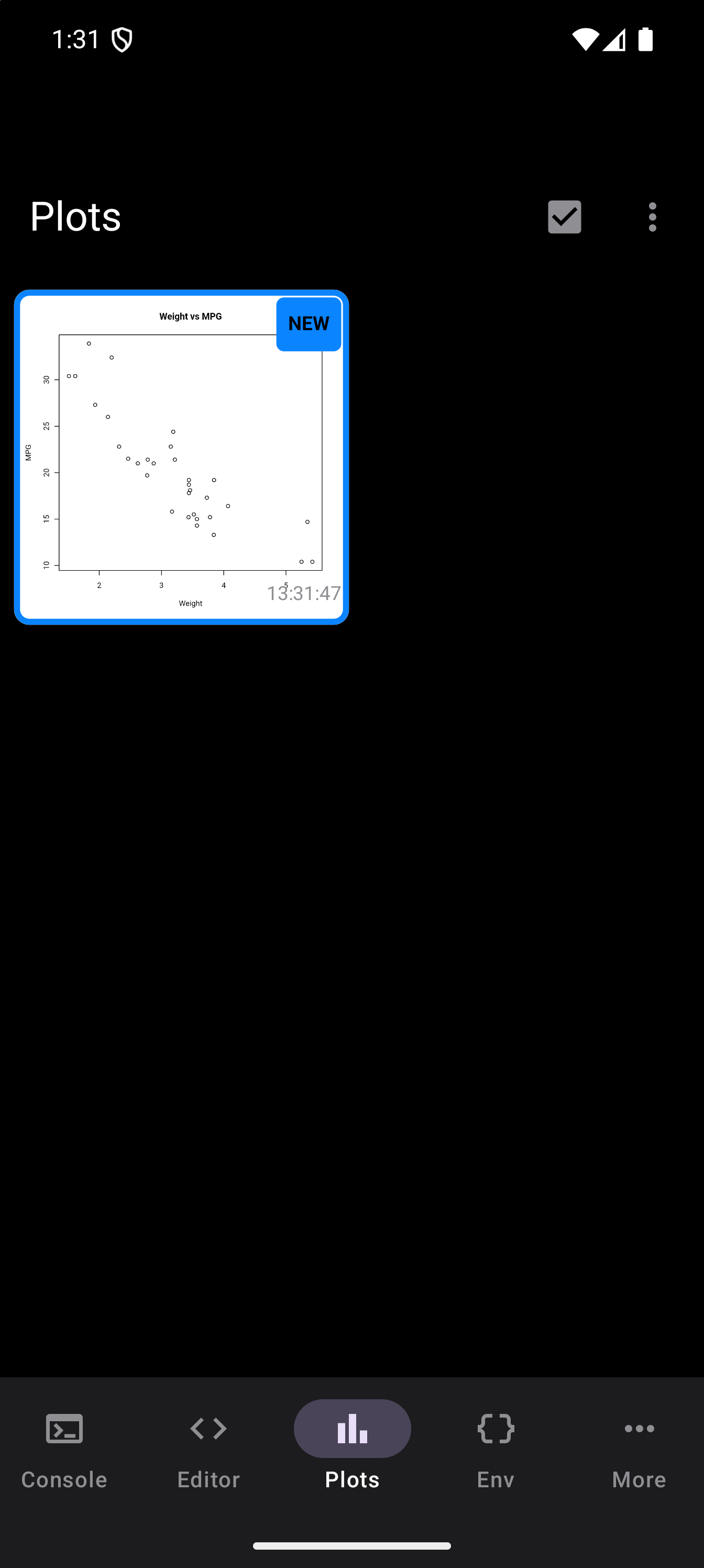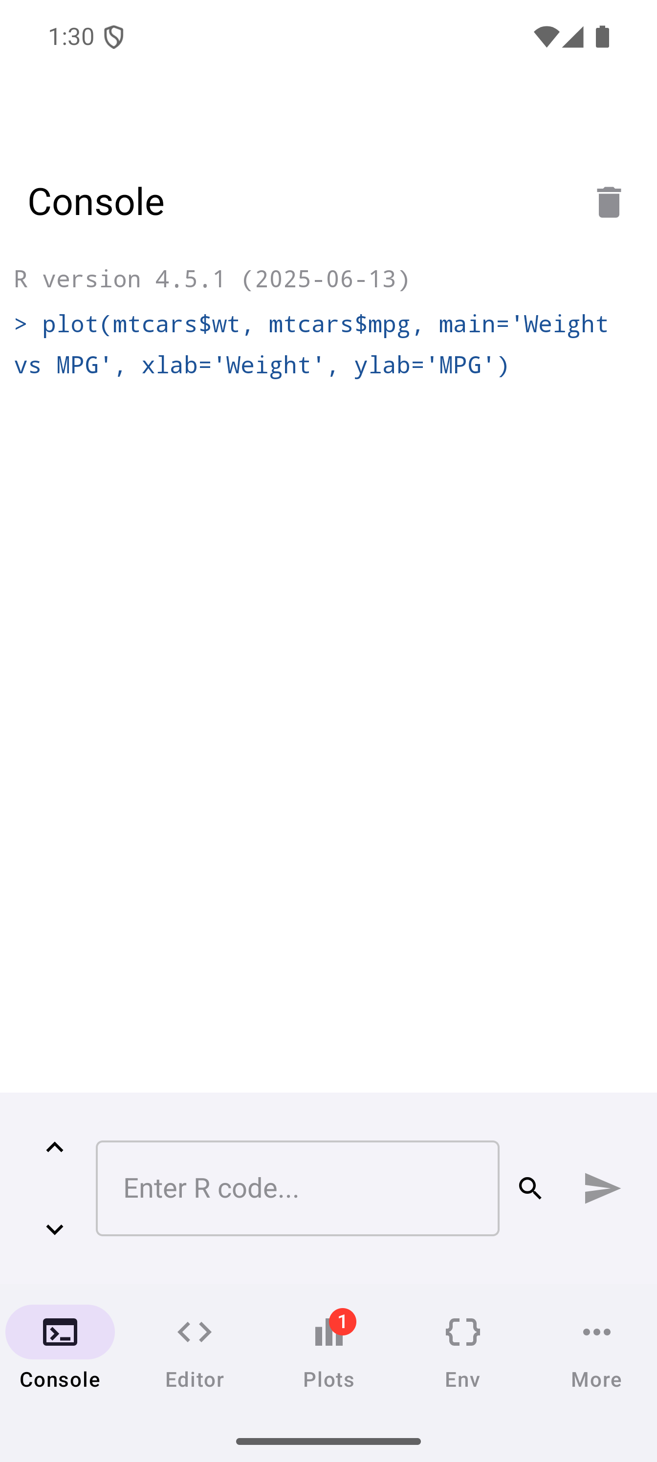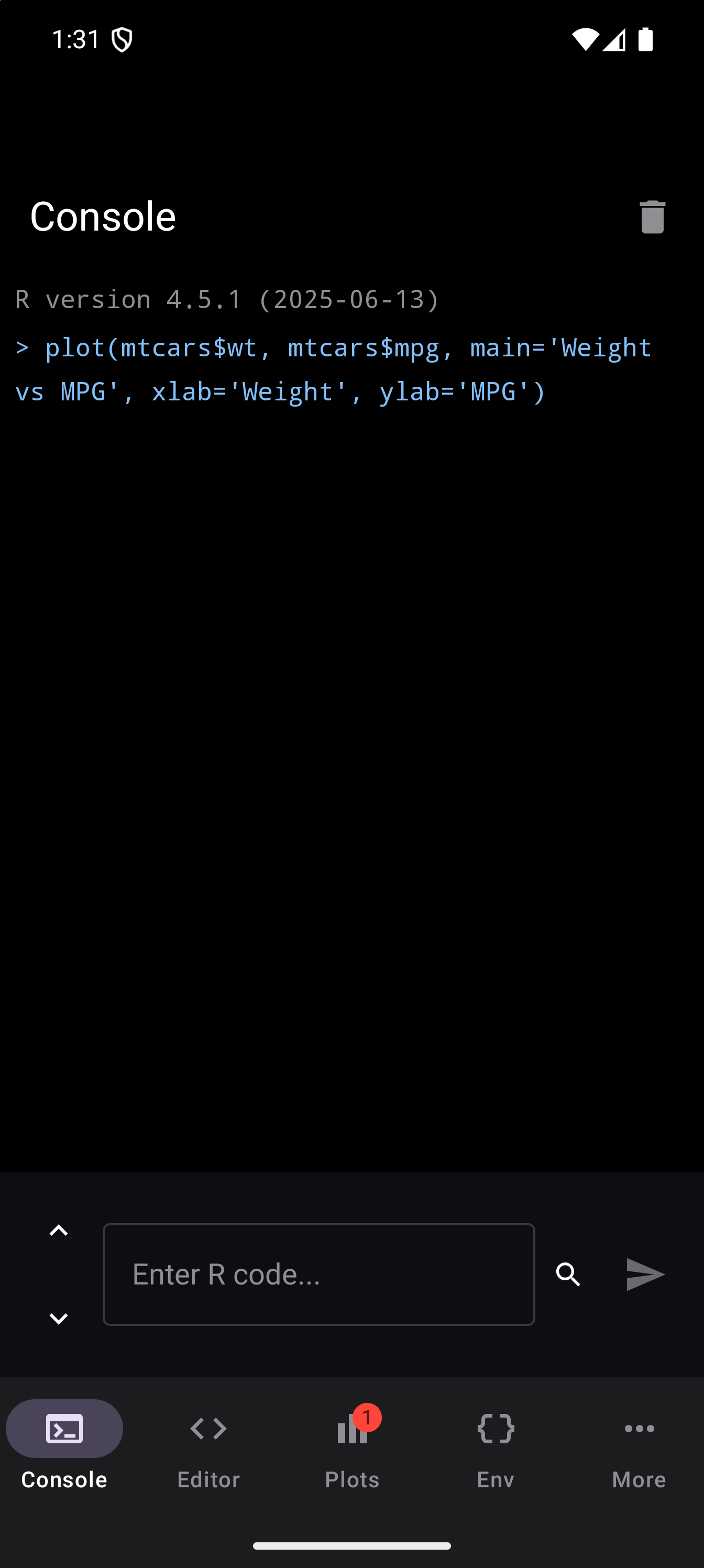 plot(mtcars$wt, mtcars$mpg, main = "Weight vs MPG", xlab = "Weight", ylab = "MPG")When a plot is generated, a badge appears on the Plots tab icon in the bottom navigation bar showing how many unseen plots are waiting. Tap the Plots tab to see your plot in the gallery.