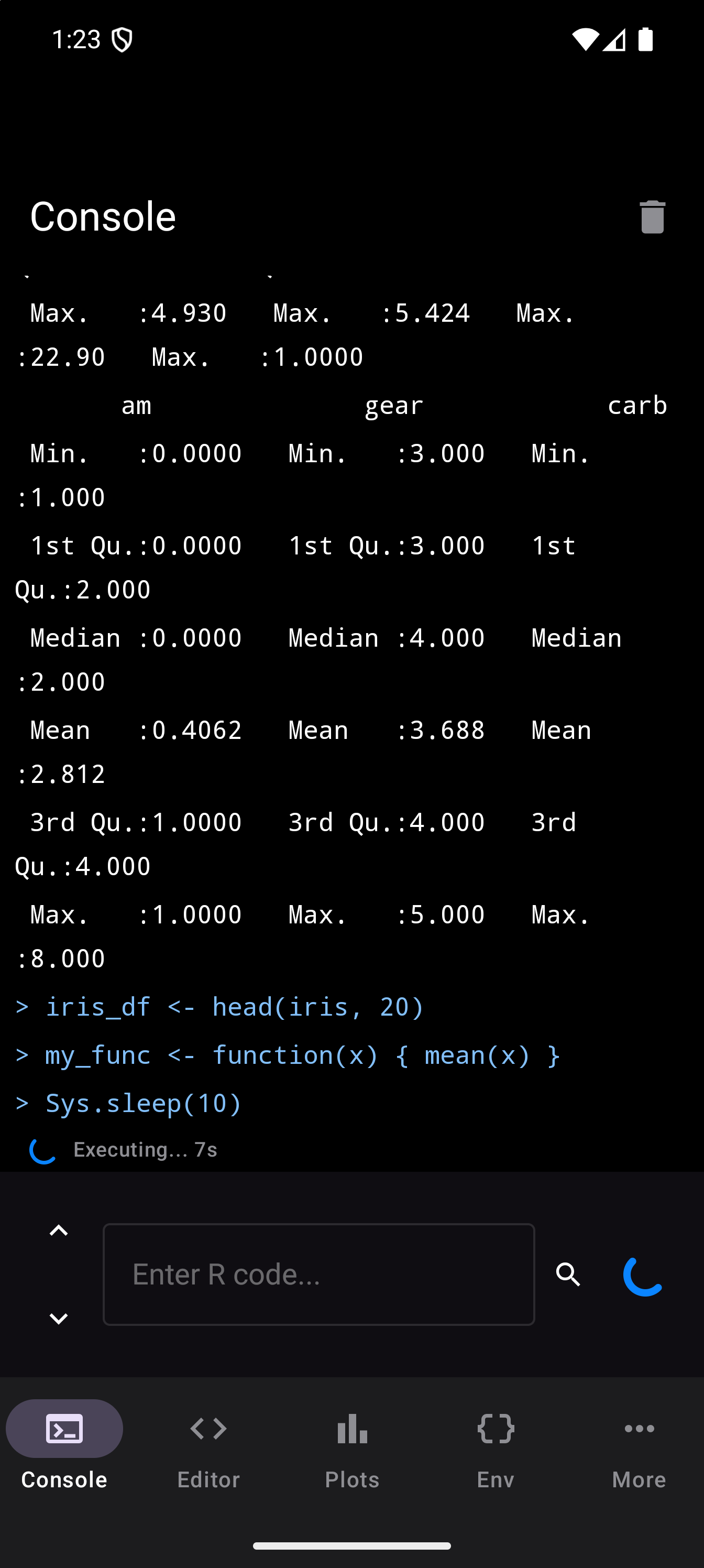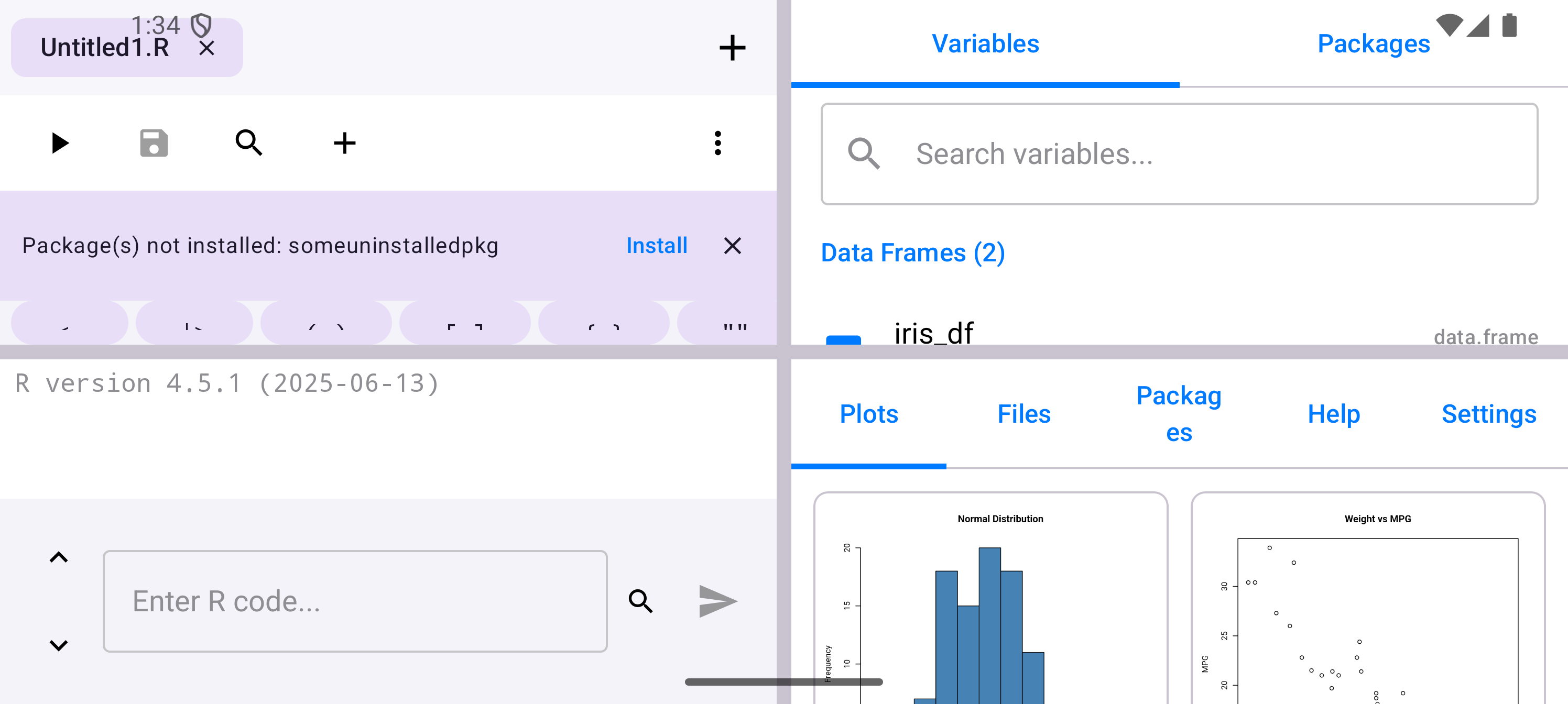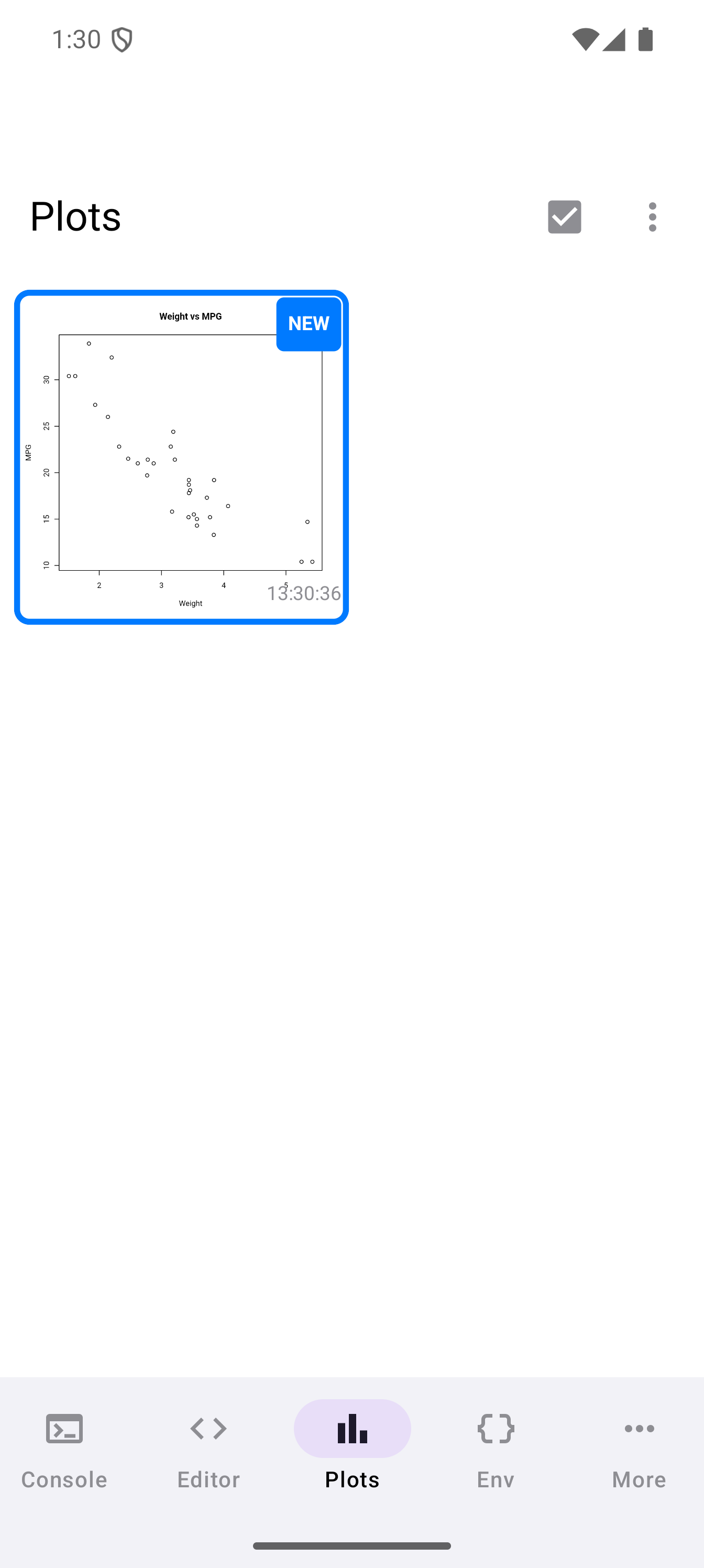 plot(mtcars$wt, mtcars$mpg, main = "Weight vs MPG", xlab = "Weight", ylab = "MPG")When a plot is generated, a badge appears on the Plots tab icon in the bottom navigation bar showing how many unseen plots are waiting. Tap the Plots tab to see your plot in the gallery.