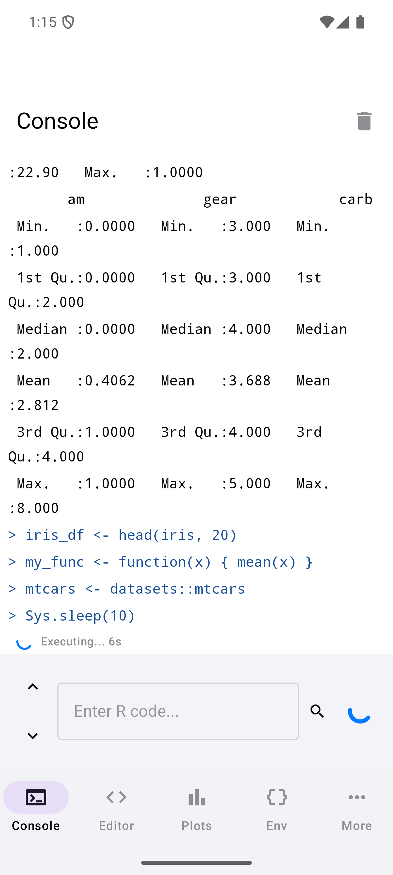 summary(mtcars)Output is color-coded by type: regular results, messages, warnings, and errors each get a distinct color so you can scan results quickly.