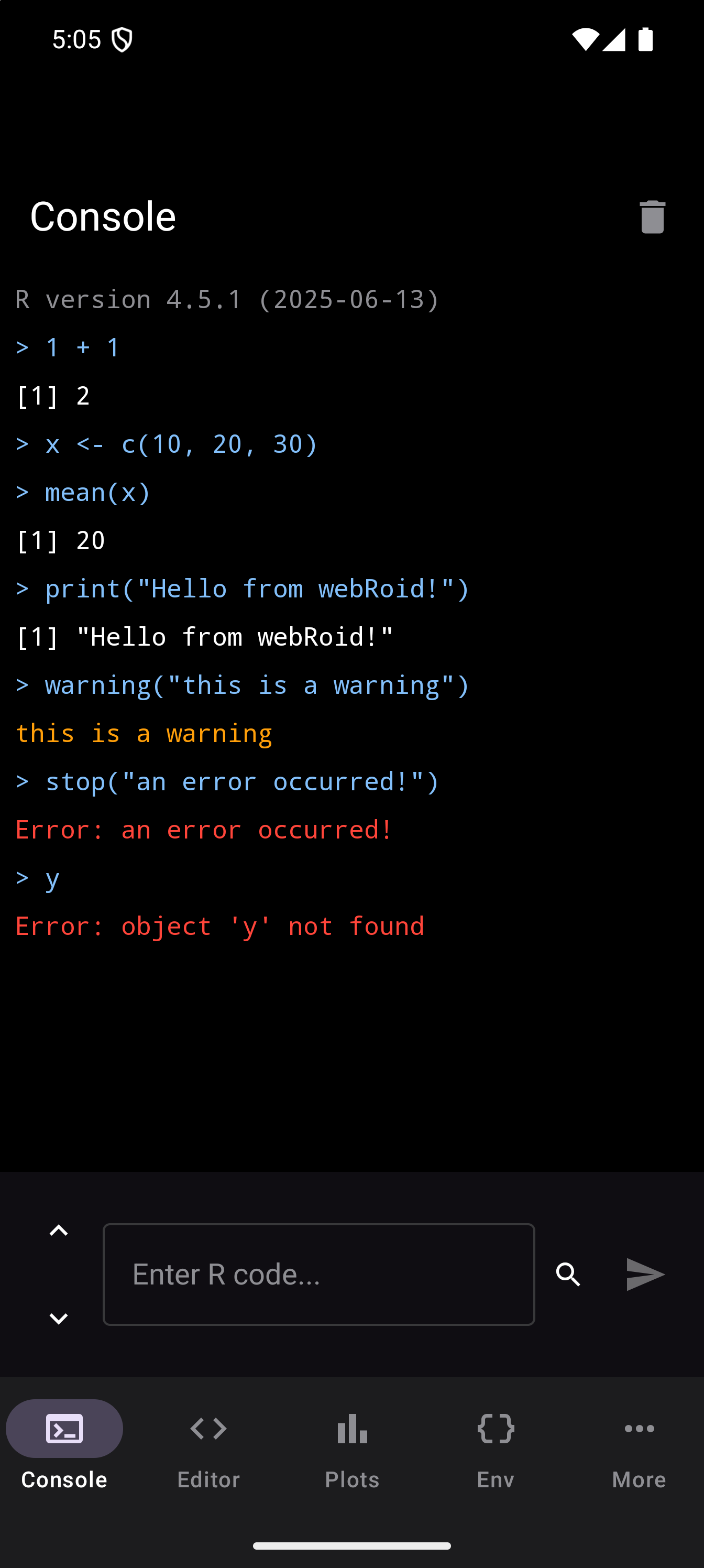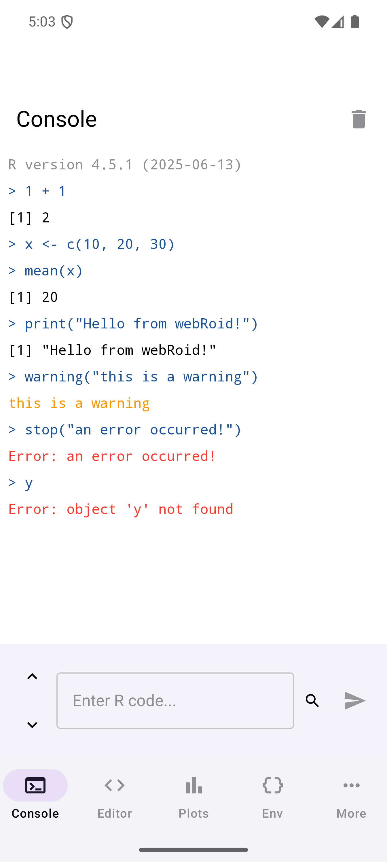 webRoid is a native Android app that brings a nearly full-featured R environment to your phone or tablet. It uses webR, a port of R compiled to WebAssembly, so everything runs locally on your device. No server, no internet connection required after install, no accounts to create. You get an interactive R console, a code editor, plotting, environment inspection, file management, and package installation, all in a single app.