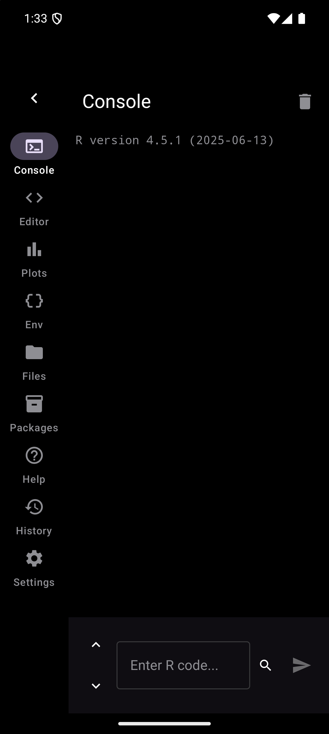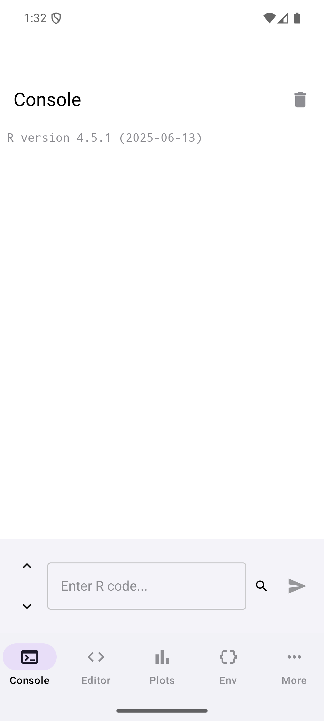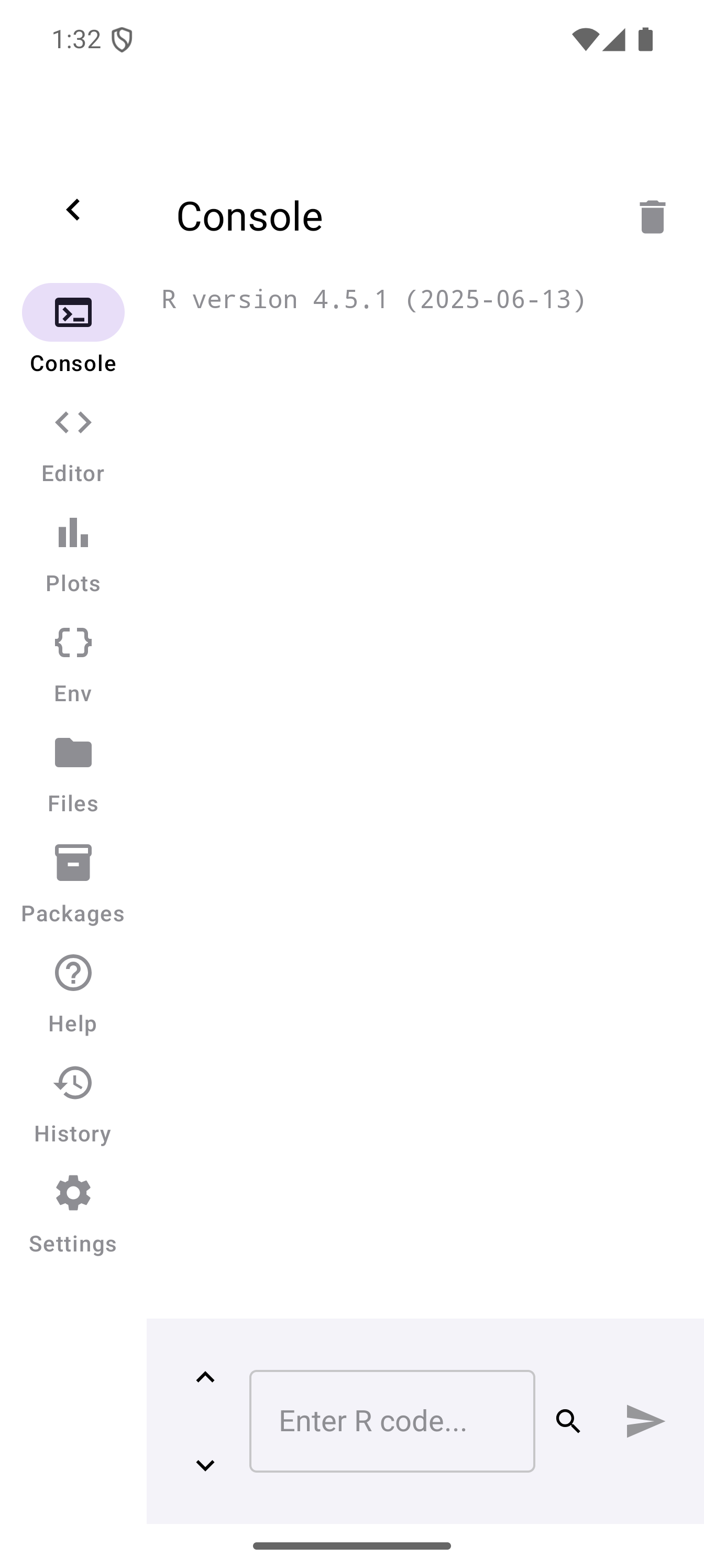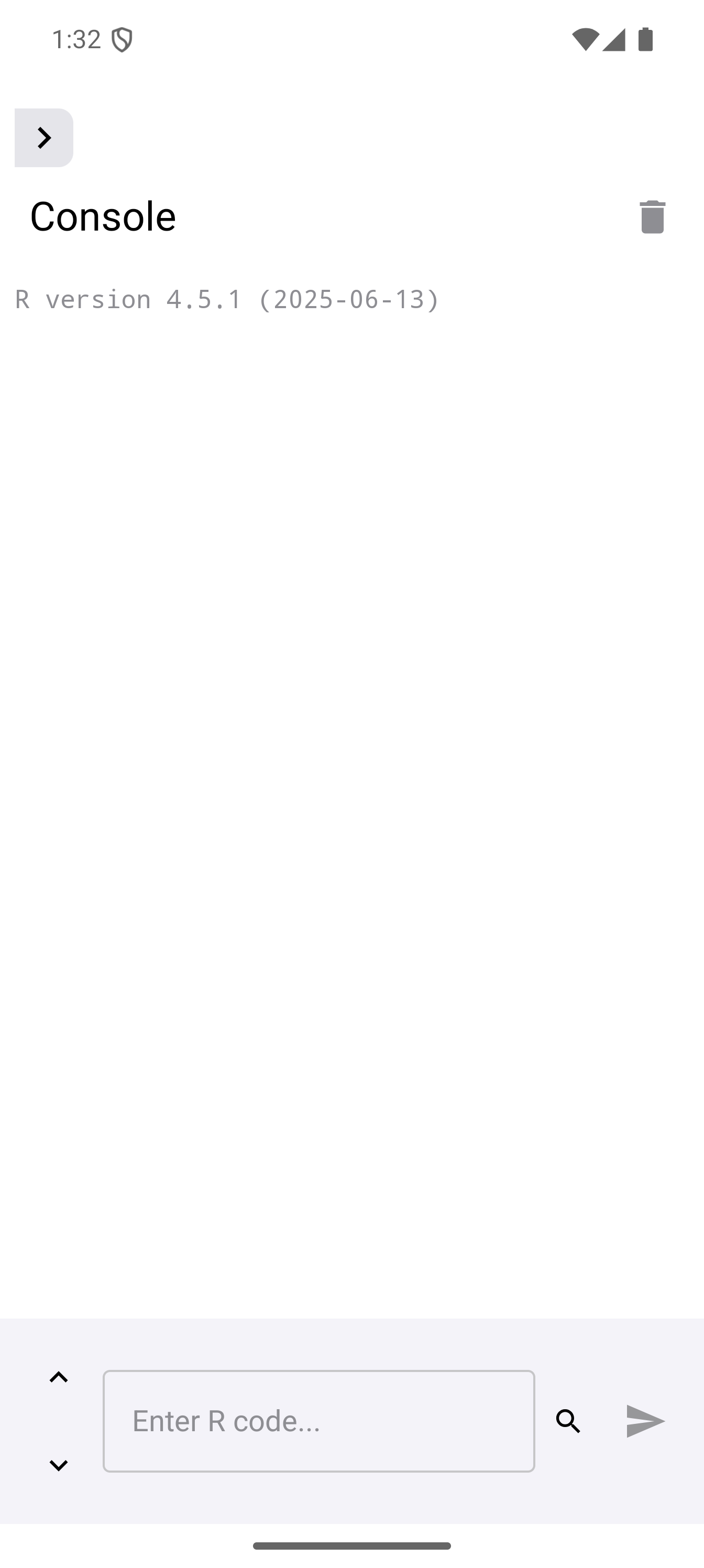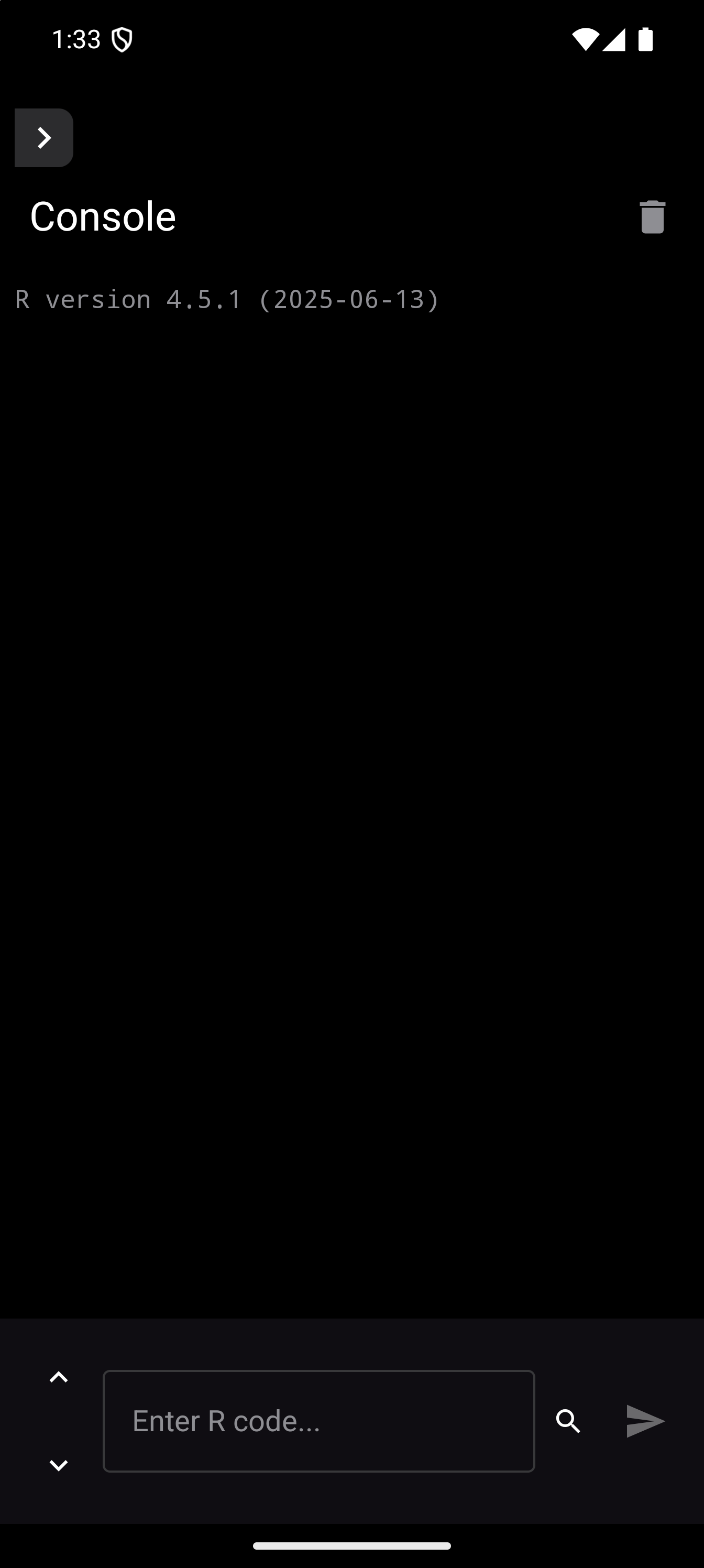 After the runtime loads, you land on the Console tab. The screen is empty except for an input field at the bottom with the placeholder text “Enter R code…” and a blue play button.
