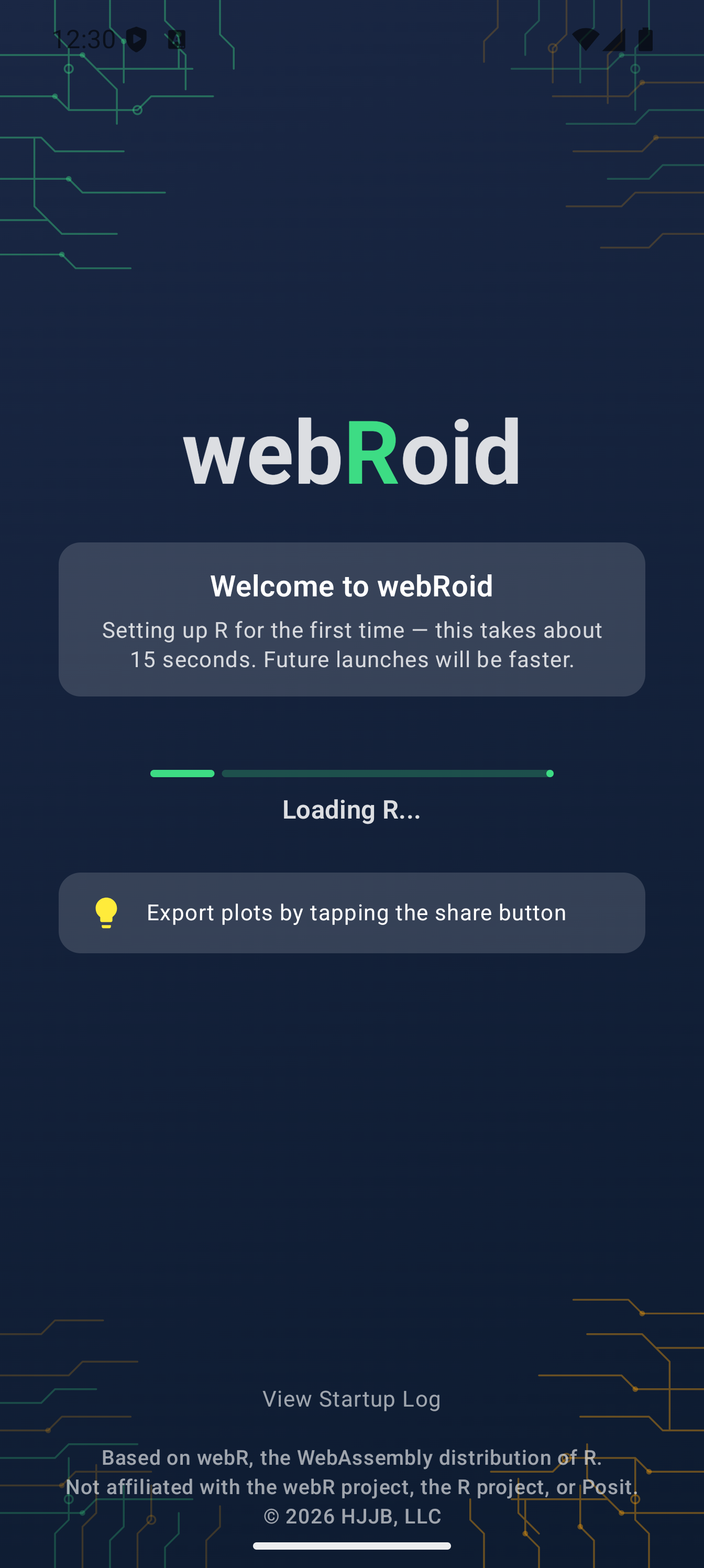 After onboarding completes, the R runtime initializes. A loading screen shows a progress bar and the current initialization phase (preparing files, starting the server, loading R). On first launch this takes about 15 seconds while WebAssembly modules load; subsequent launches are faster.