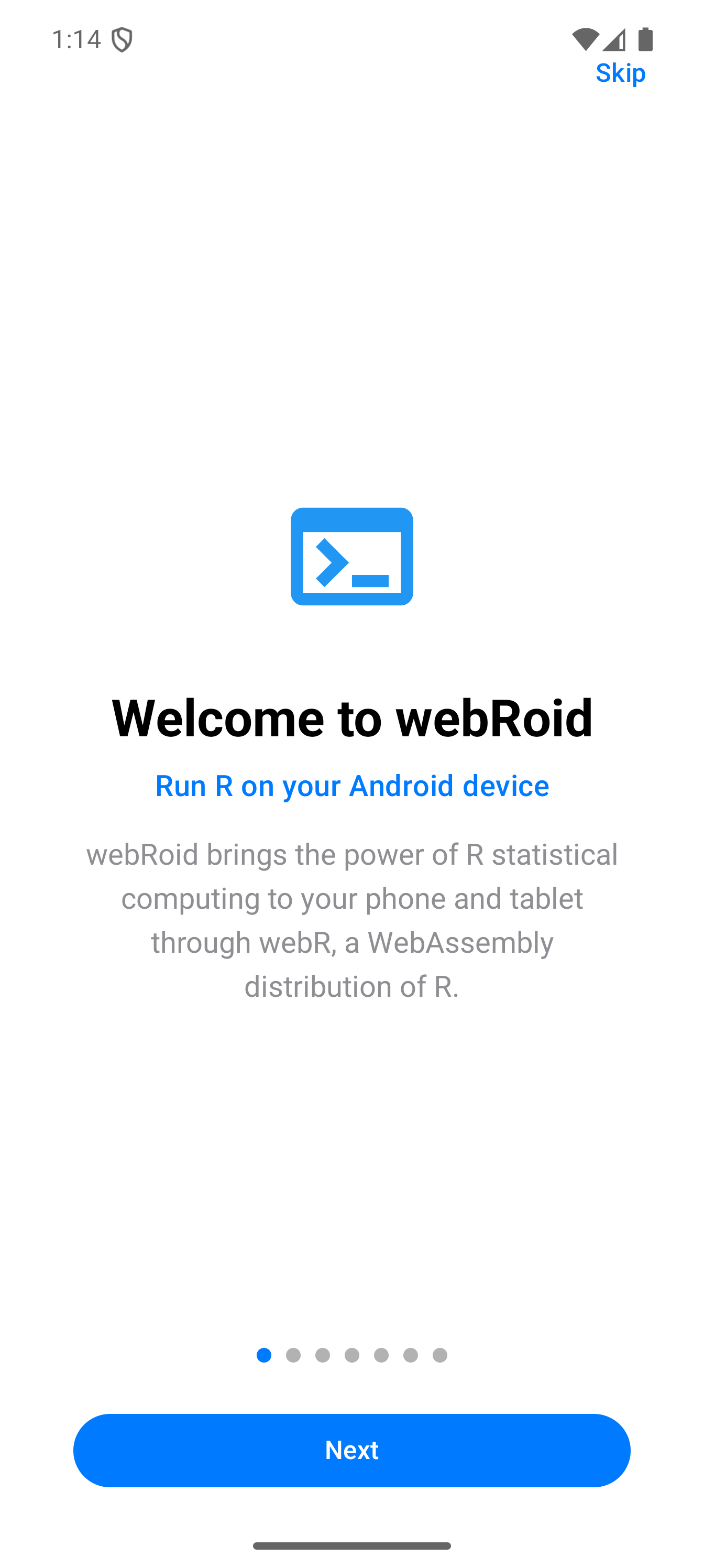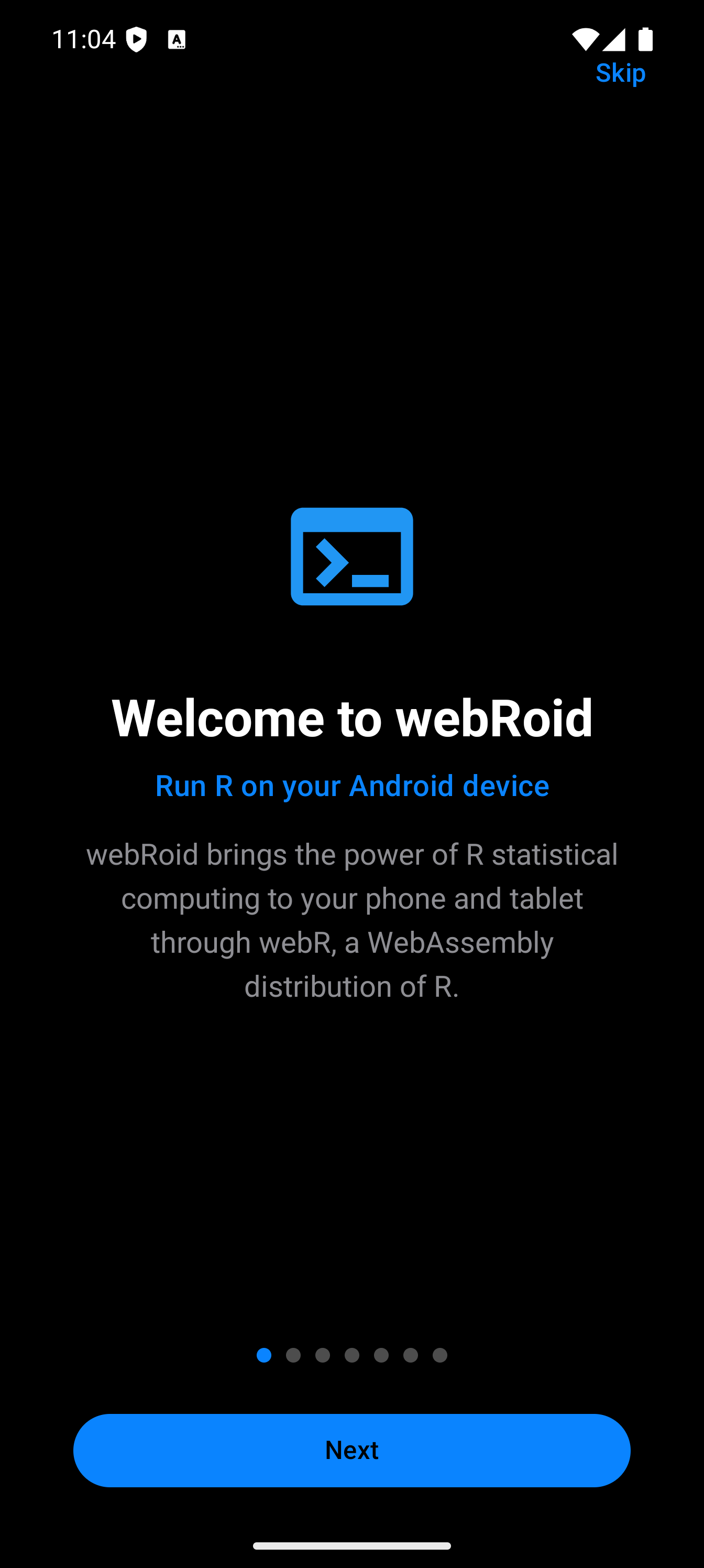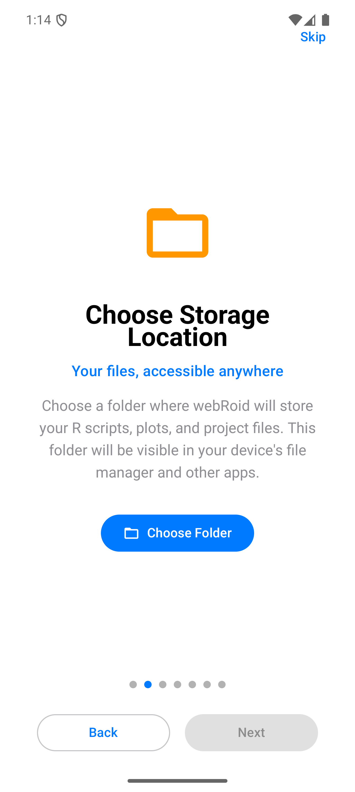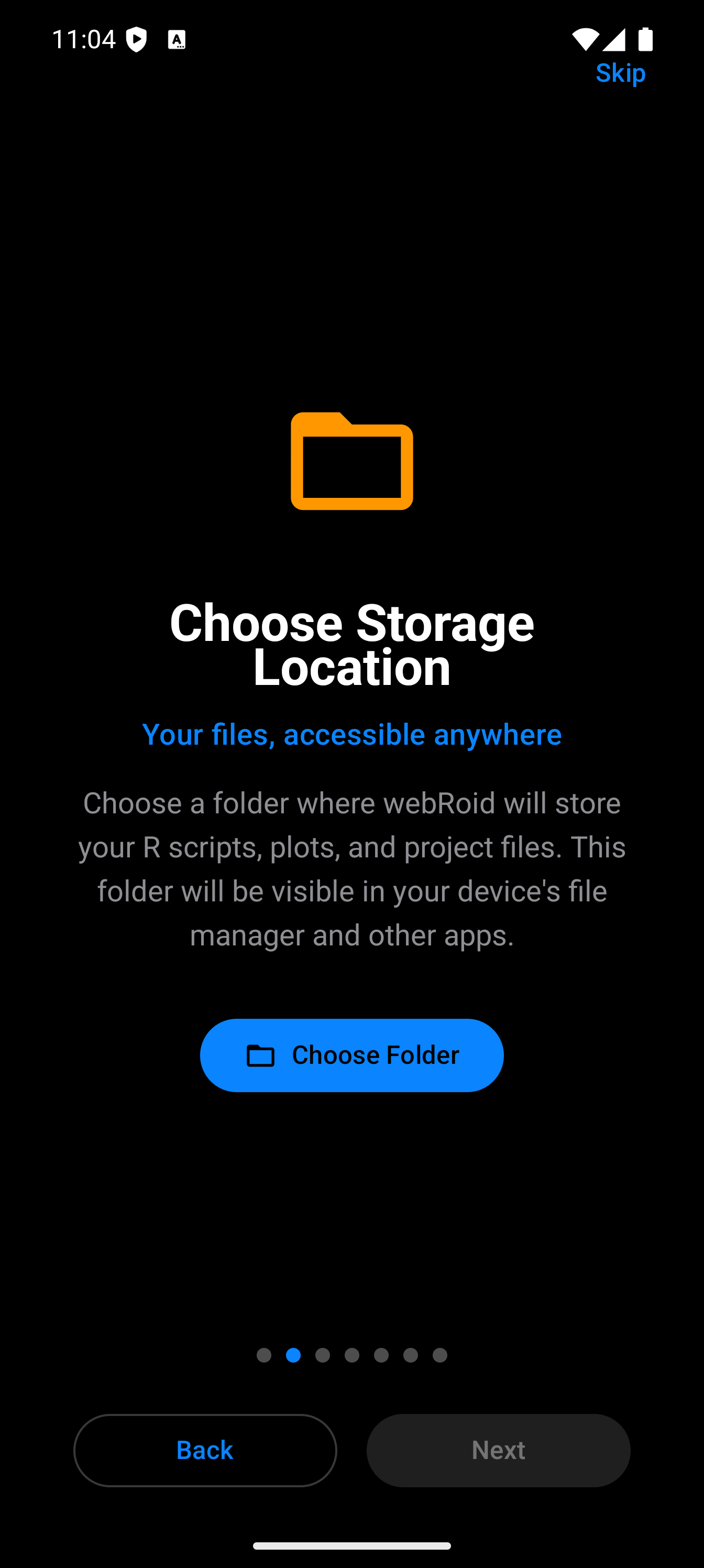 When you open webRoid for the first time, you will see a short onboarding sequence (7 pages) that introduces the main features of the app and lets you choose a storage location. Swipe through or tap to advance.