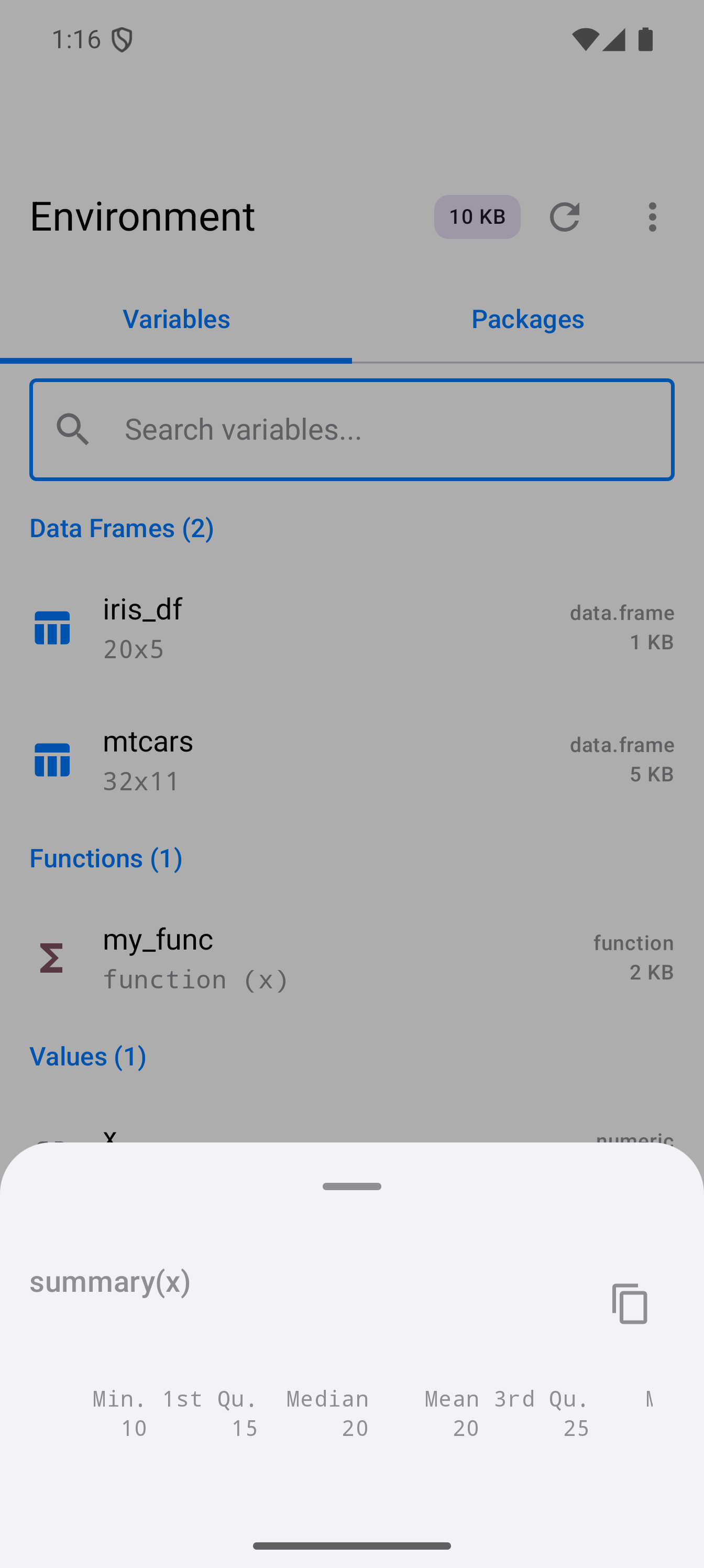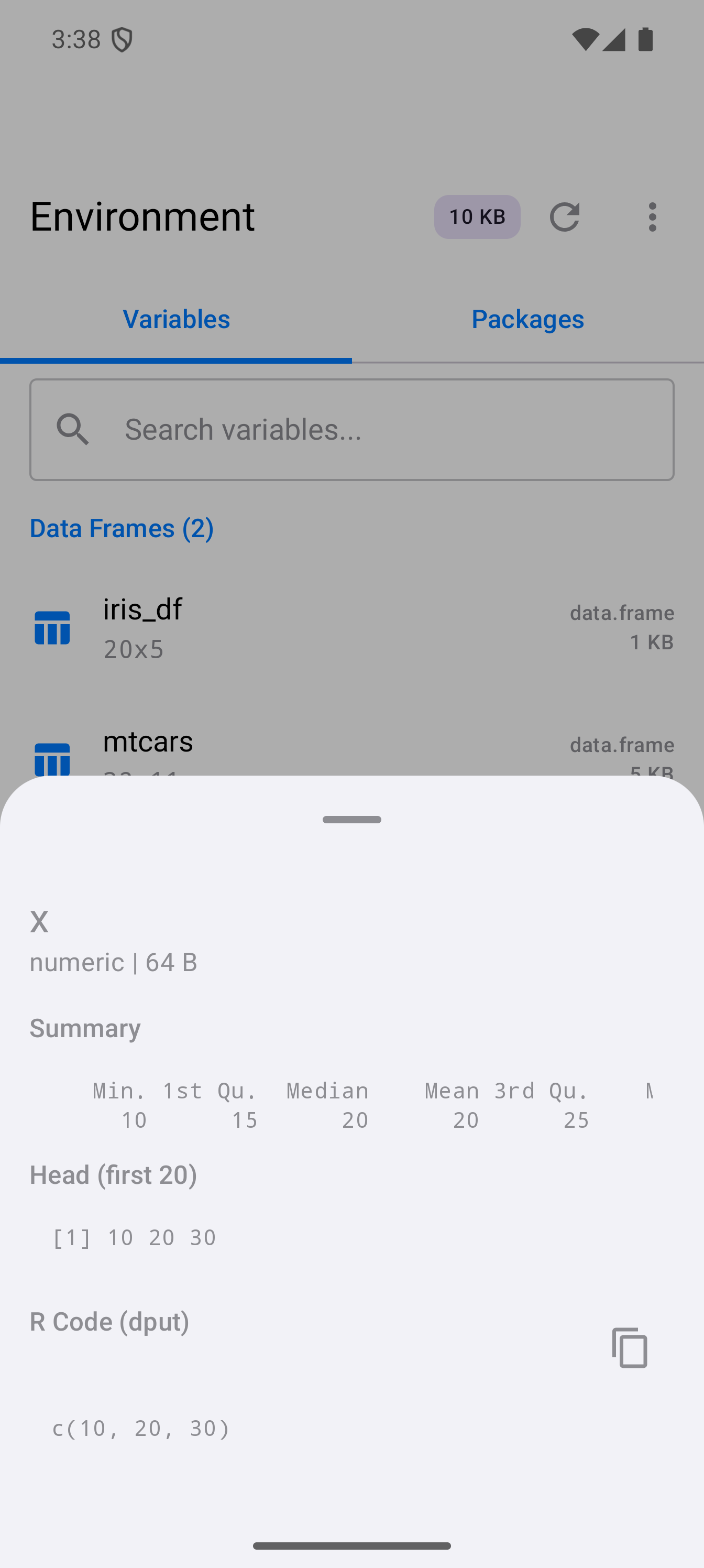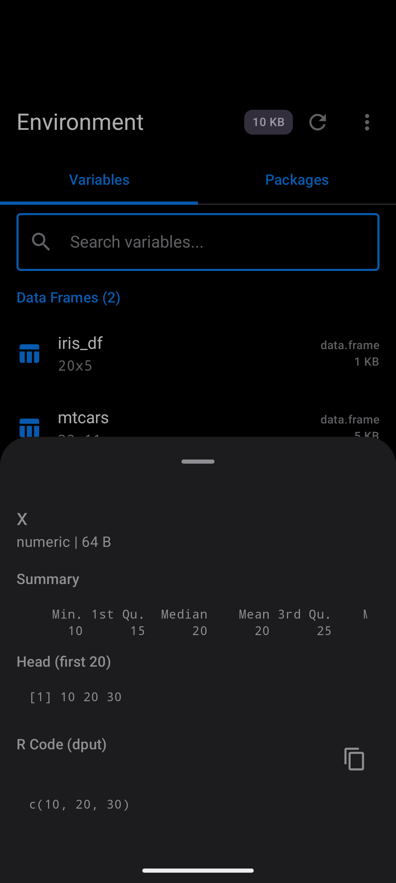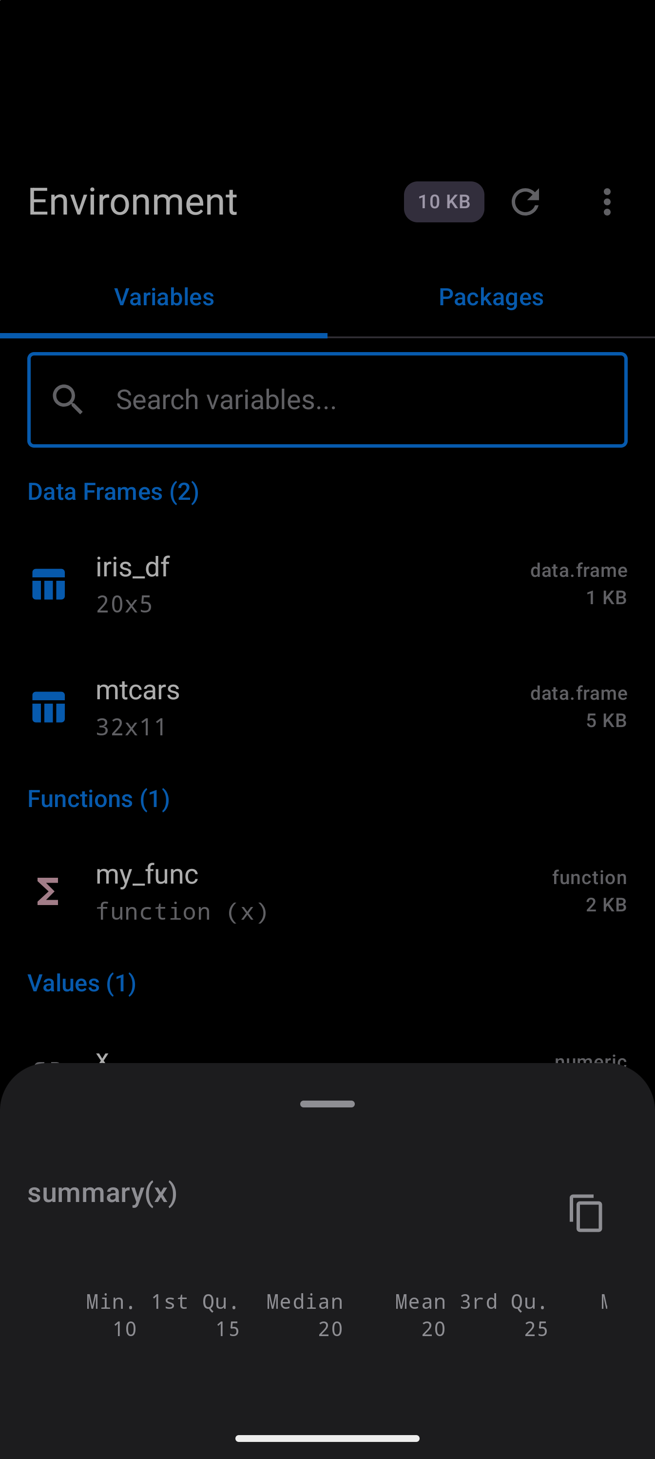 Tap Inspect on any variable to open a detail sheet with structural information. For data frames this includes column types and sample values; for functions, signatures and bodies; for vectors, summary and head output.