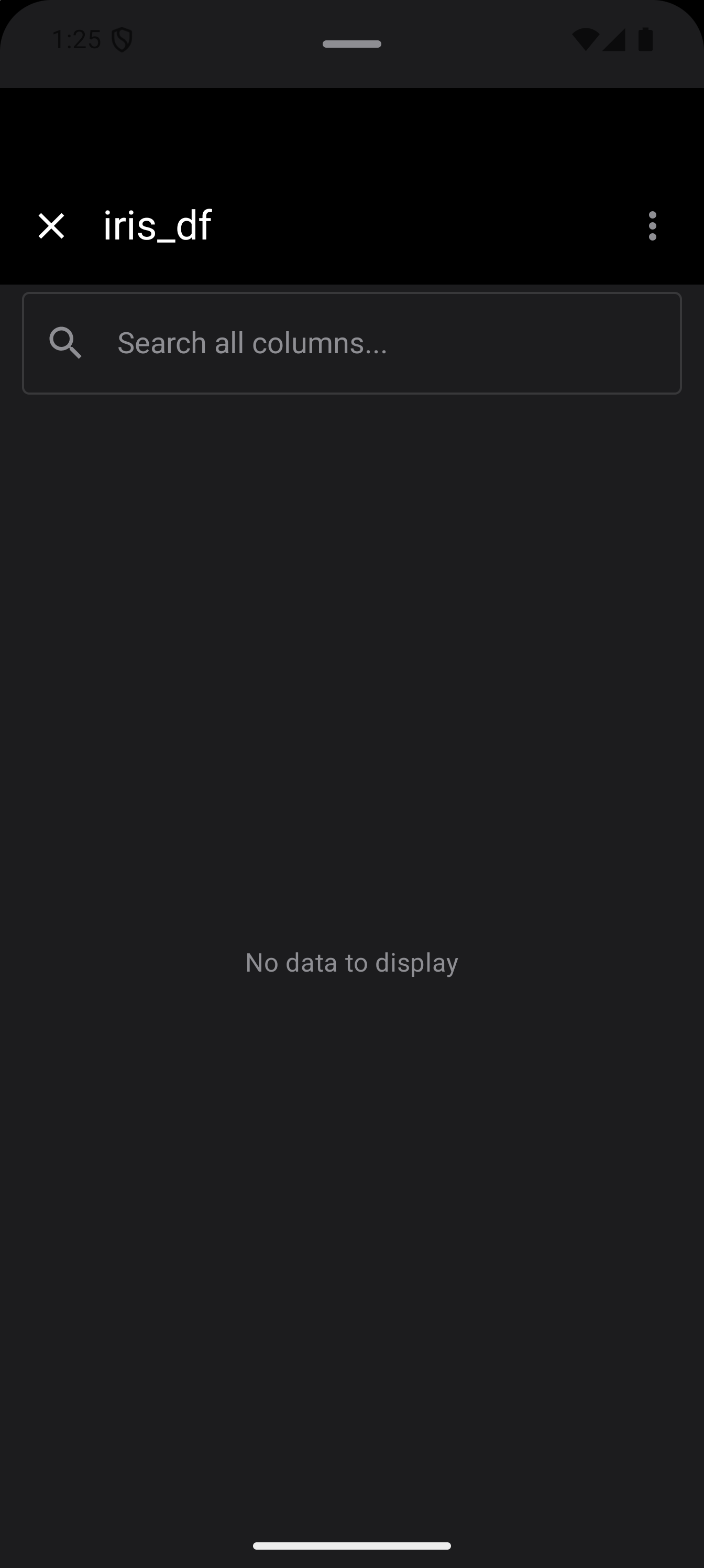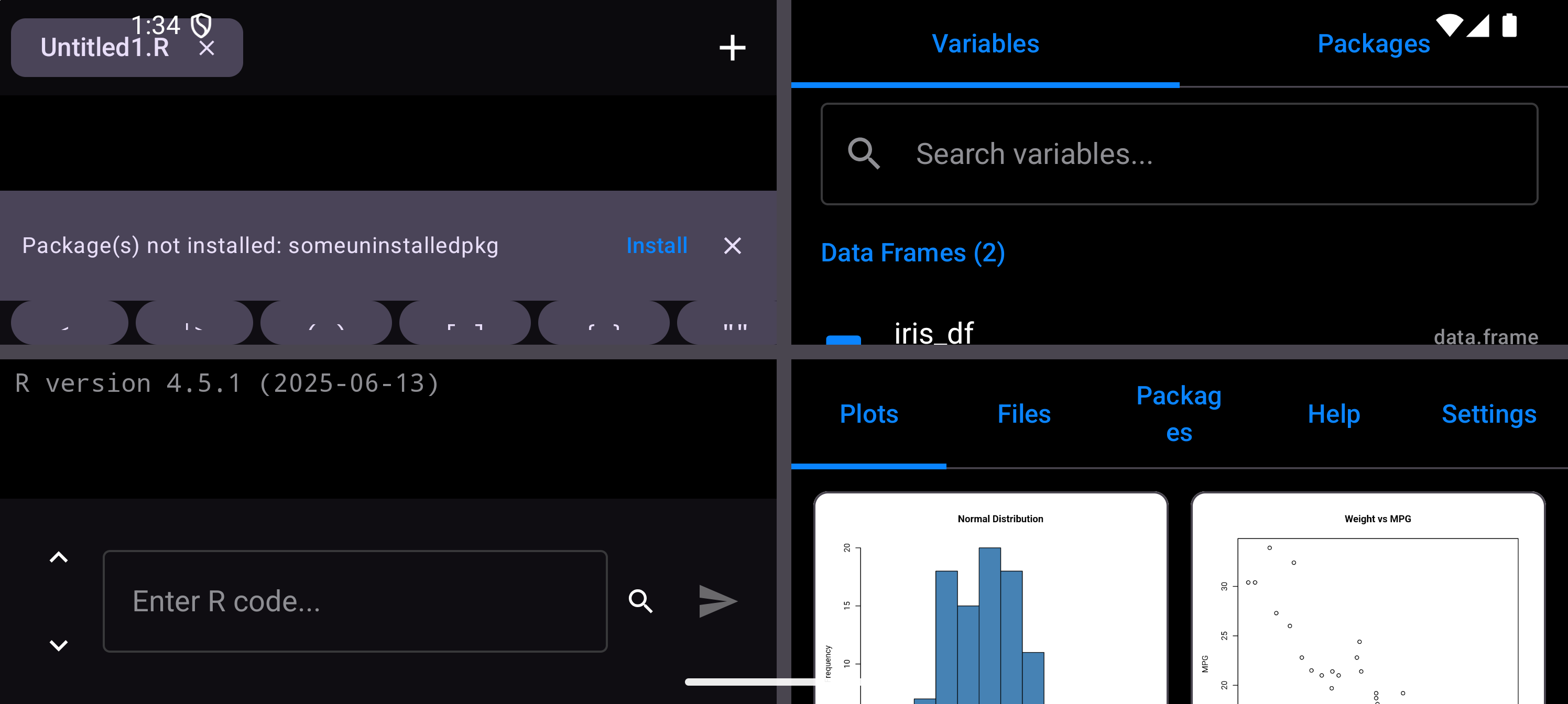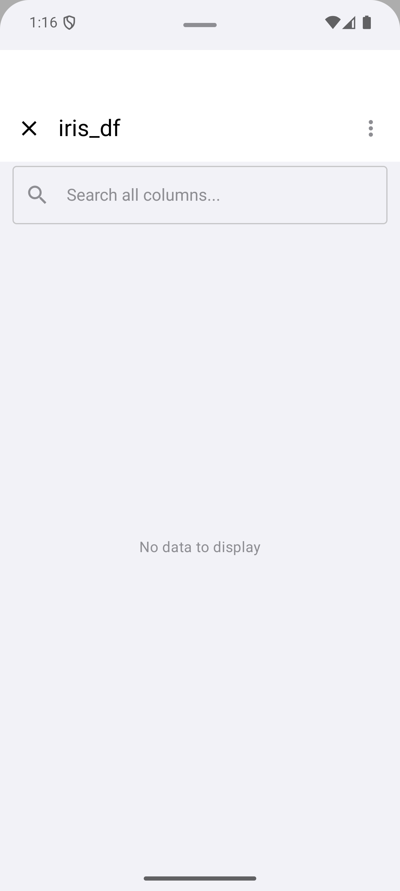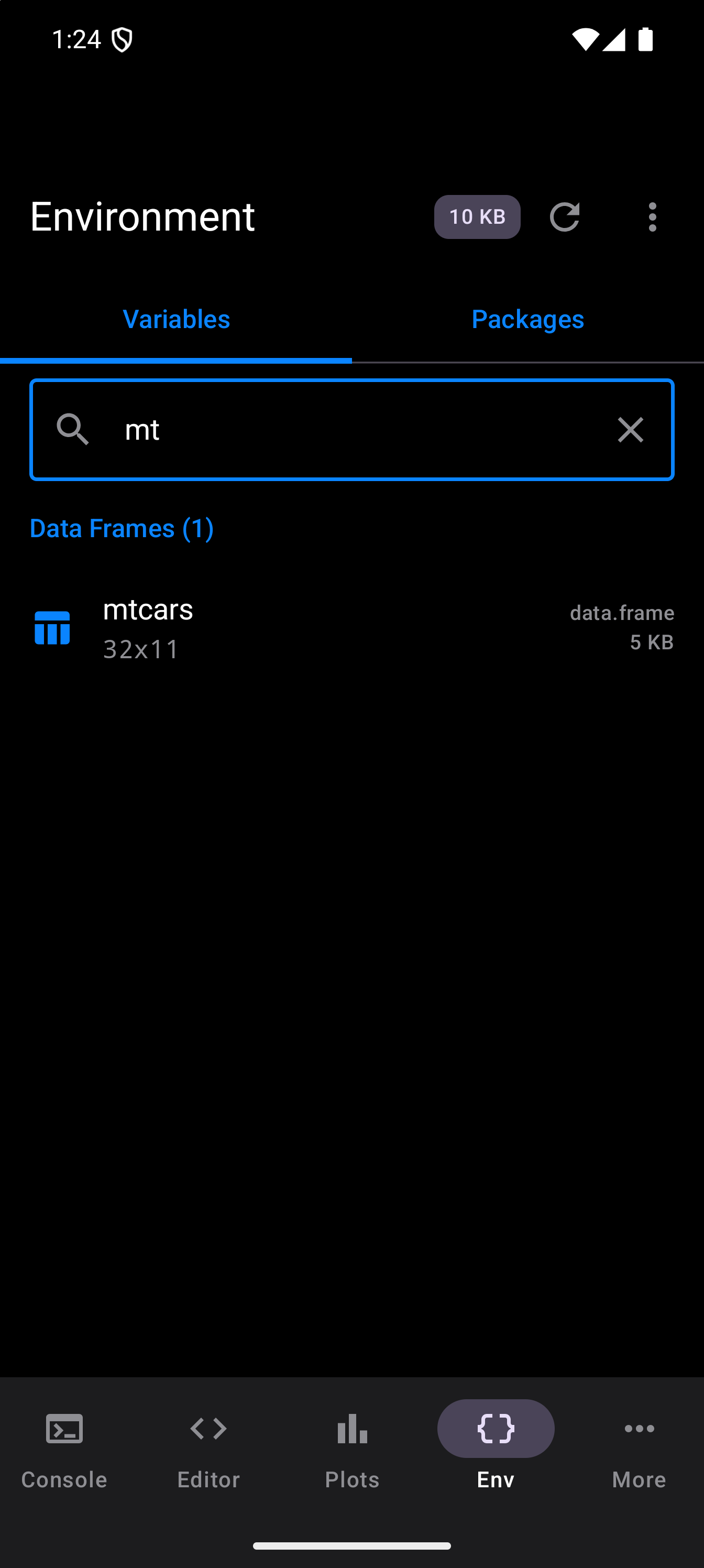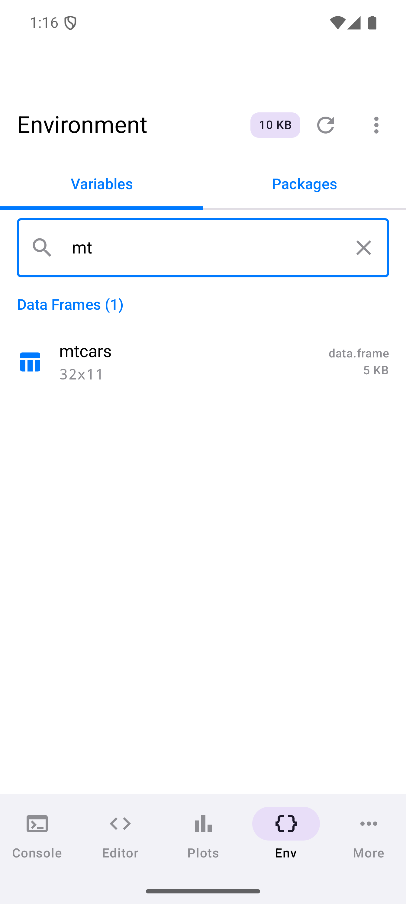 Tap Inspect on any variable to open a detail sheet with structural information. For data frames this includes column types and sample values; for functions, signatures and bodies; for vectors, summary and head output.