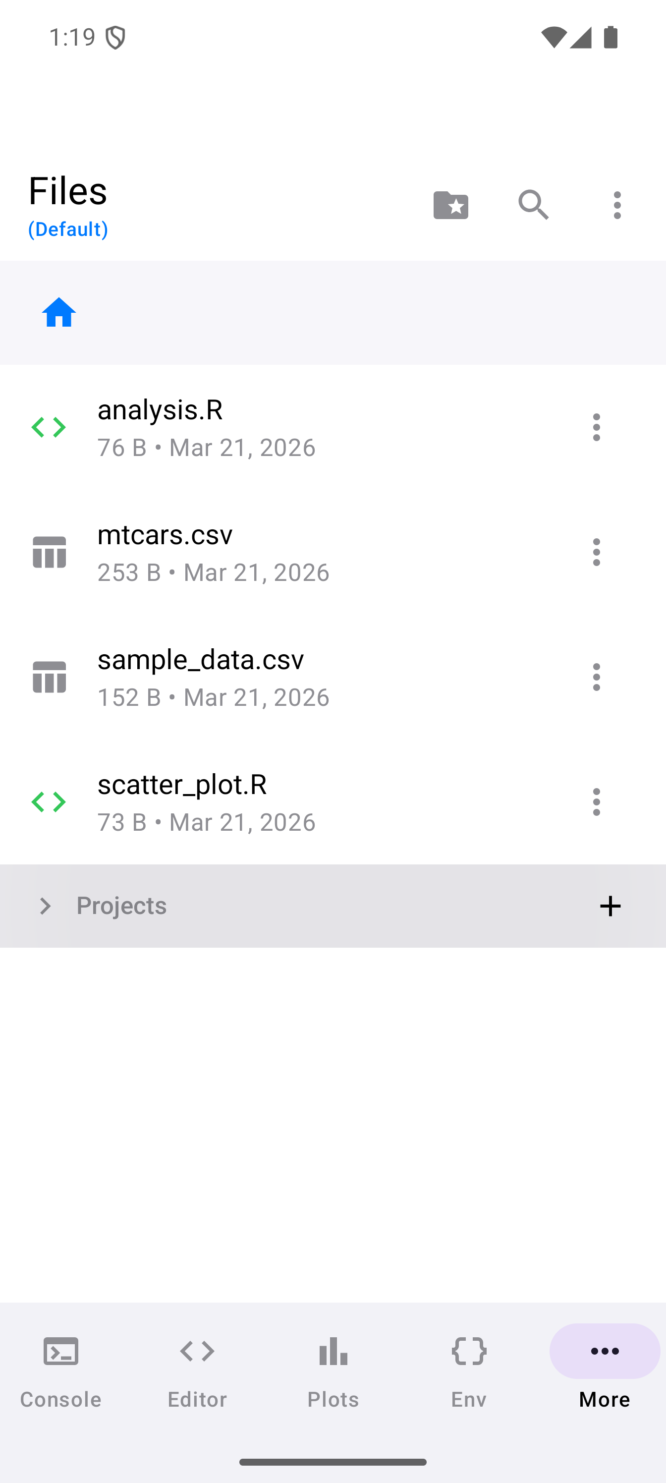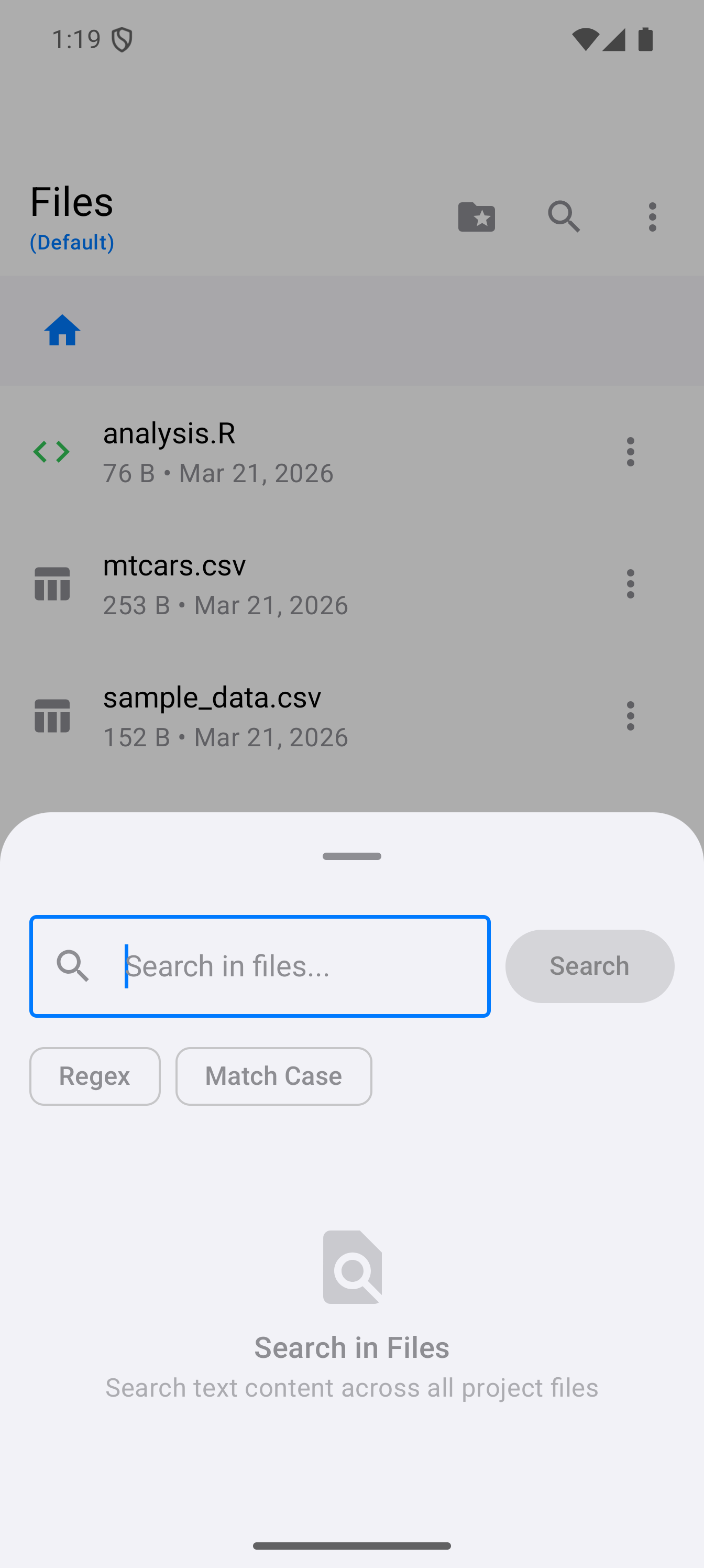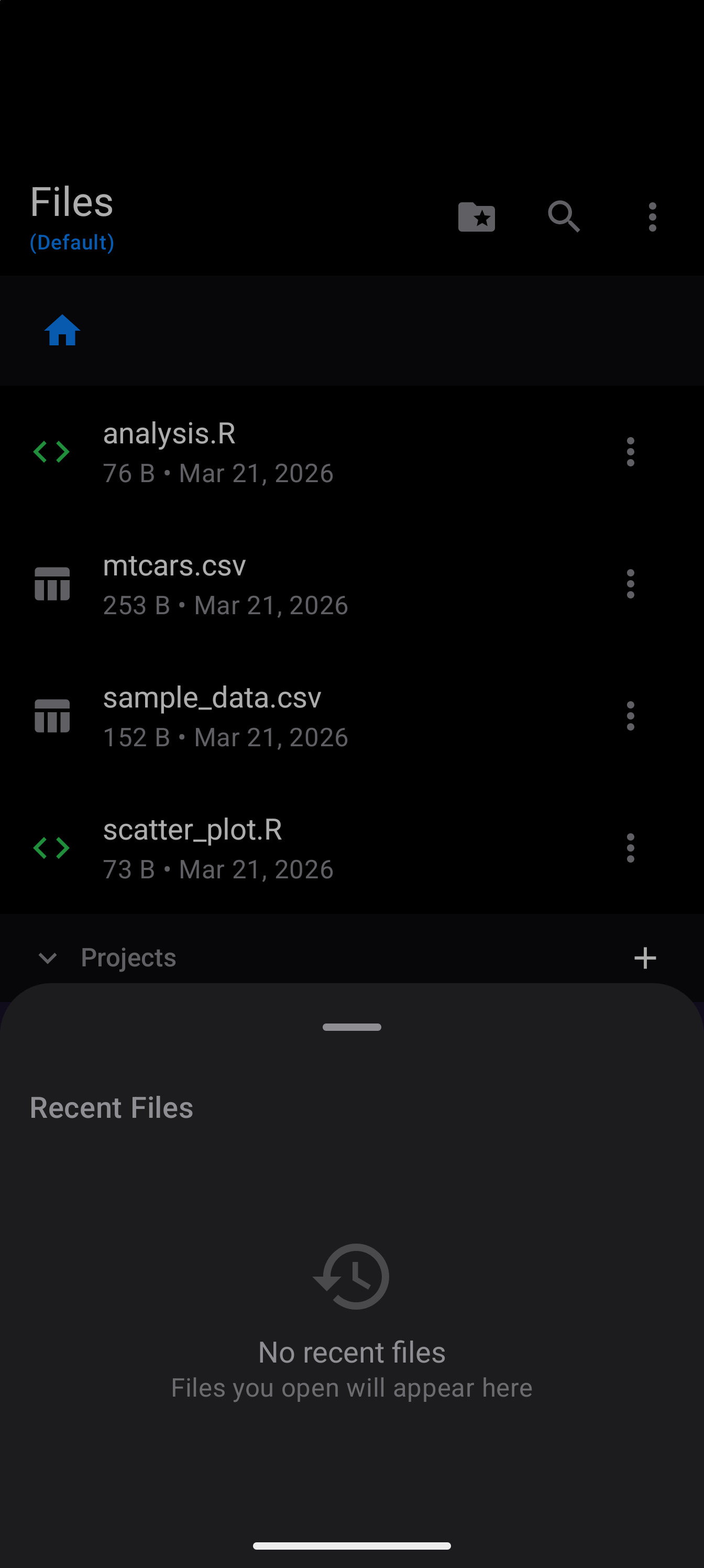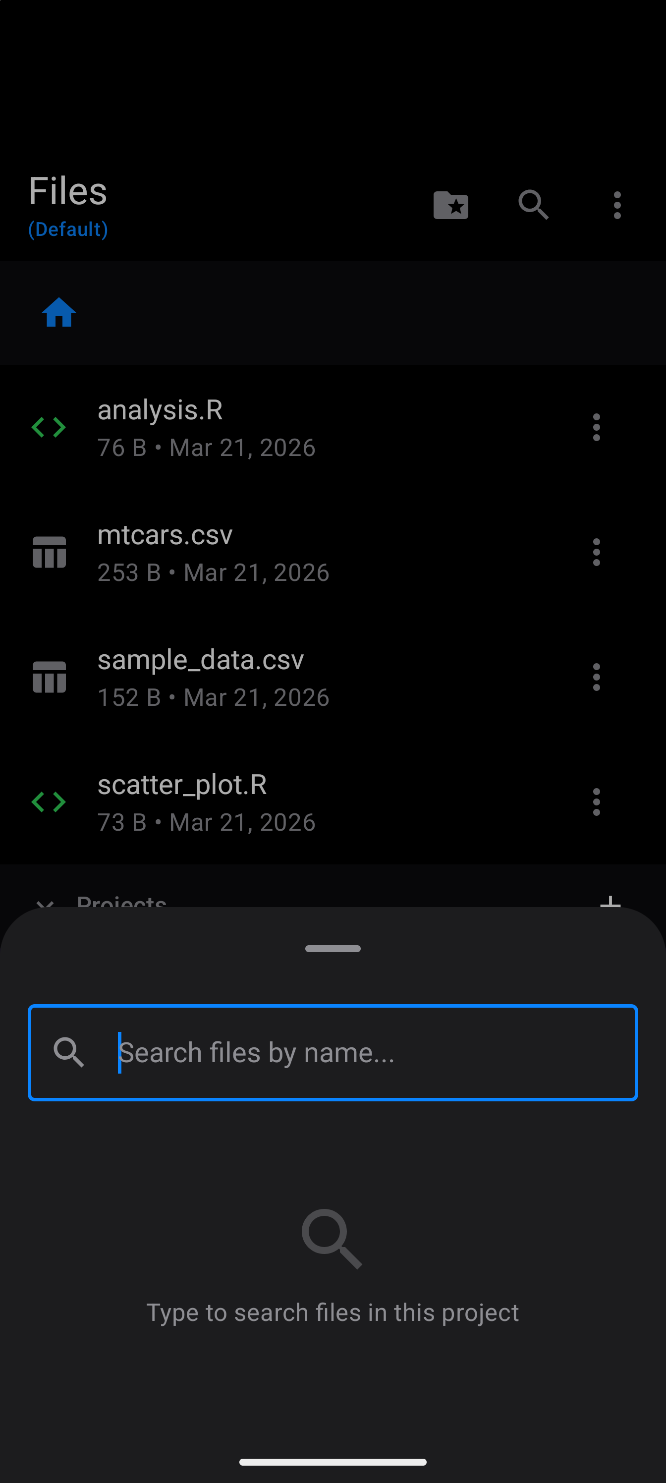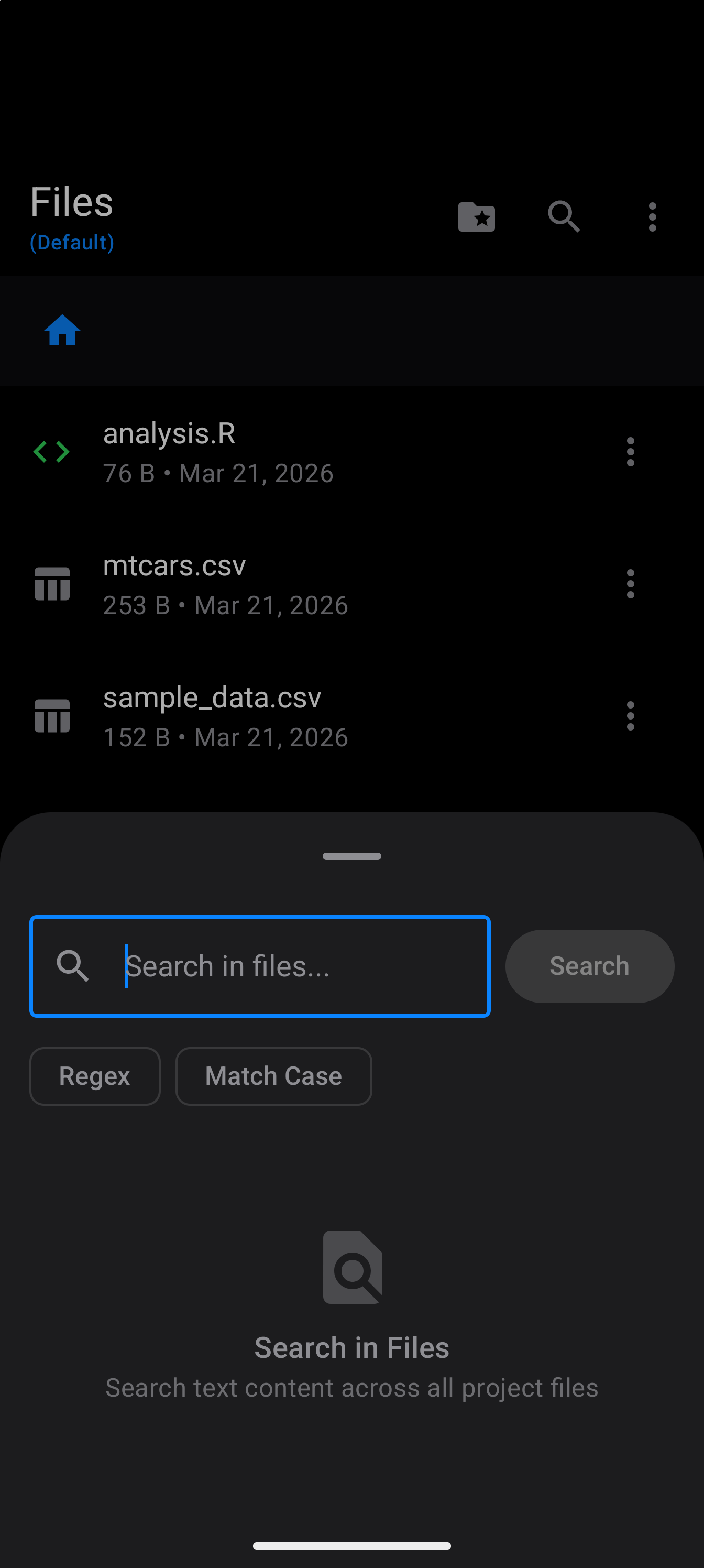 Tapping a text-based file (.R, .txt, .csv, .json, .md) opens it in the Editor. Tapping a folder navigates into it.