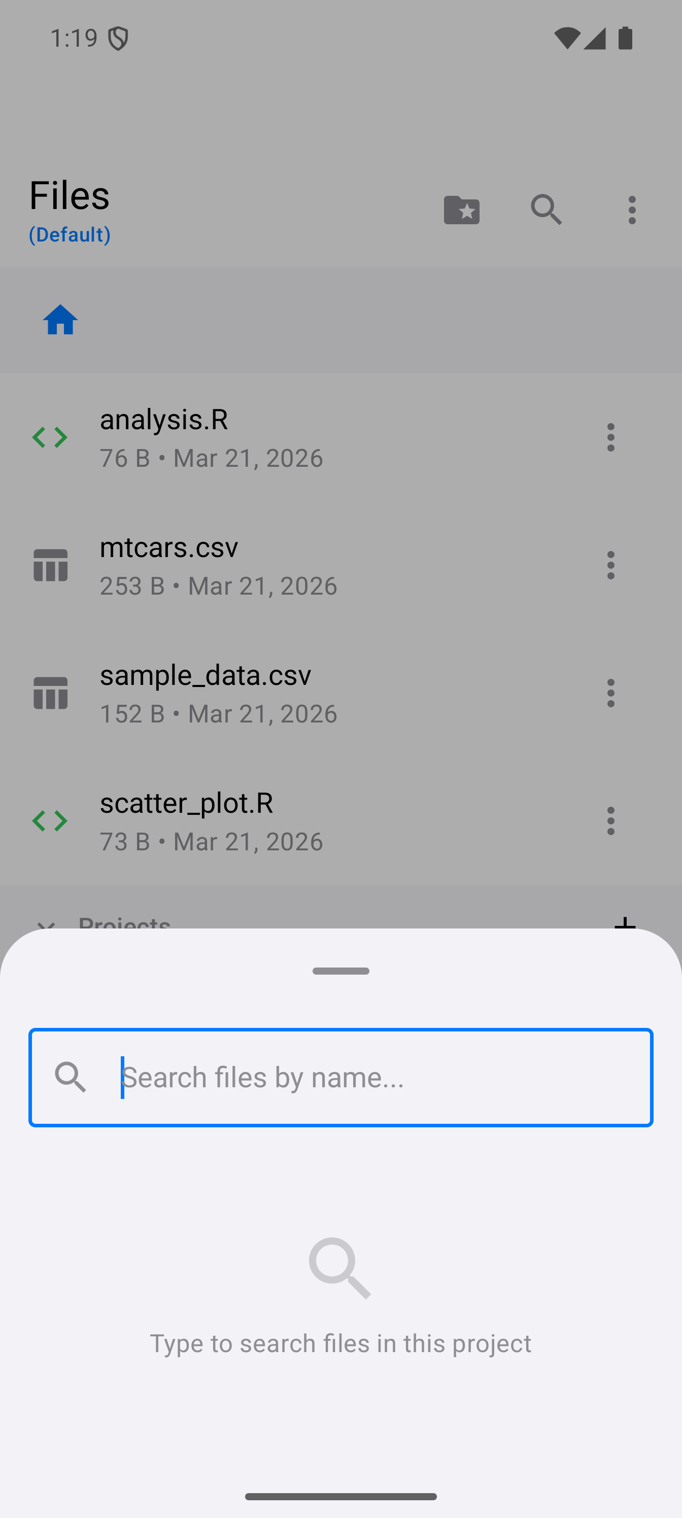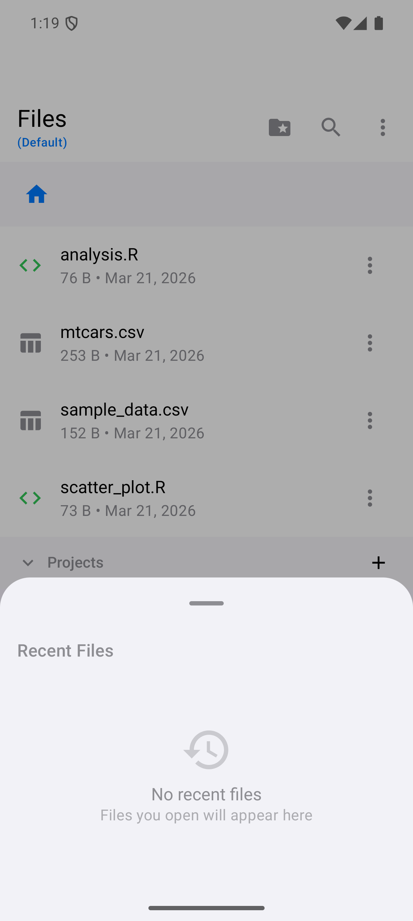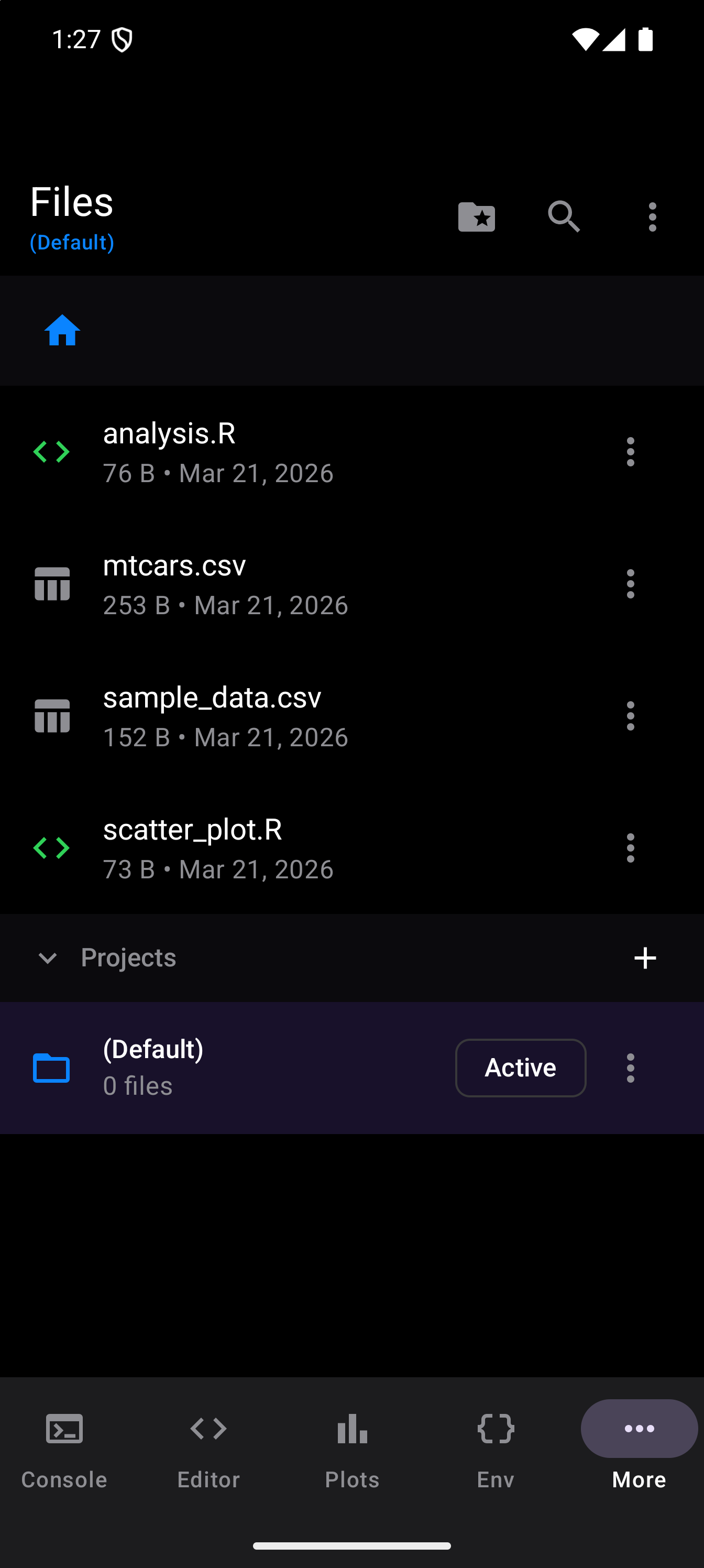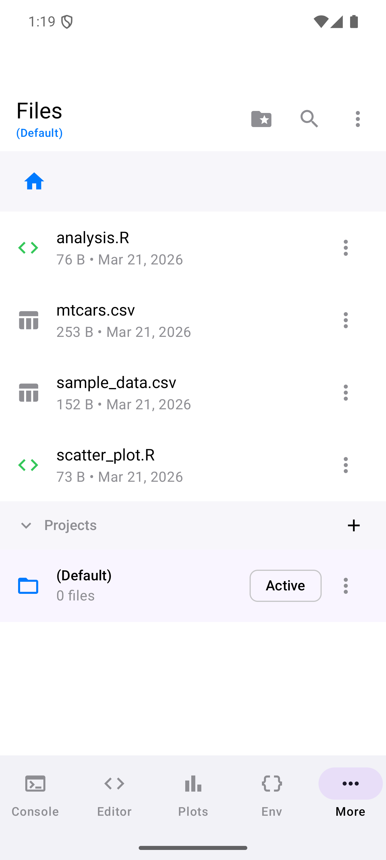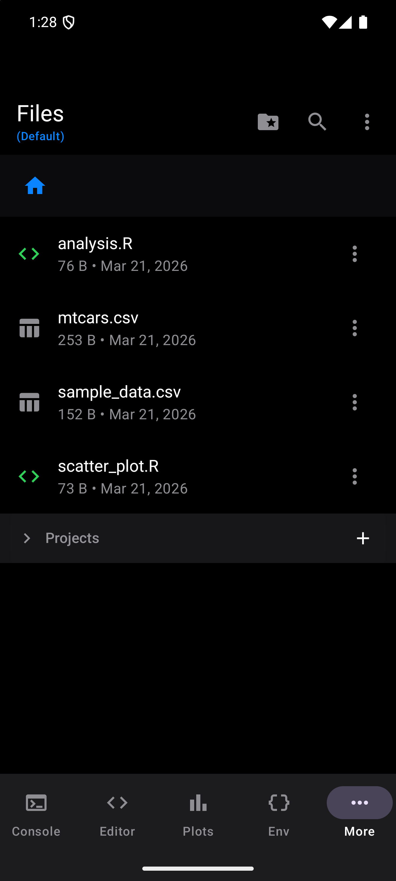 Tapping a text-based file (.R, .txt, .csv, .json, .md) opens it in the Editor. Tapping a folder navigates into it.
