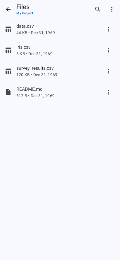 When you open the Files tab, you see the contents of your current project directory. Each row shows the file or folder name, along with its size and last-modified date. Folders display a chevron indicating you can tap to enter them.