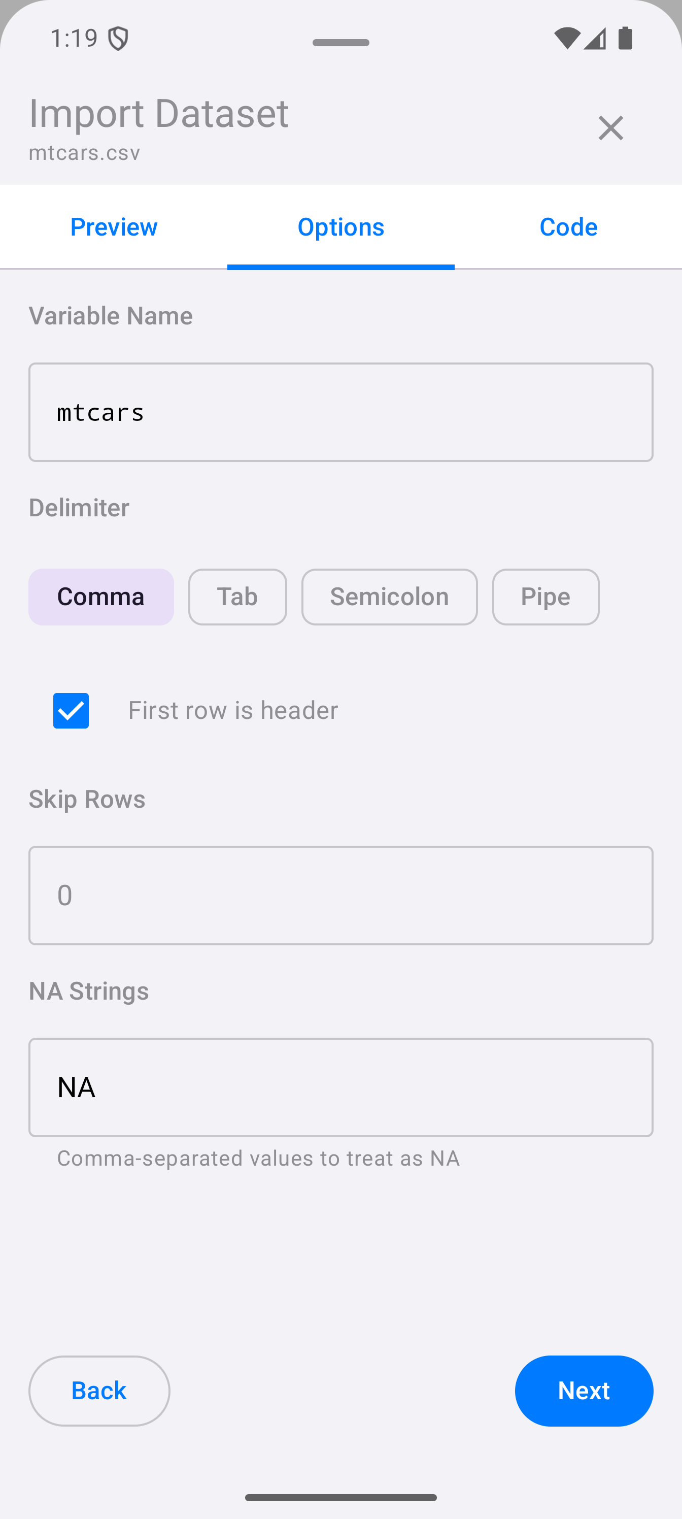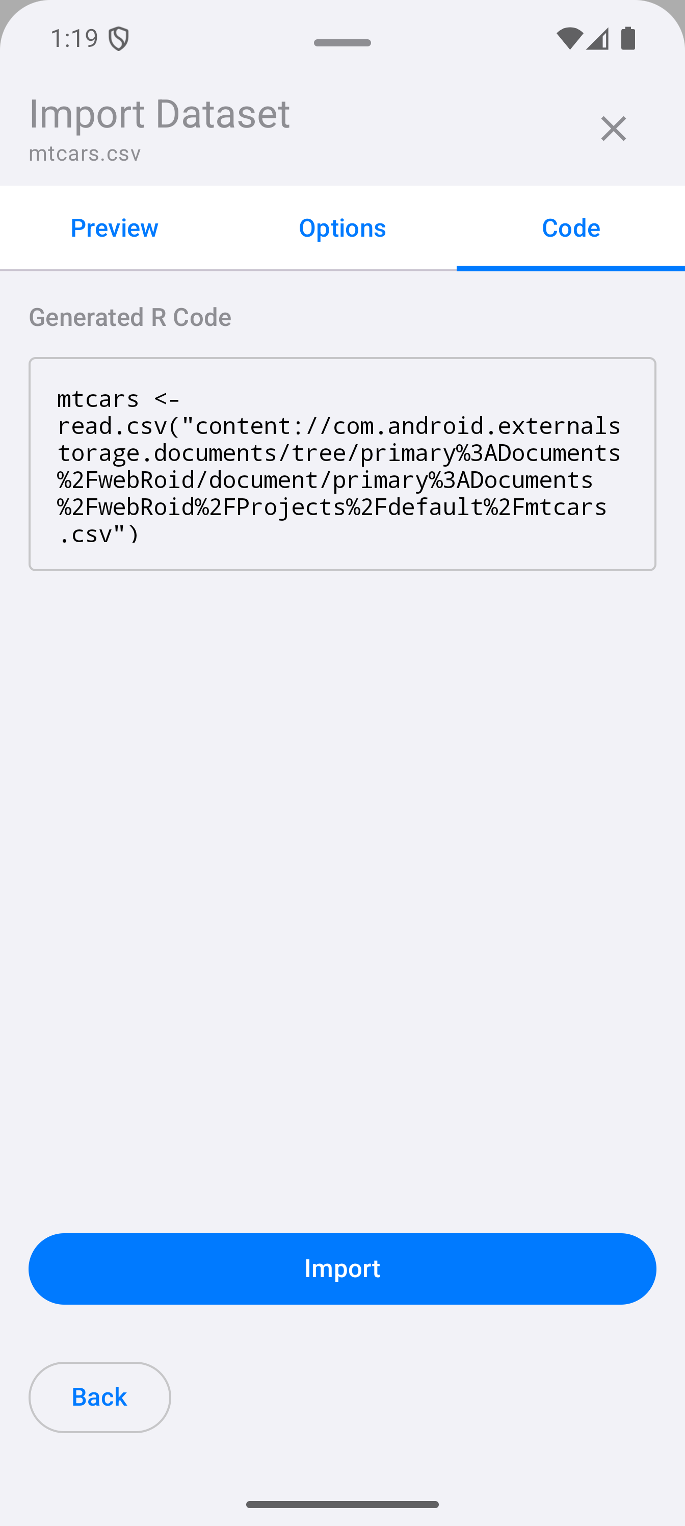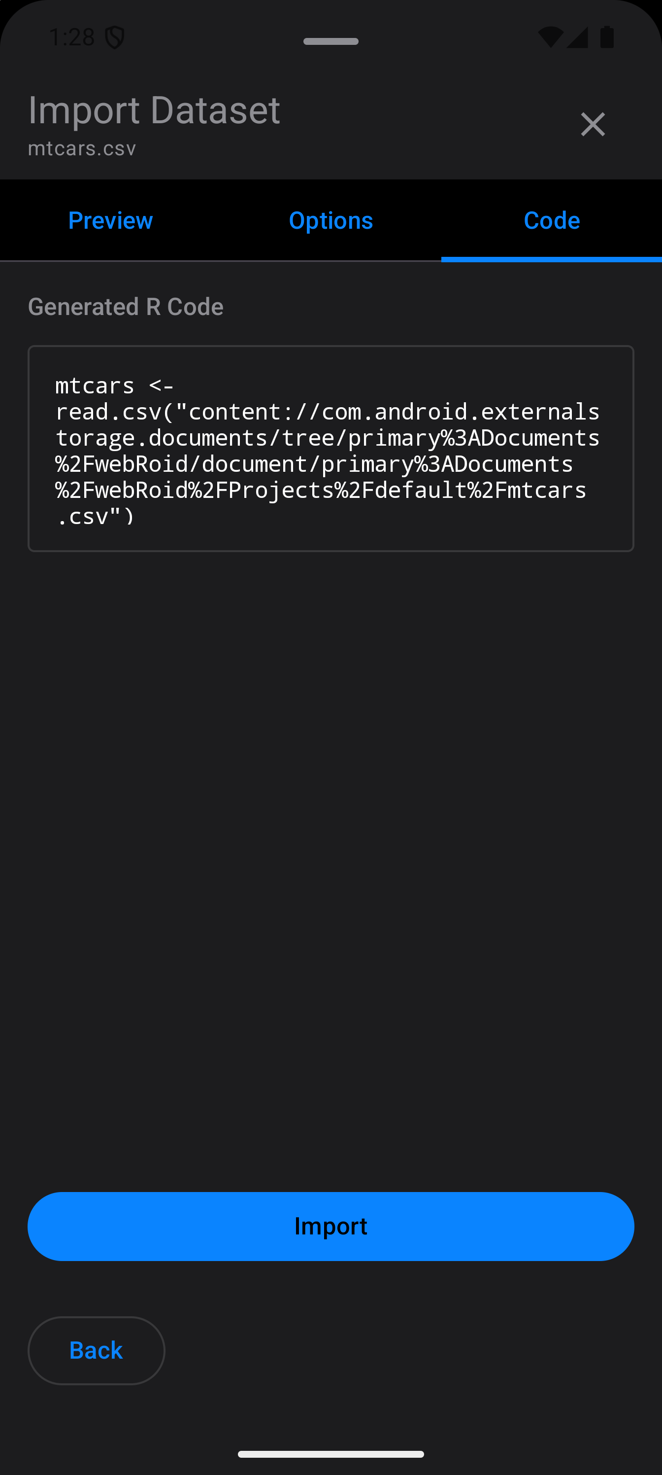 read.csv()orread.delim()call). You can edit the code directly before running it. Tap Import to execute the code and load the data into your R session.
