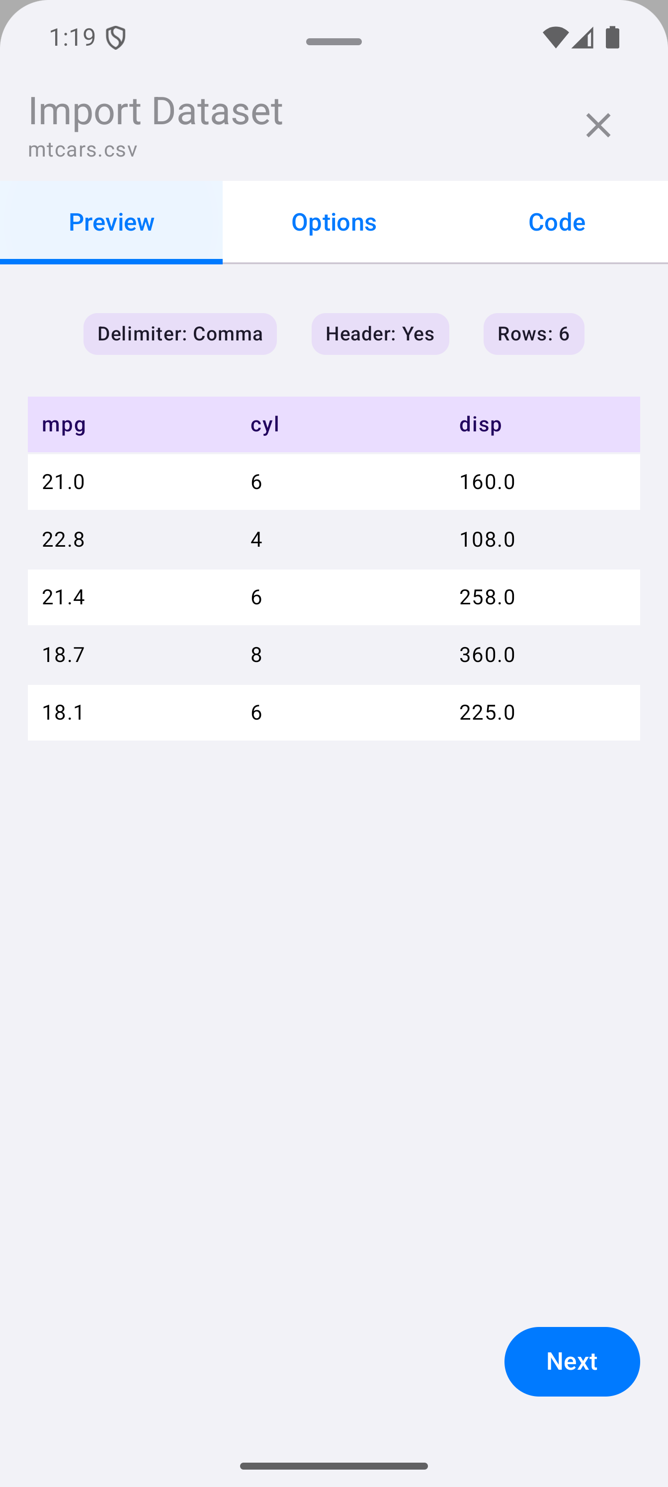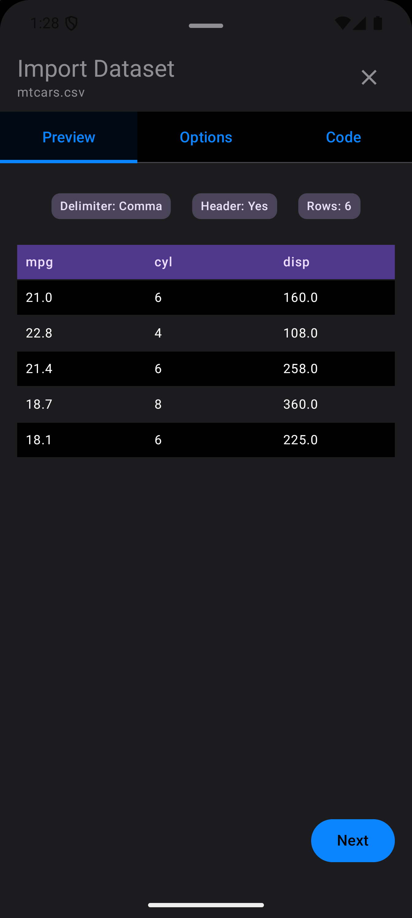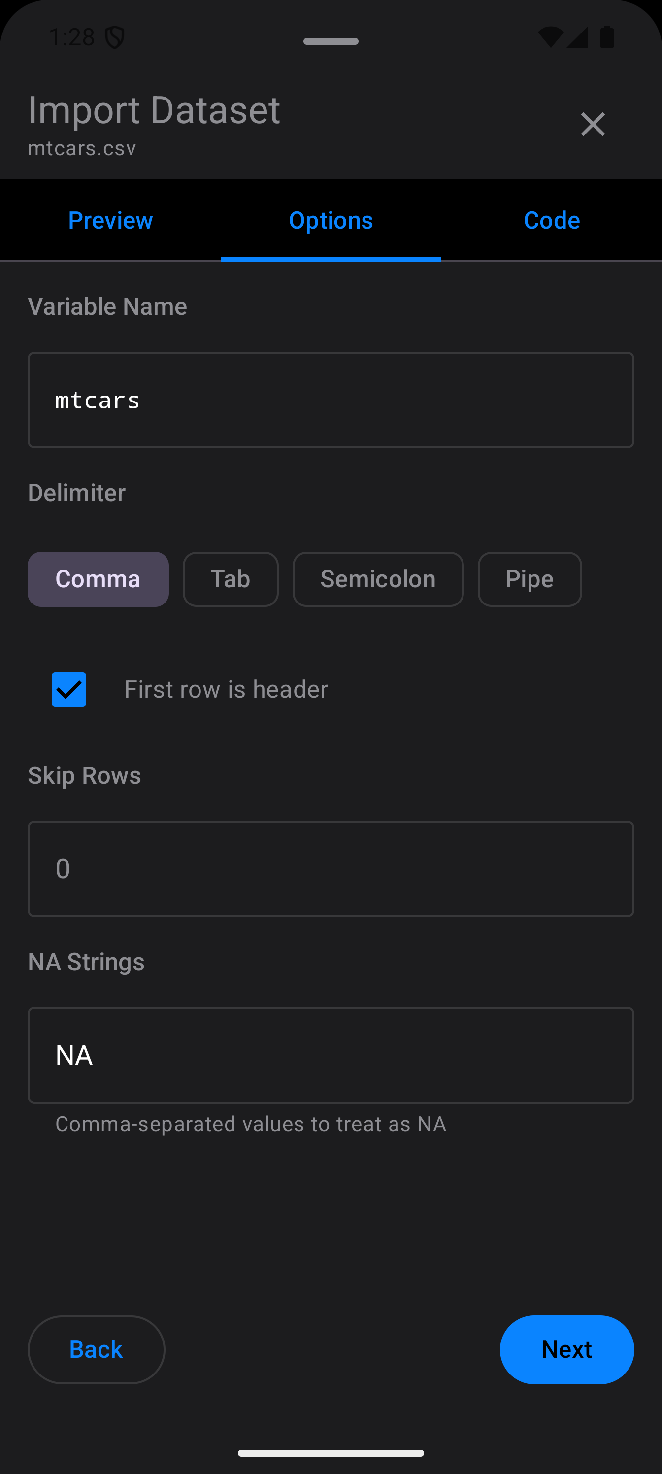 read.csv()orread.delim()call). You can edit the code directly before running it. Tap Import to execute the code and load the data into your R session.