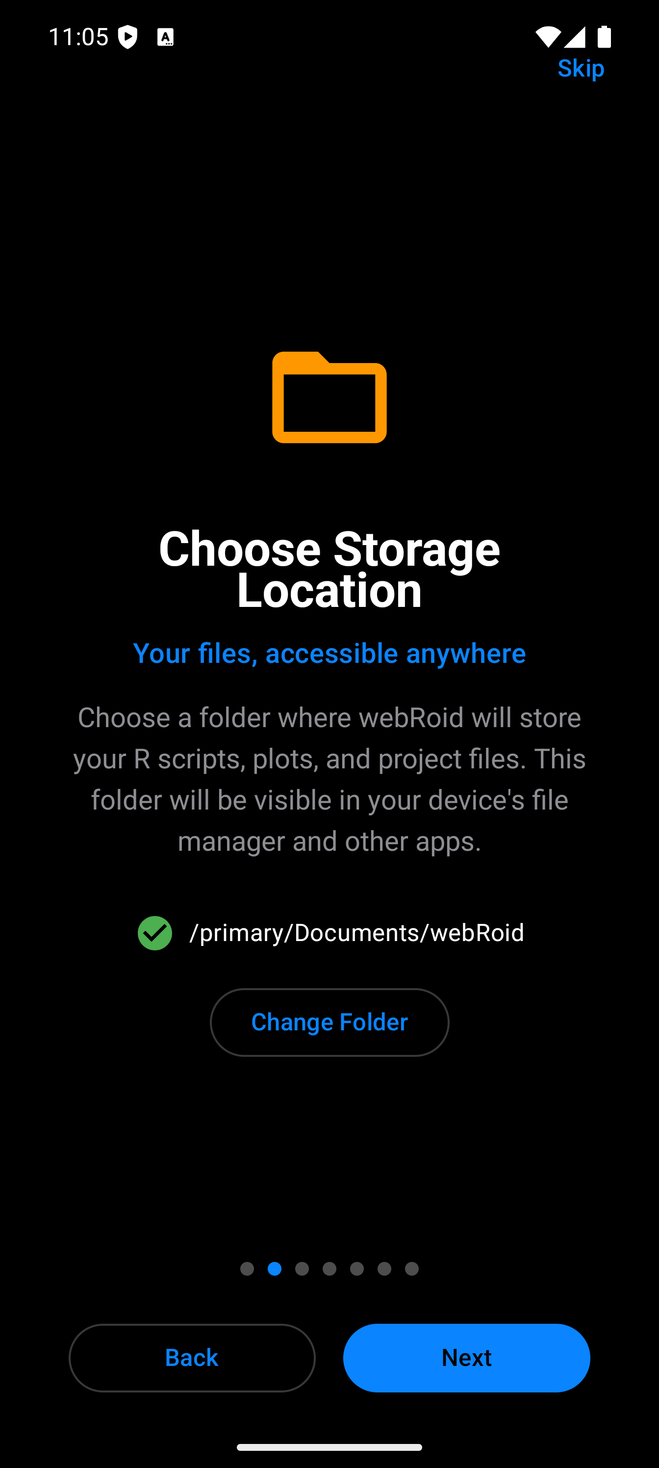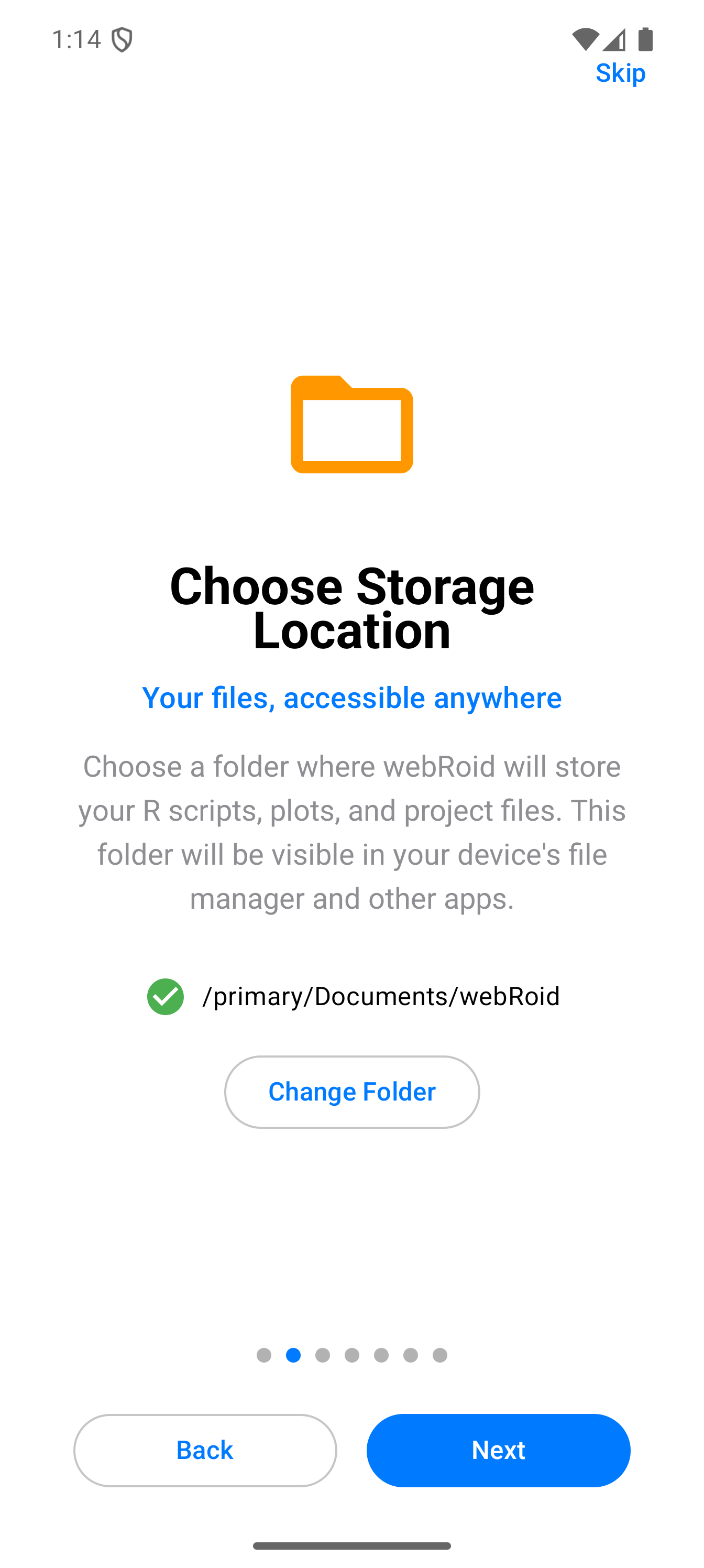 webRoid stores files using Android’s Storage Access Framework (SAF). During first launch, you are prompted to choose a storage folder where webRoid will keep your R scripts, plots, and project files. This folder is visible in your device’s file manager and other apps.