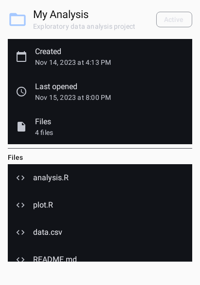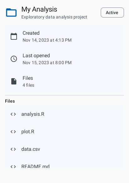 Projects are a good way to keep unrelated analyses separate. Each project gets its own folder, so file names do not conflict across projects.