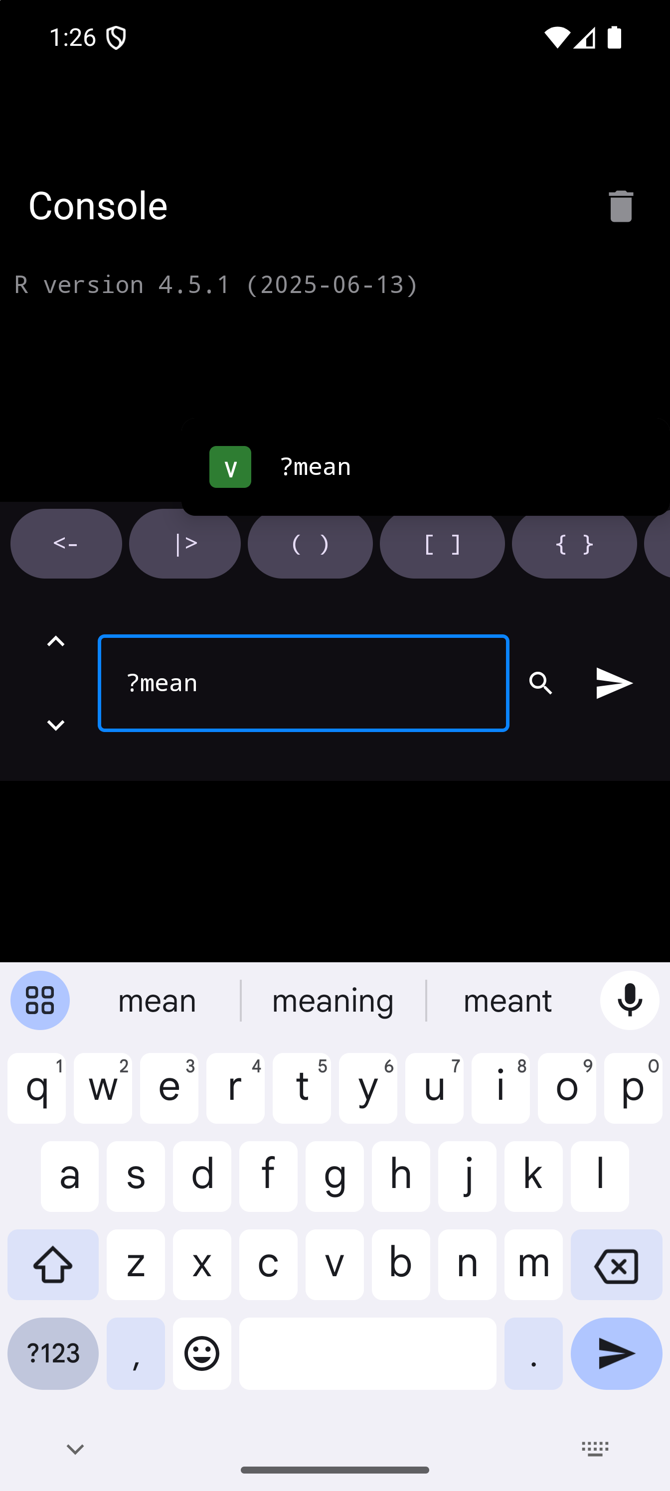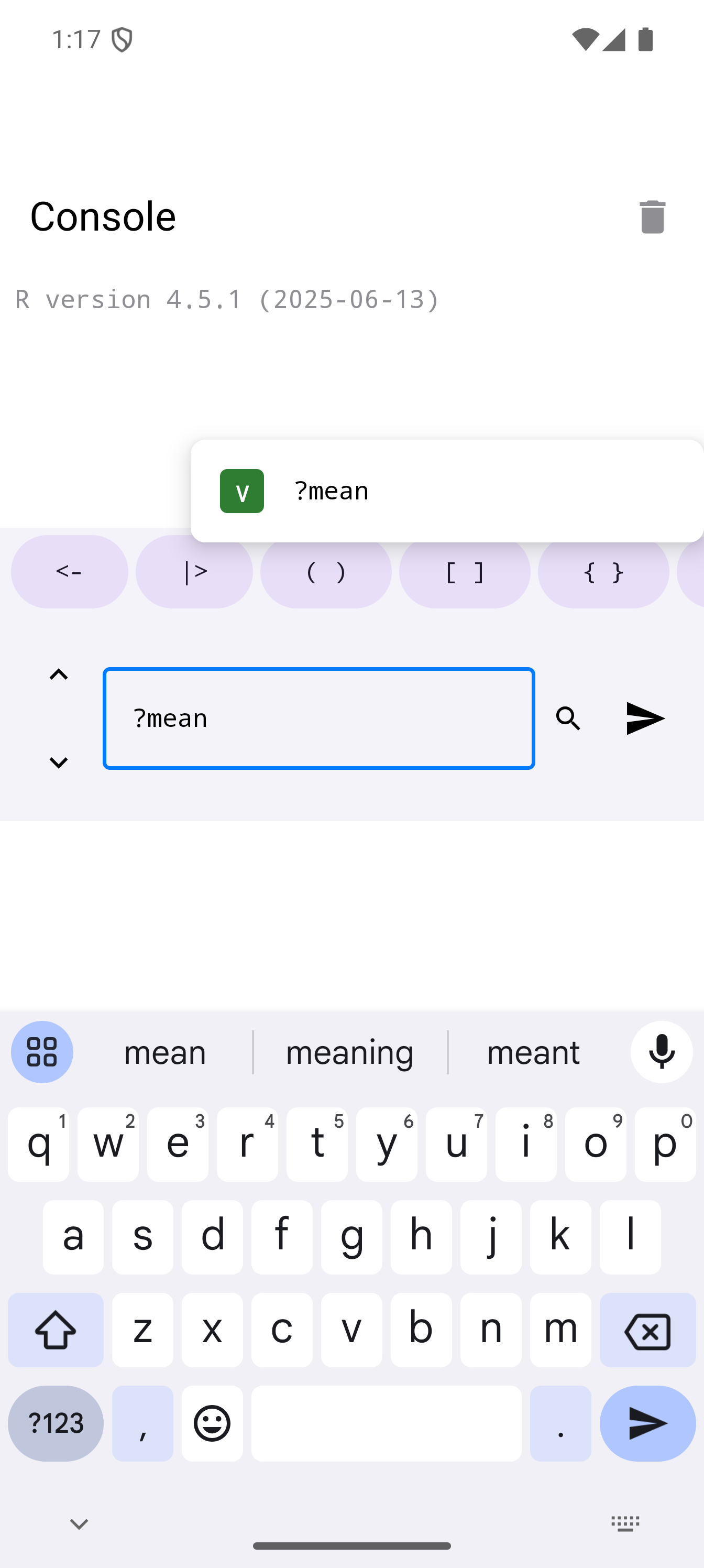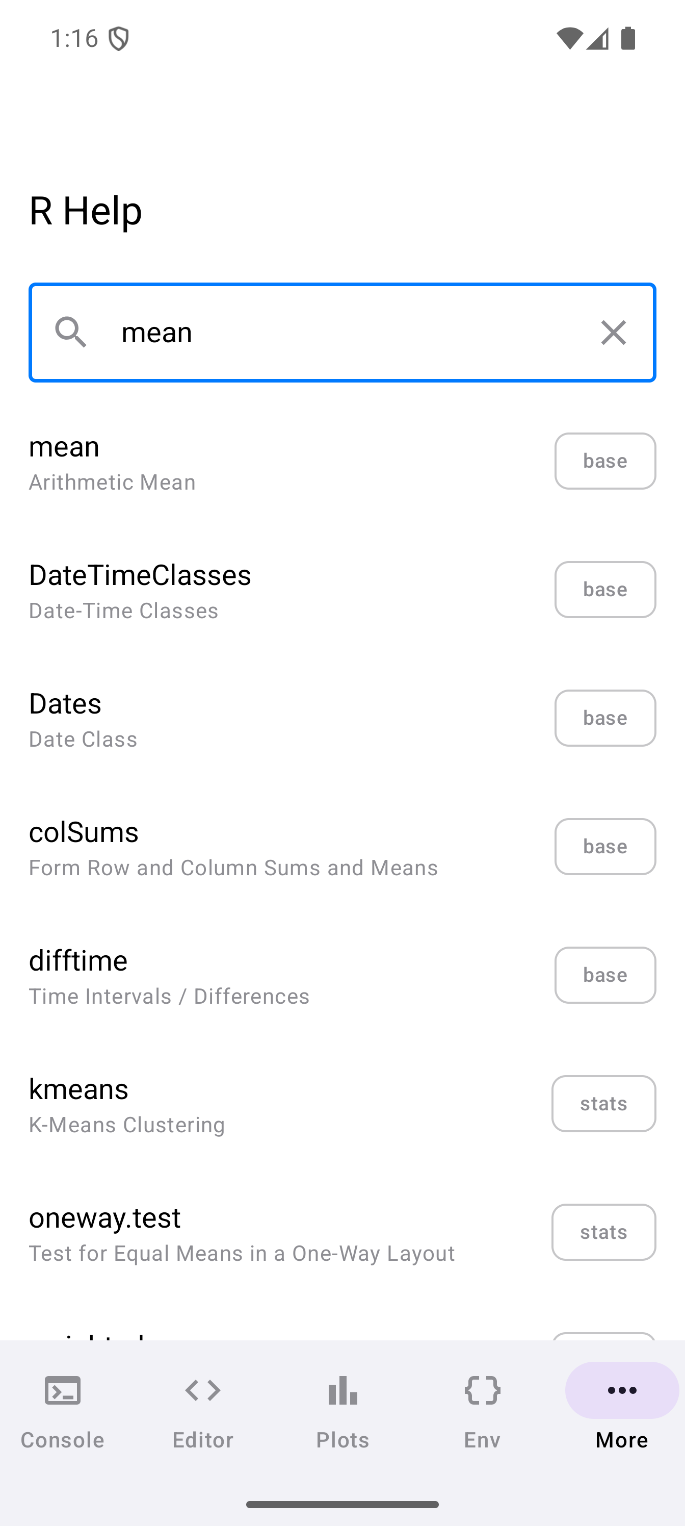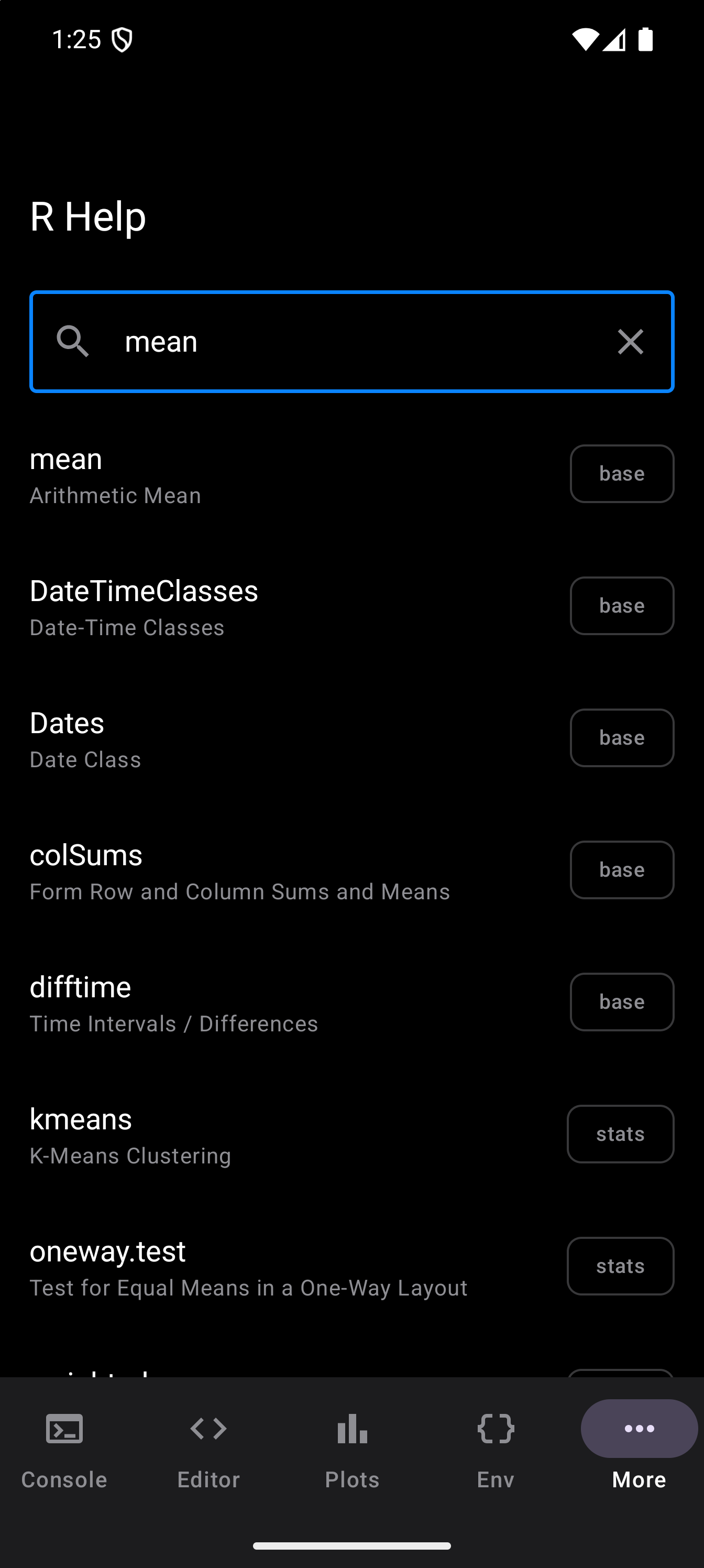 - Detail view: opens when you select a search result. Displays the full help page for a function or topic. The toolbar title changes to show the current topic (e.g., “base::mean”), and a back arrow lets you return to the search view.