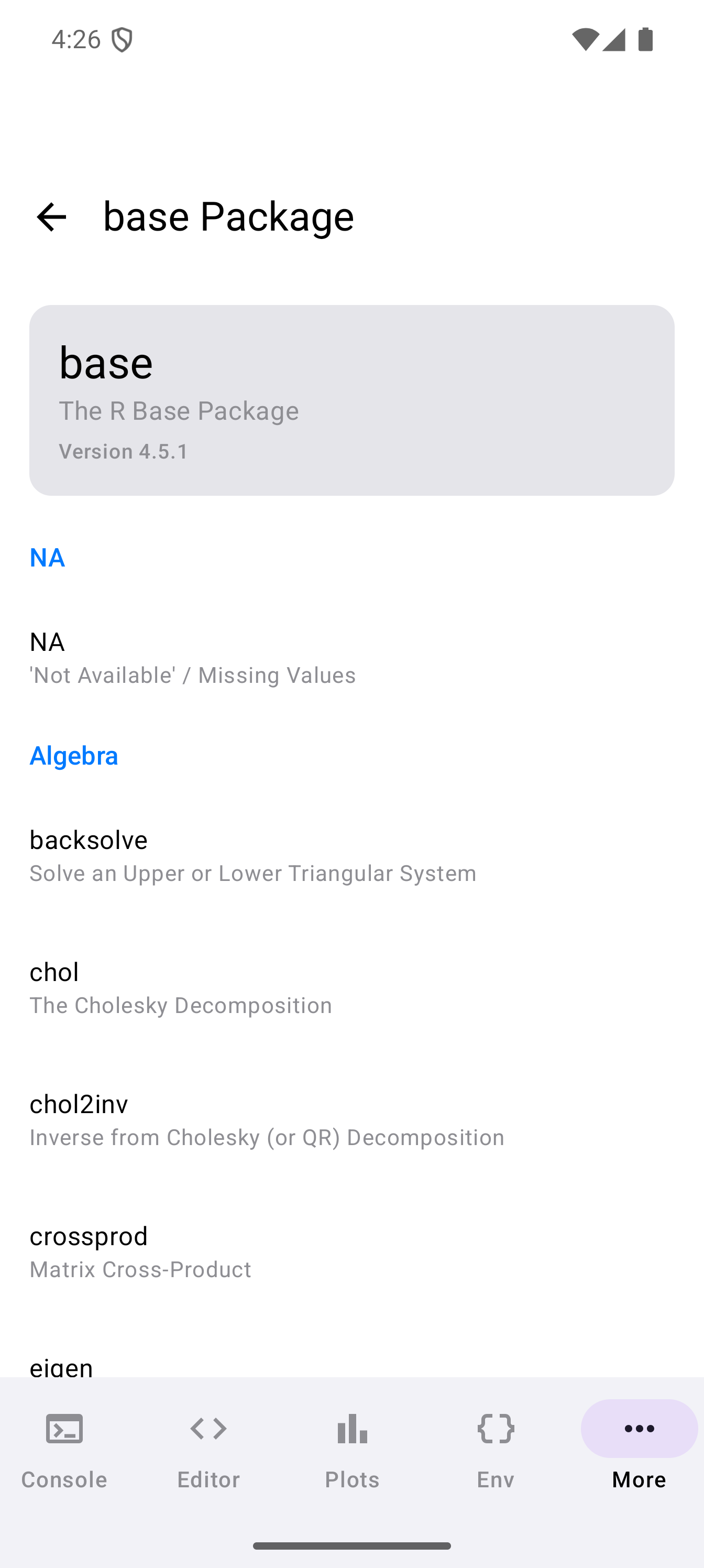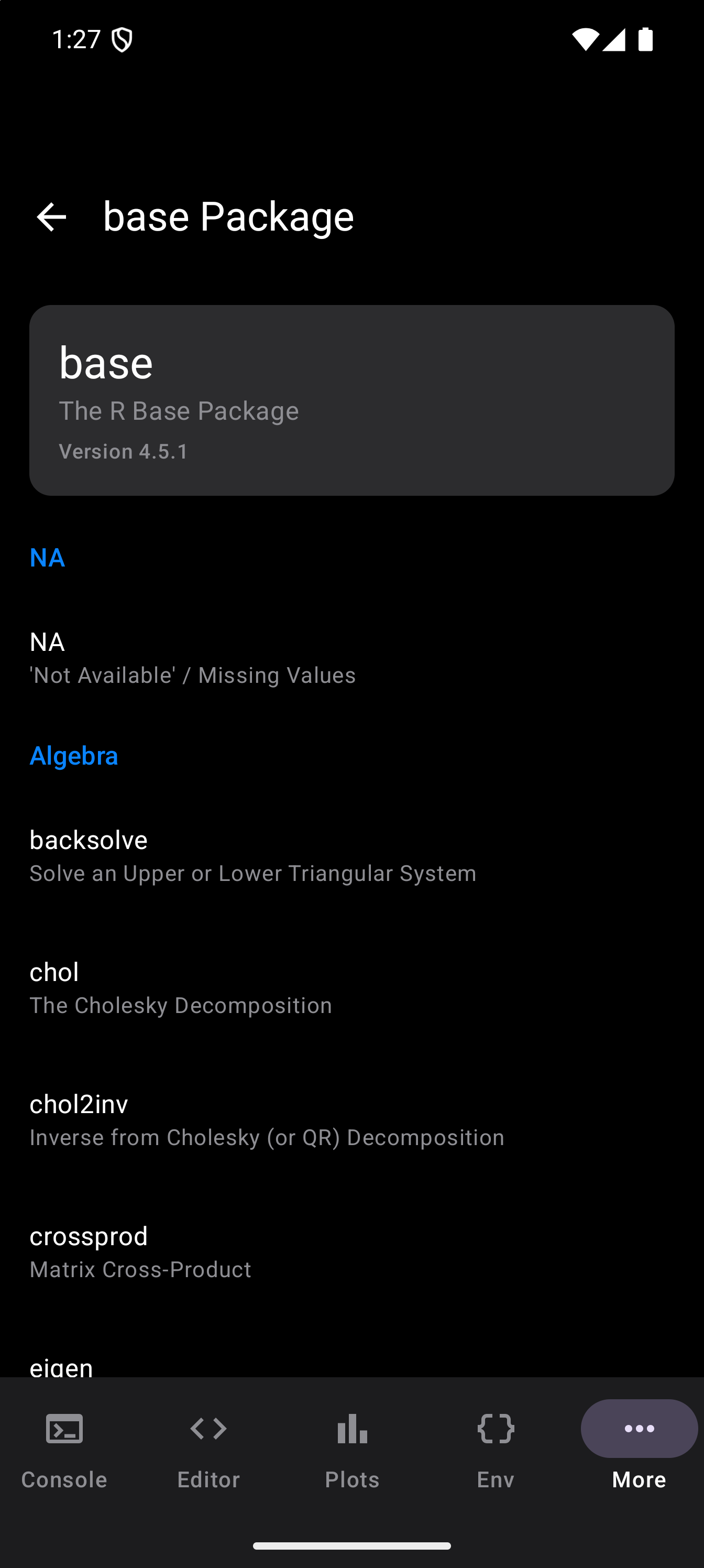 From any help page, tap Run Examples to execute the function’s built-in examples. The code is sent to the Console via example("function_name", package = "pkg") and the results (including any plots) appear in the Console and Plots tabs respectively.