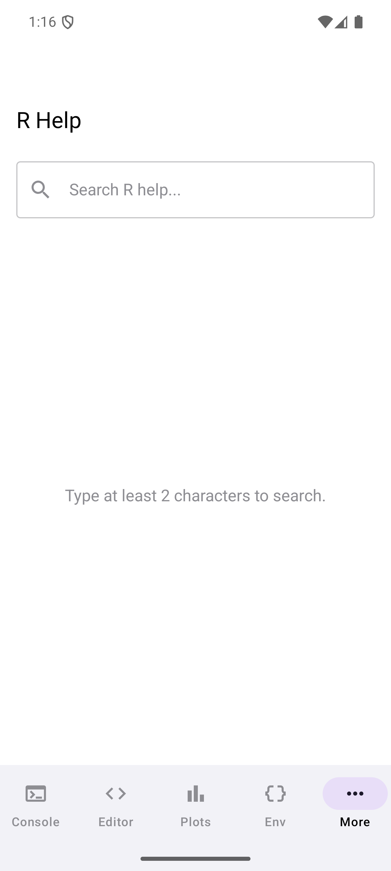 help(package = "ggplot2")This displays an index of every documented function and dataset in the package, with brief descriptions. Tap any entry to read its full help page.