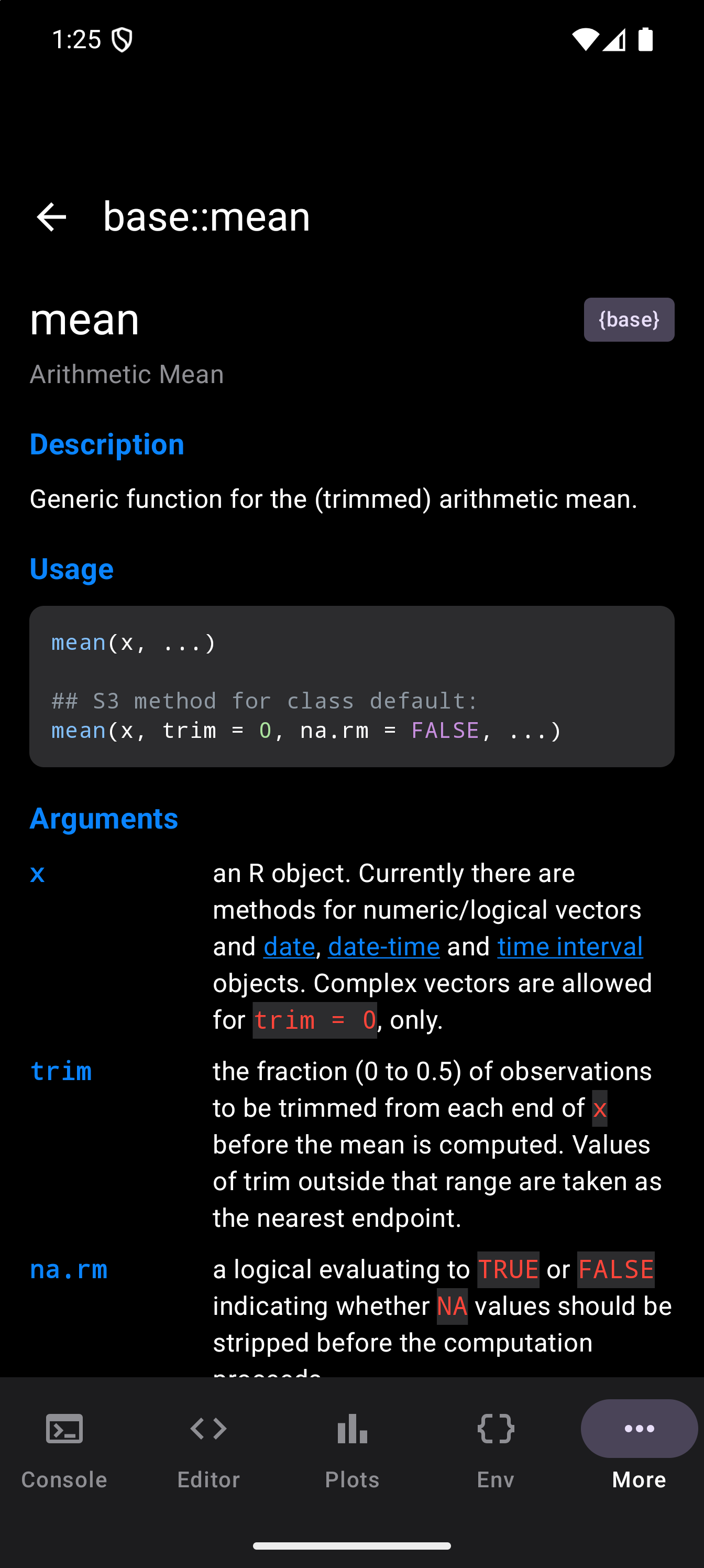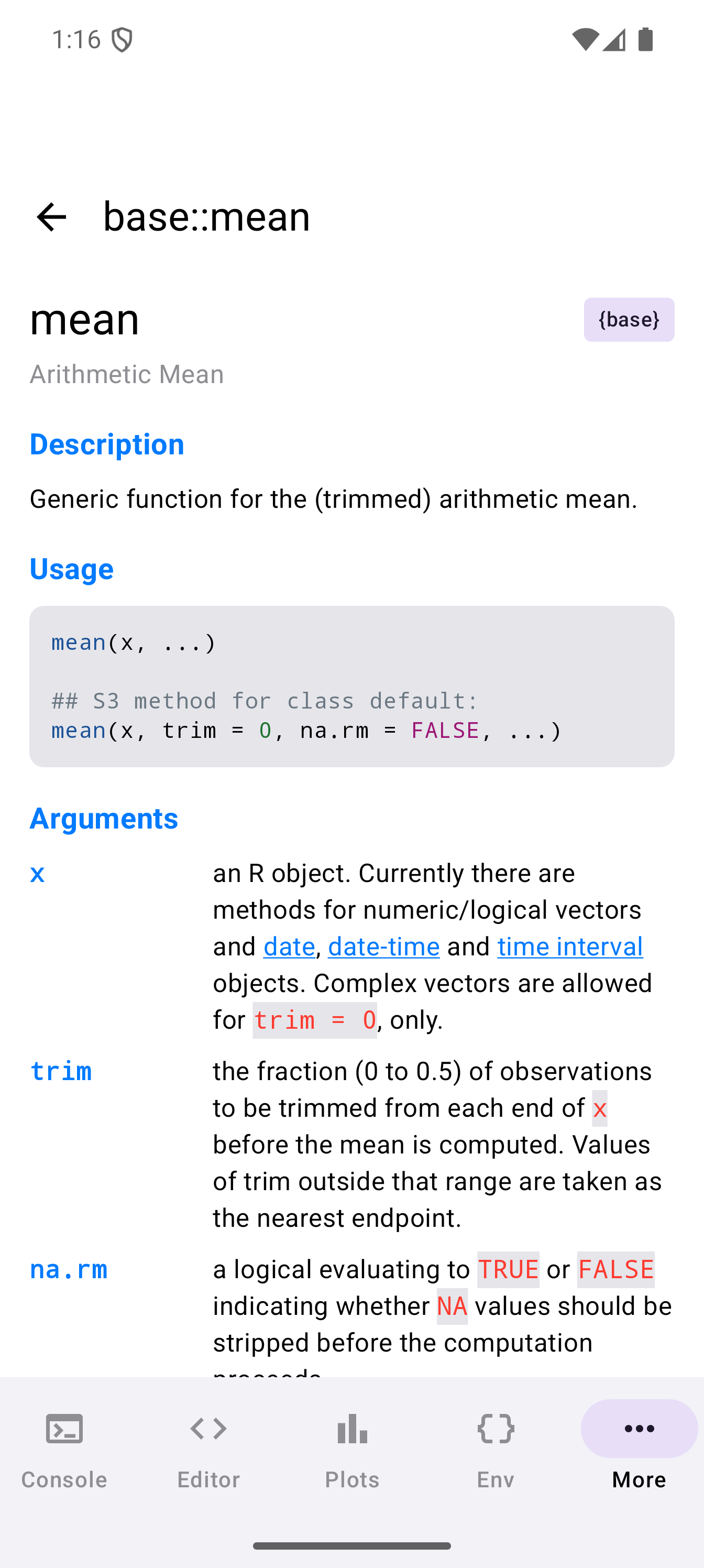 - See Also: links to related functions (these are tappable and navigate to the referenced help page)