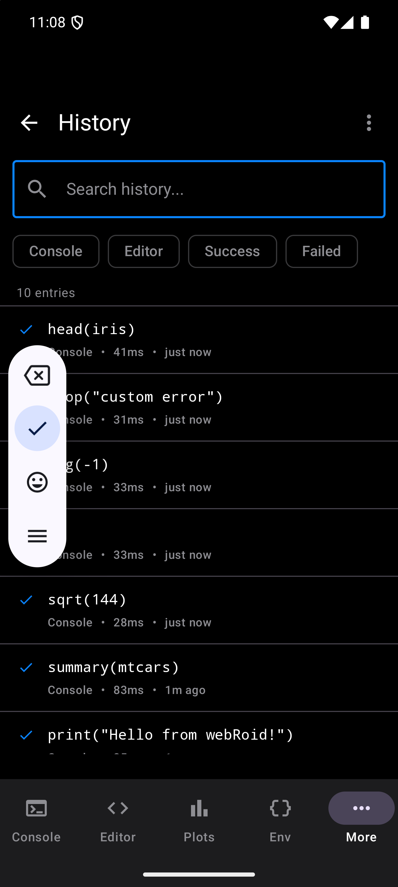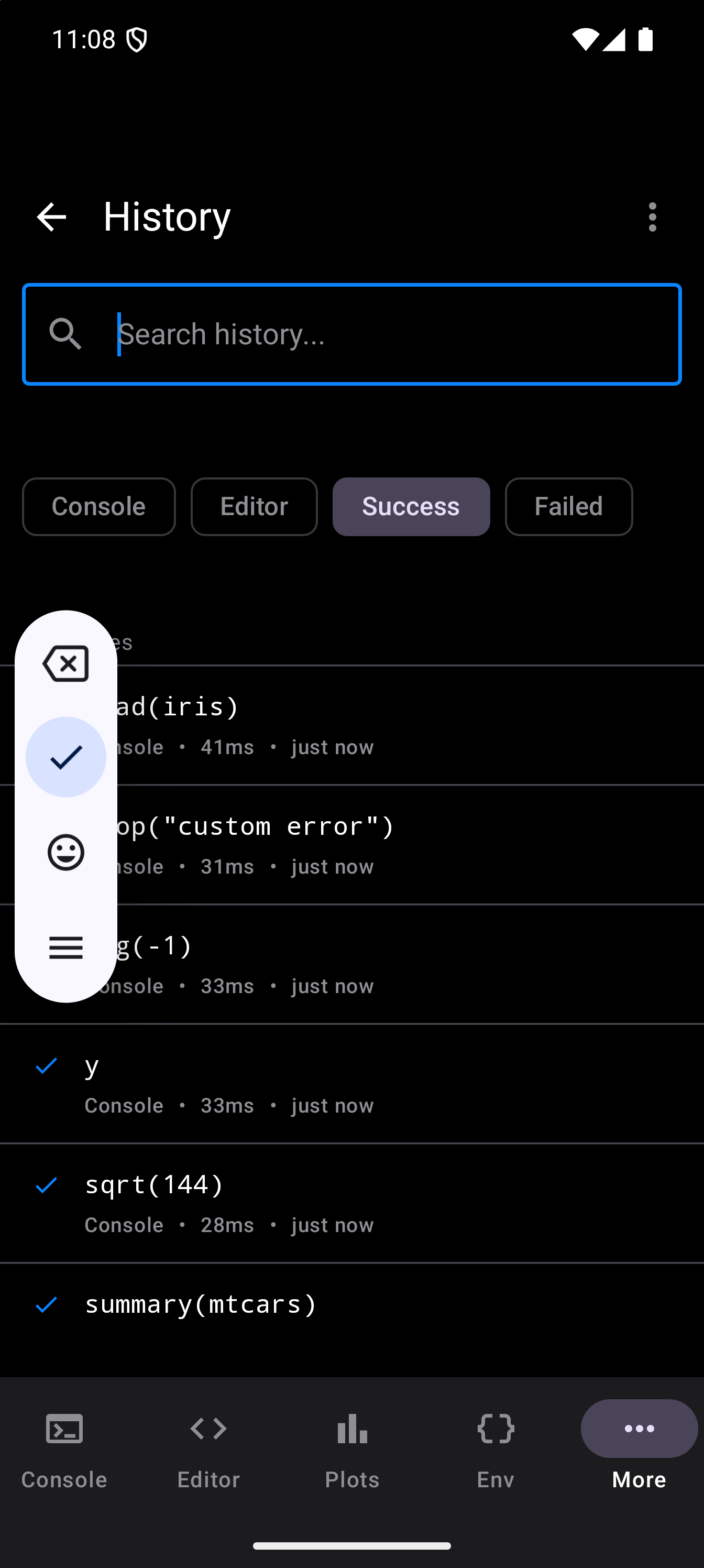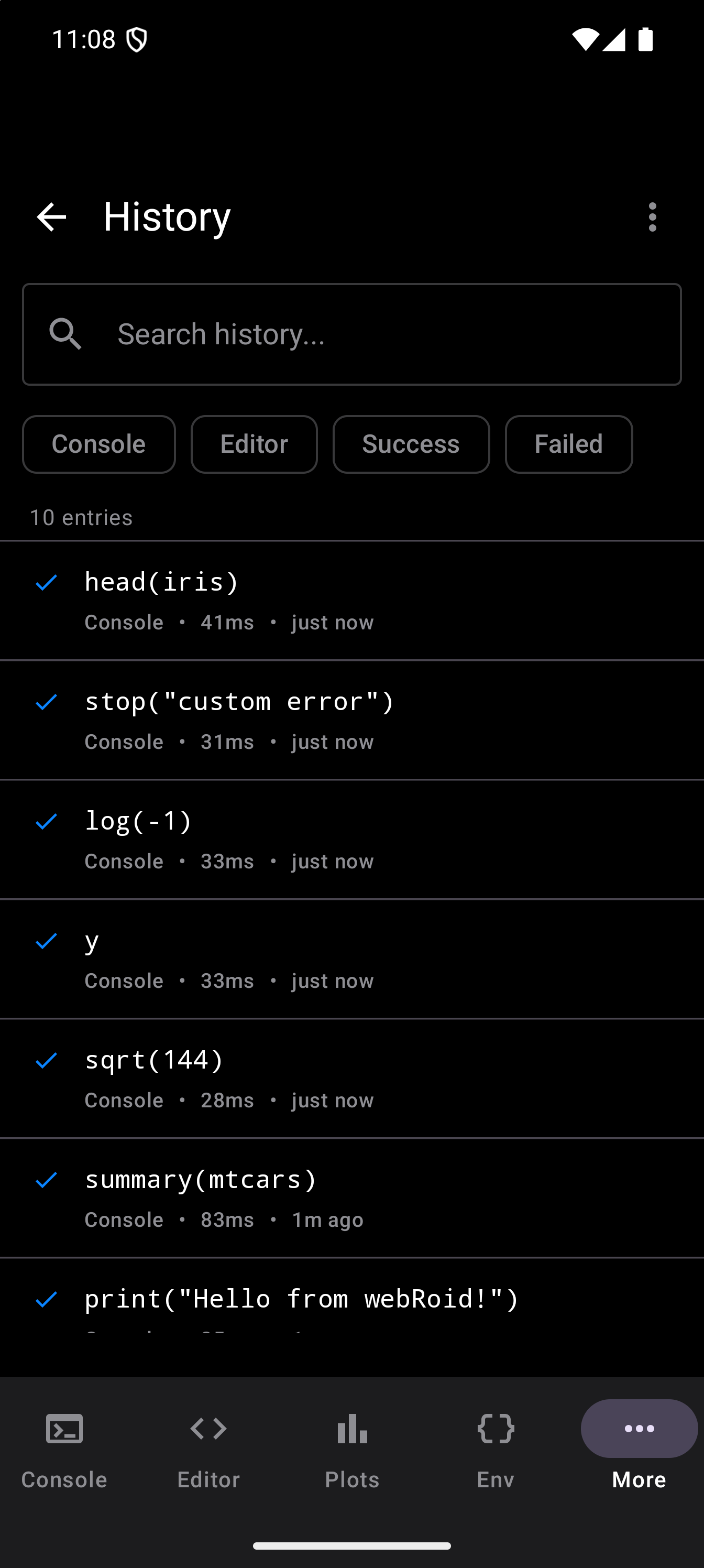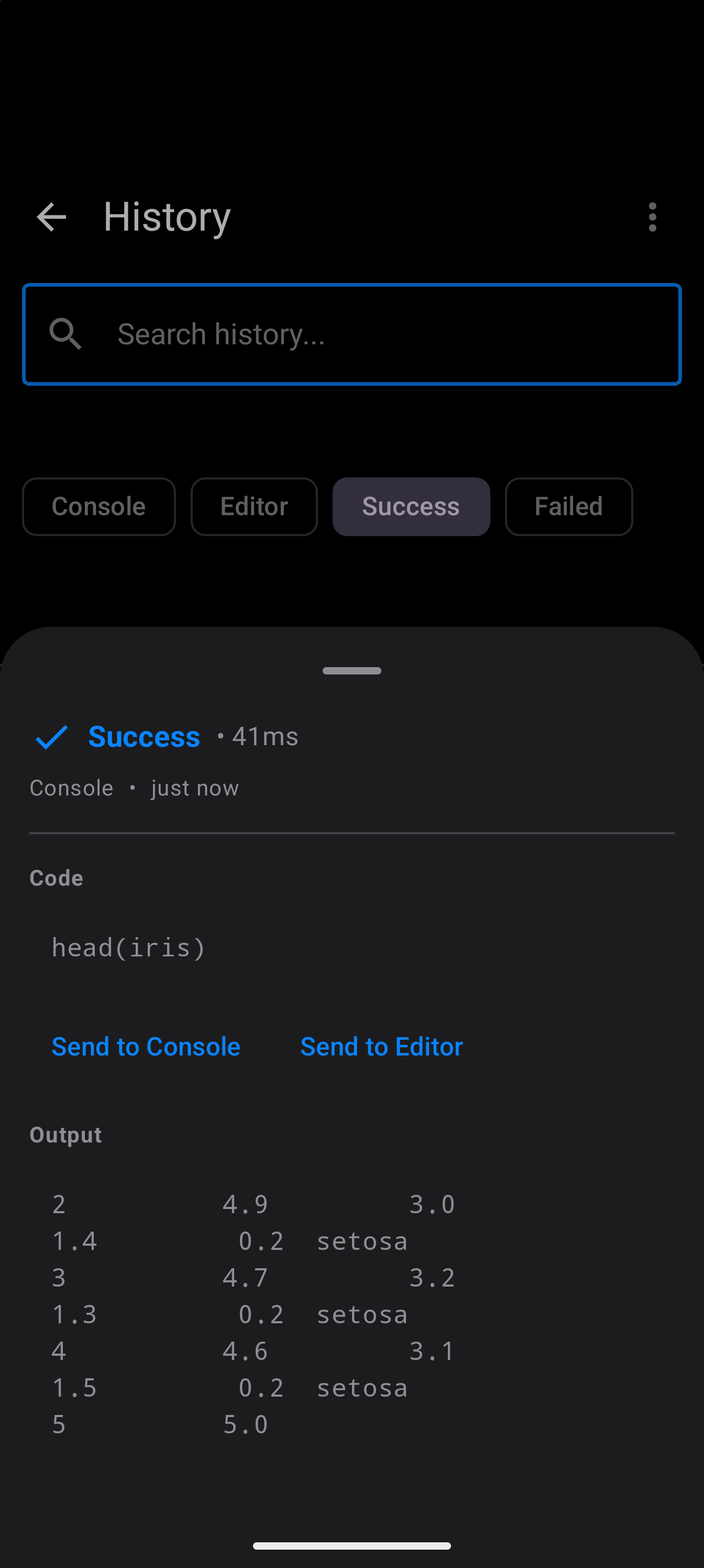 The History screen keeps a complete record of every R command you have executed, whether from the Console or the Editor. You can search past commands, filter by source or outcome, review execution statistics, and send any previous command back to the Console or Editor with a single tap.