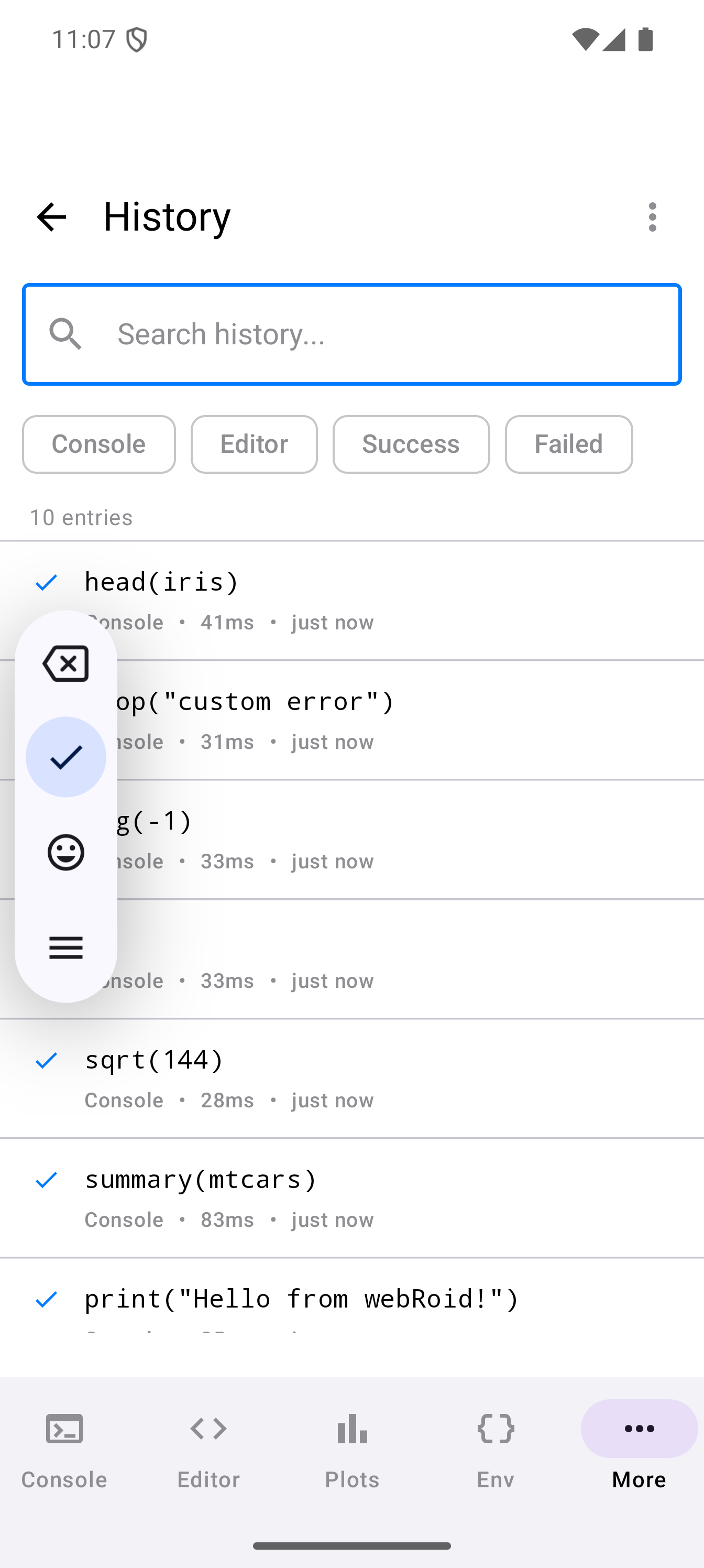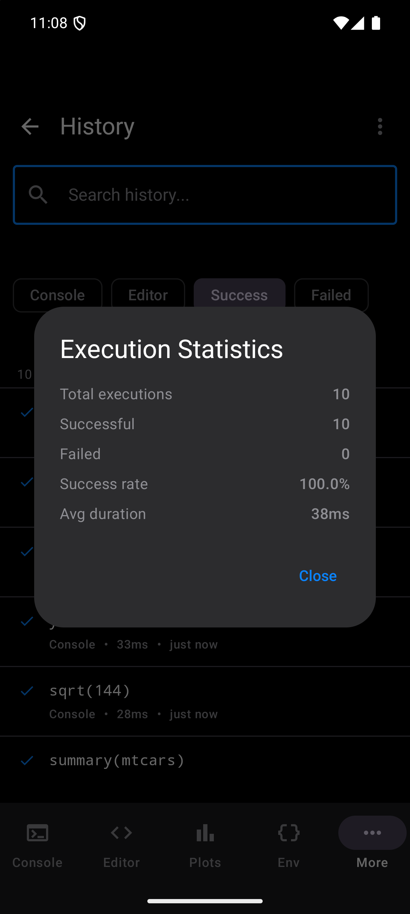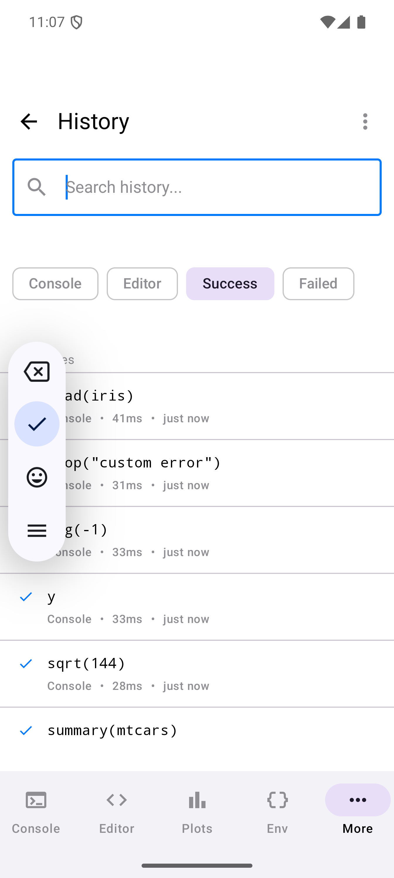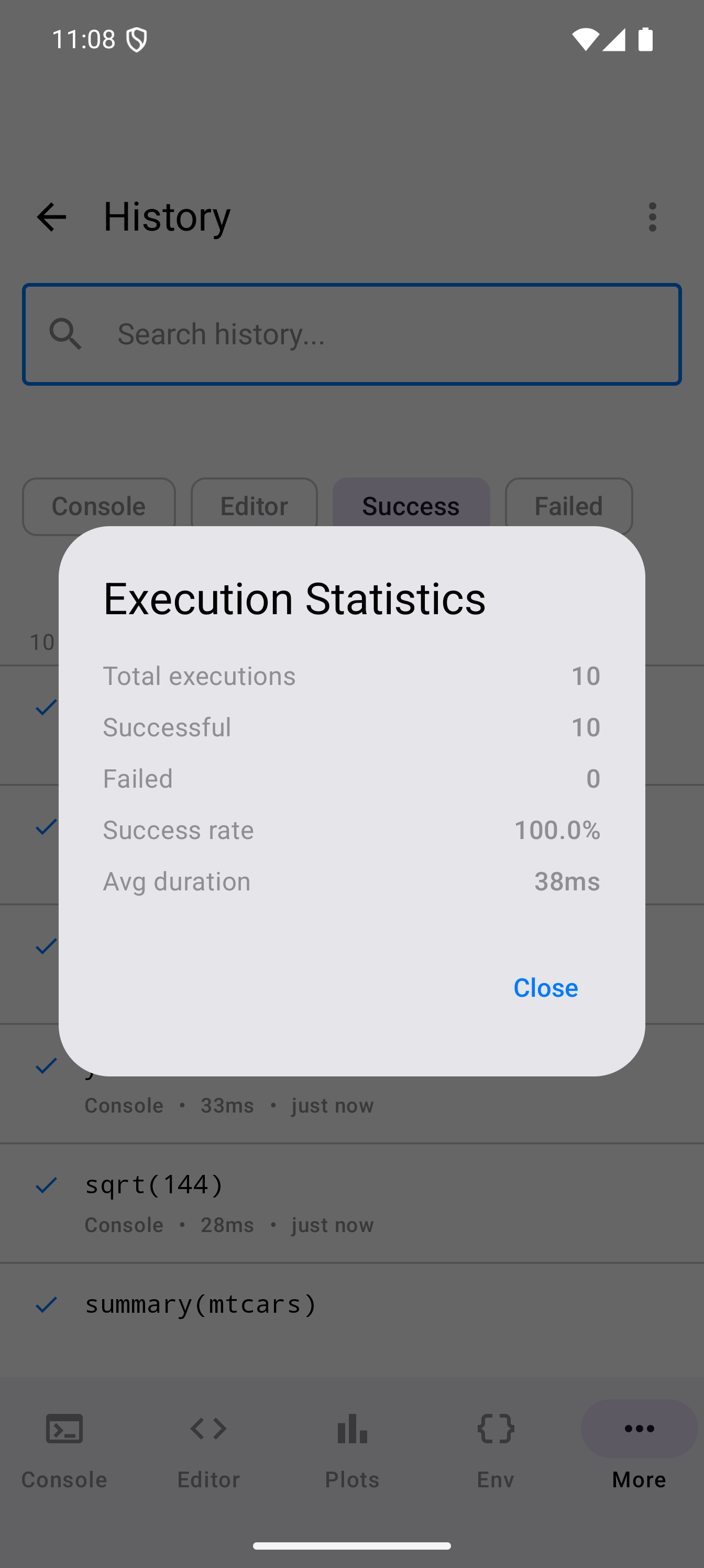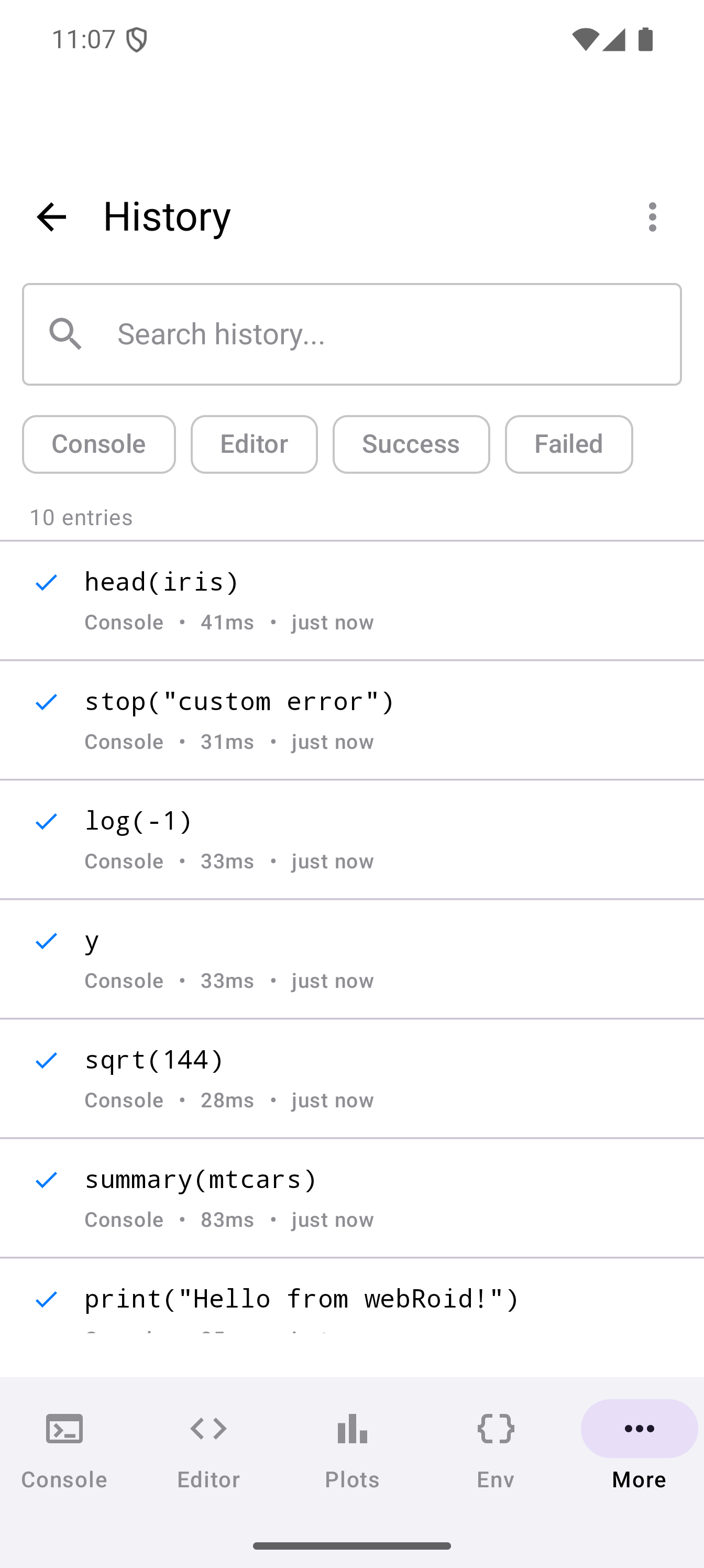 The History screen keeps a complete record of every R command you have executed, whether from the Console or the Editor. You can search past commands, filter by source or outcome, review execution statistics, and send any previous command back to the Console or Editor with a single tap.