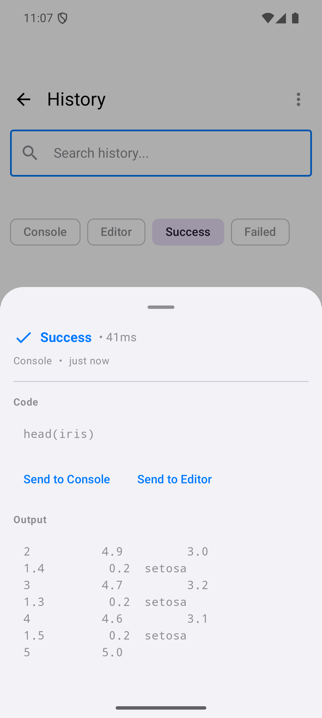 Tap Send to Console to copy the command into the Console input field. The History screen closes and the Console appears with the code ready to run. This is useful for re-running or tweaking a previous command.