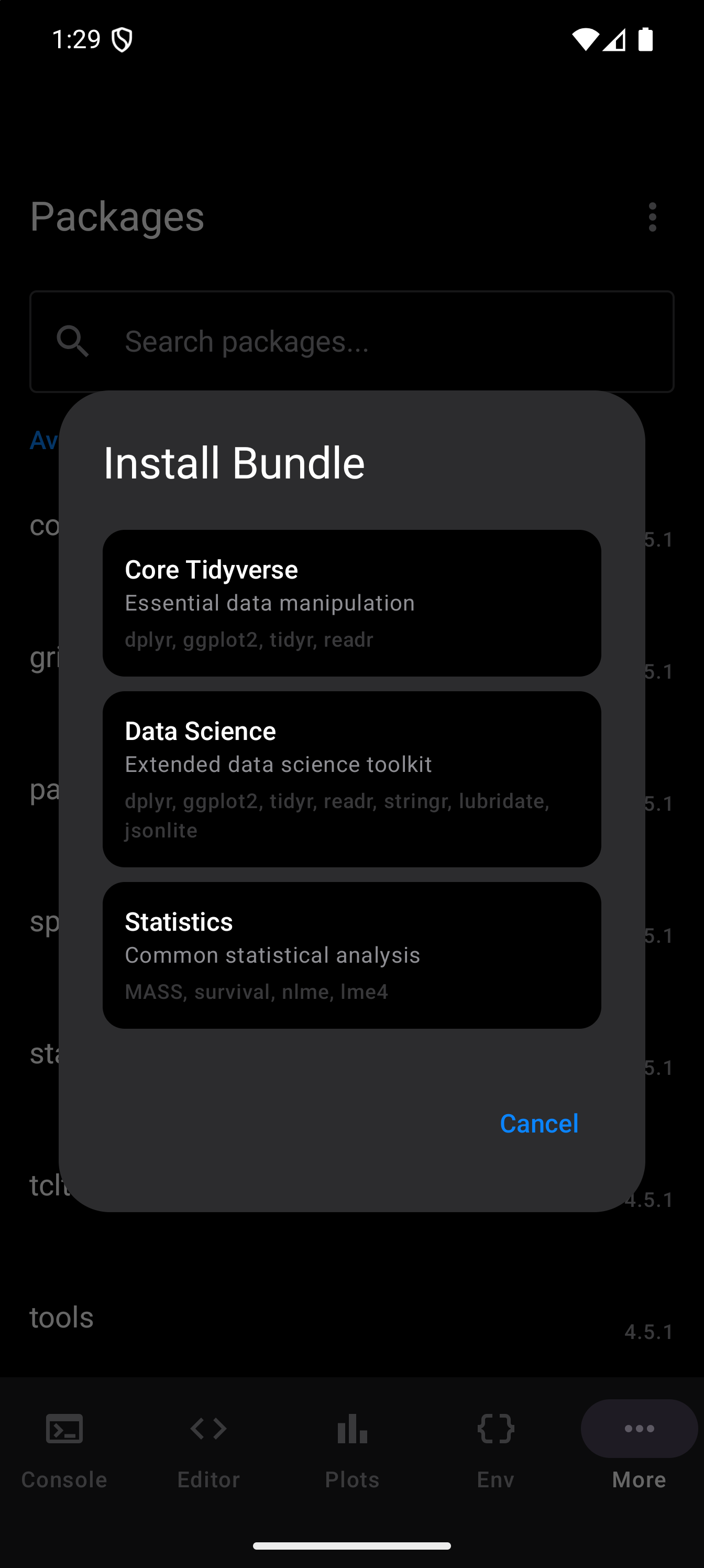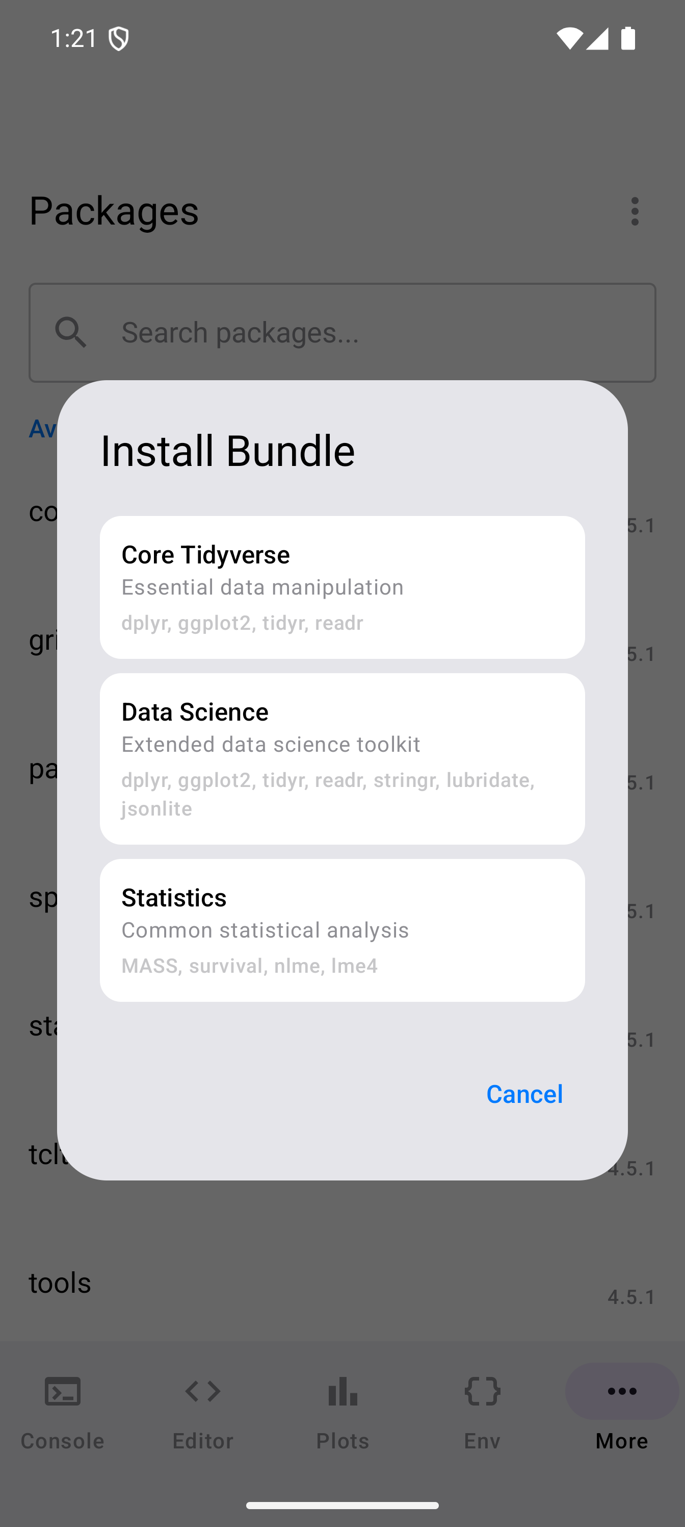 Bundles are a quick way to bootstrap a new session. If you mainly do data visualization, “Core Tidyverse” is a good starting point. For general-purpose data science work, the “Data Science” bundle covers most common needs.