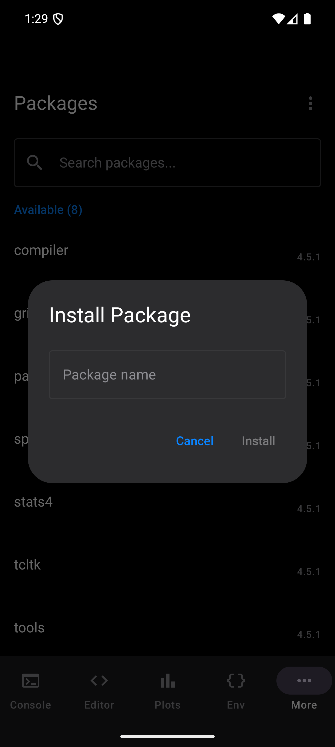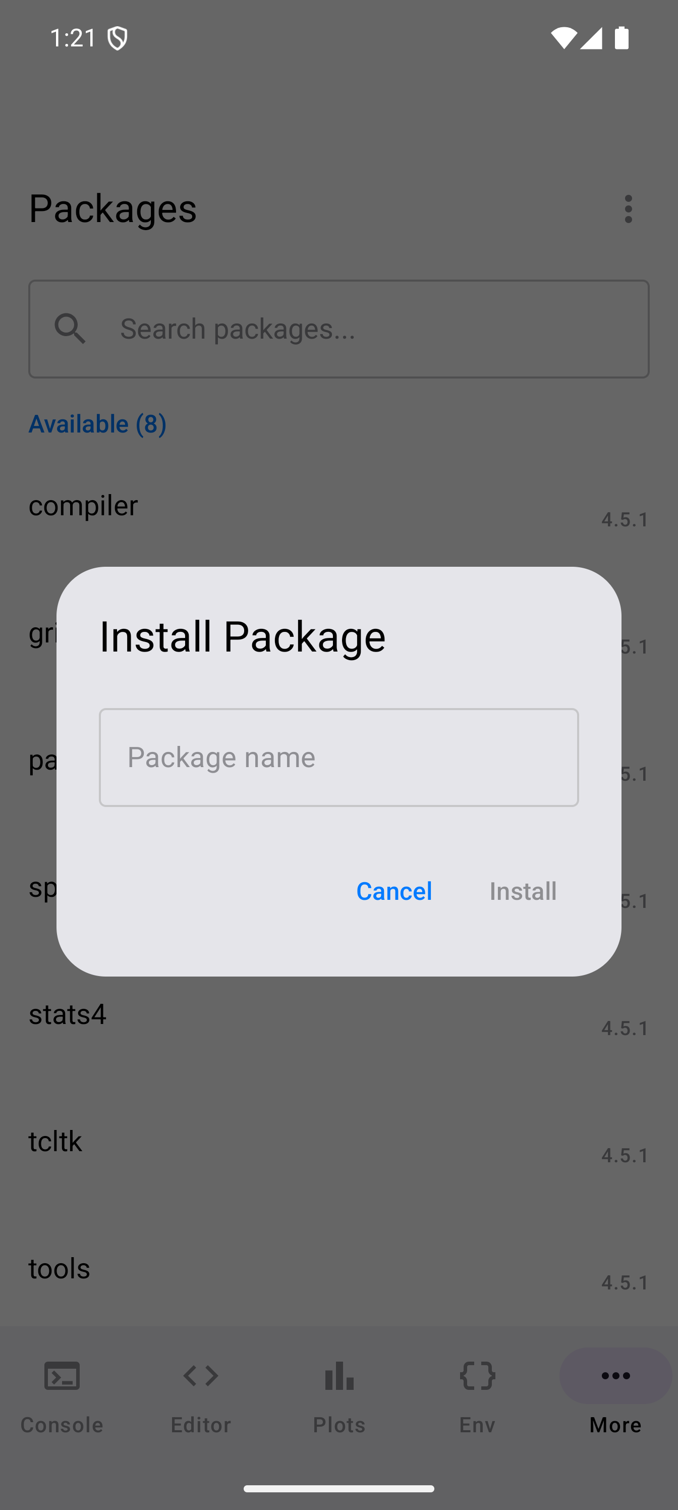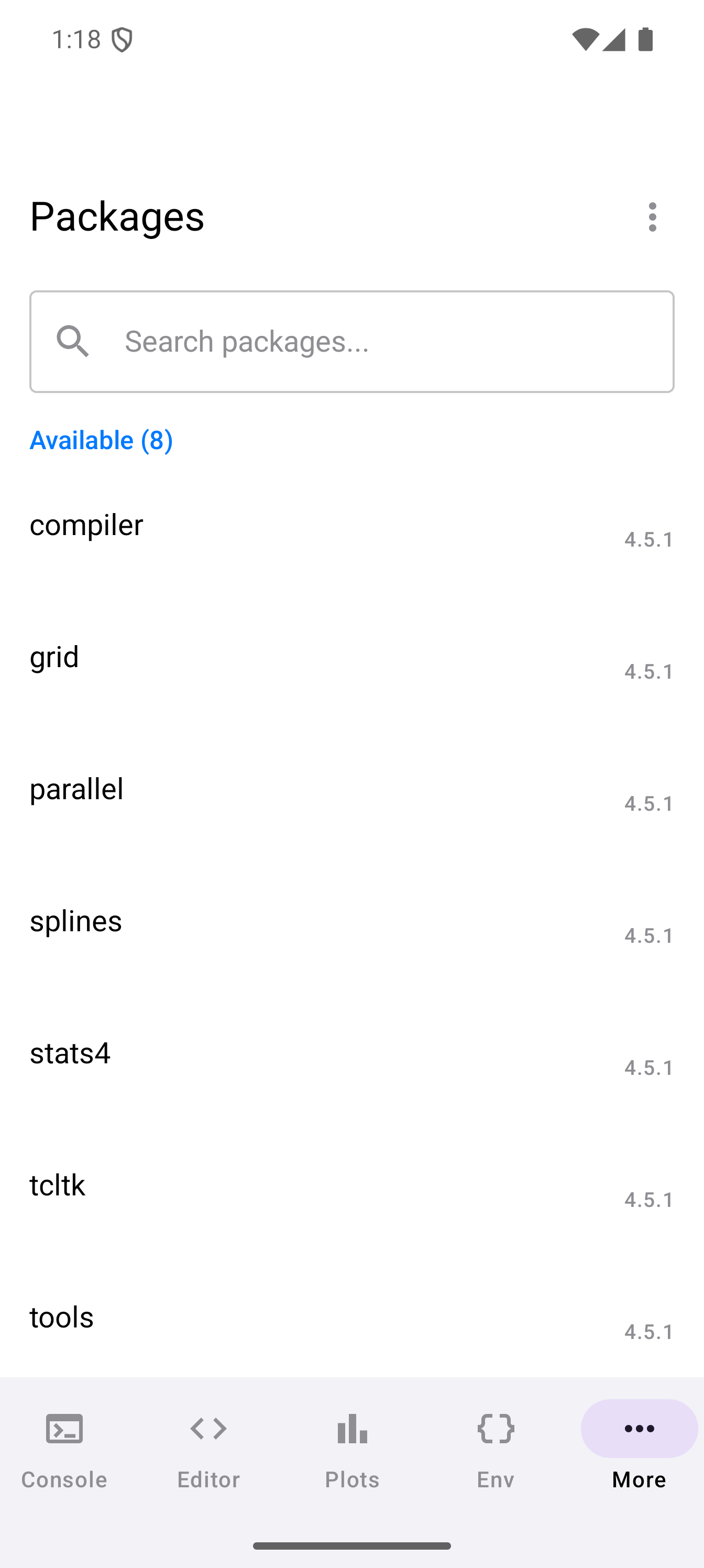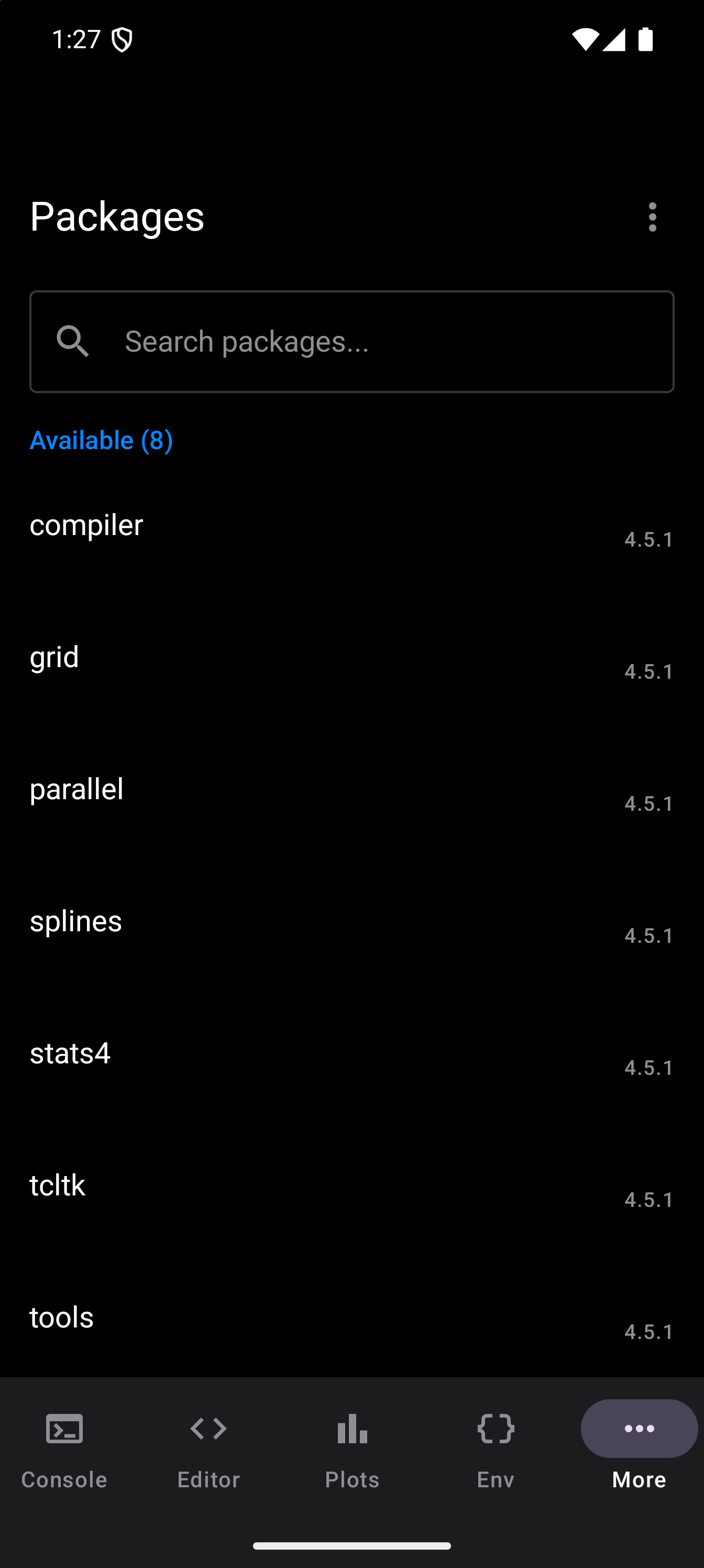 A search bar at the top filters the list as you type. It matches against both the package name and description, so you can search for “plot” to find visualization-related packages or “string” to find text-processing packages.