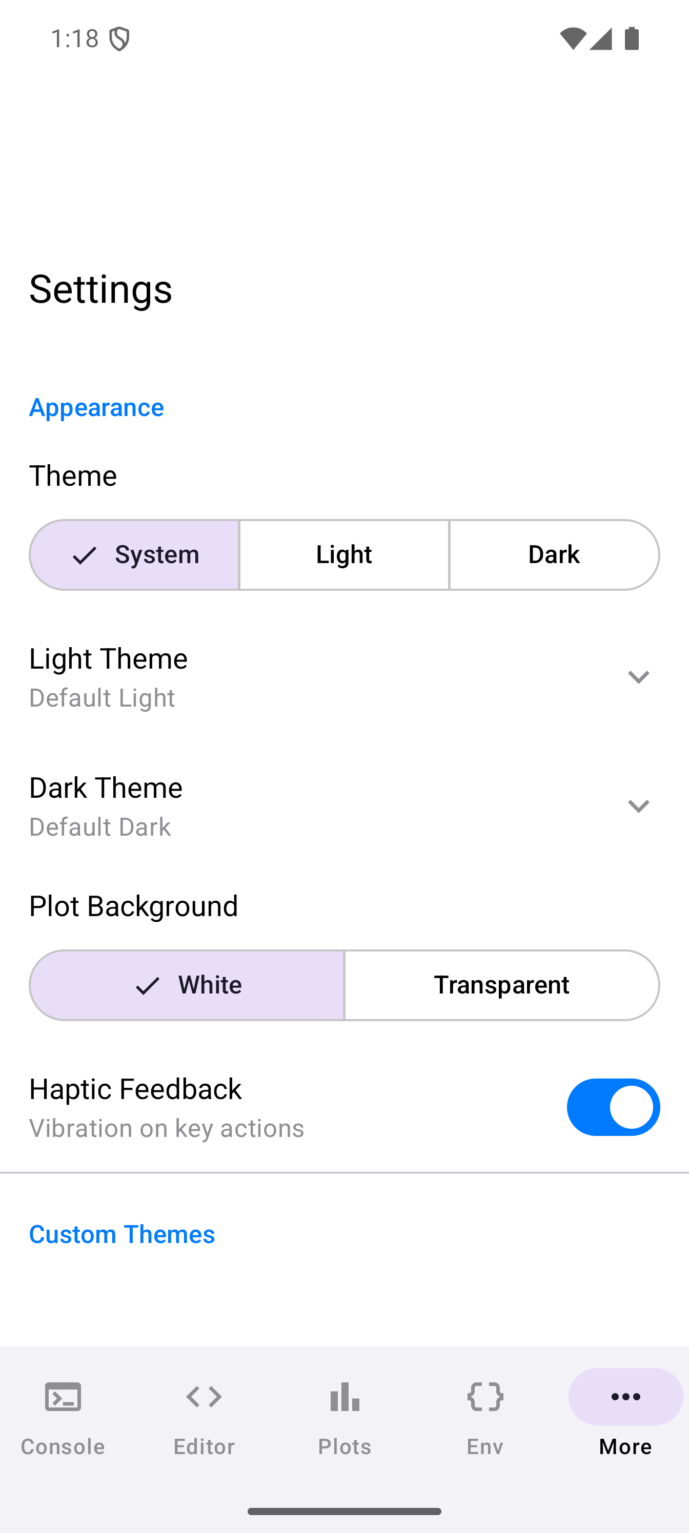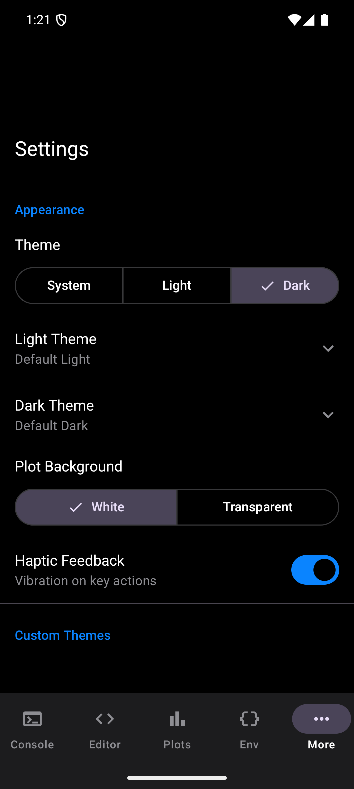 A toggle switch labeled “Vibration on key actions.” When enabled, you get a short vibration when you tap toolbar buttons, run code, or perform other key actions. Turn it off if you prefer a silent experience or if vibrations are distracting.